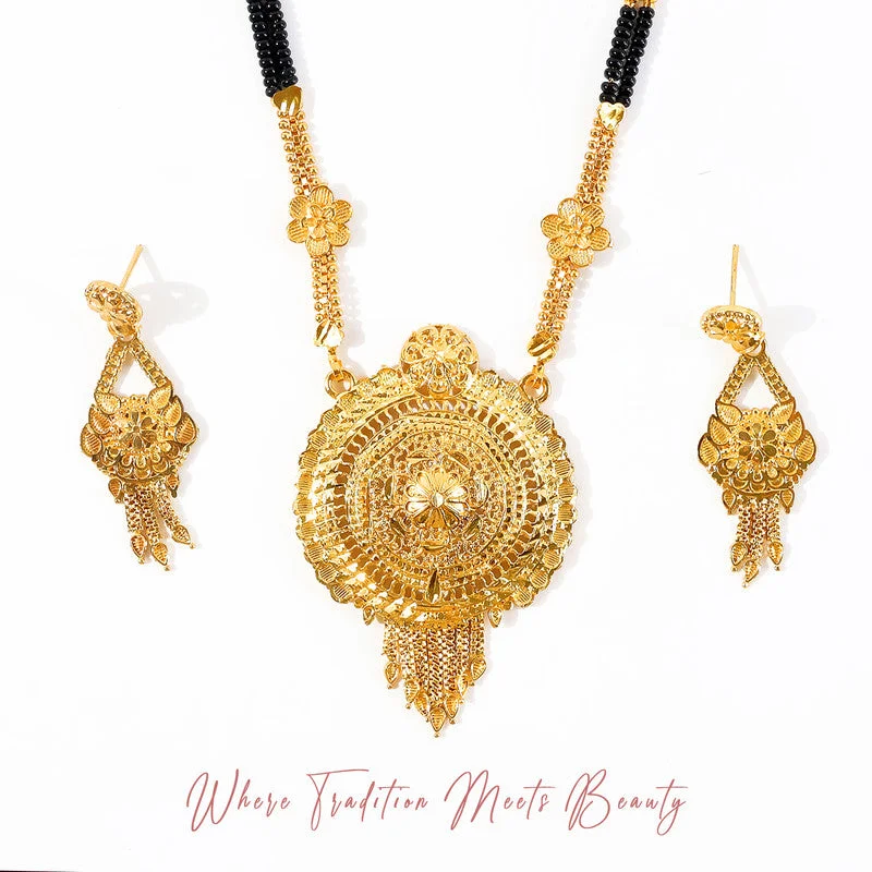 classic round pendant mangalsutra, round pendant mangalsutra set, traditional mangalsutra set, elegant mangalsutra design, mangalsutra with earrings, matching earrings jewellery set, classic mangalsutra jewellery, ethnic mangalsutra set, bridal mangalsutra, daily wear mangalsutra