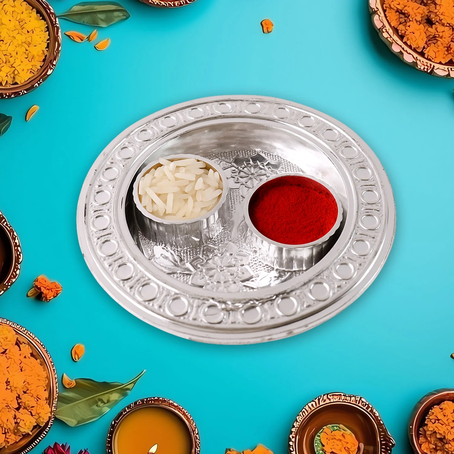- This Stunning Small Decorative Plate Product Serves As A Haldi Kumkum Or A Sindoor / Roli Pot Holder. It Is Used As To Welcome The Guests During Wedding, Engagement Or Festival As A Return Gifts Housewarming, Thambulam, Varalakshmi, Indian Items, Or Any Other Occasions.