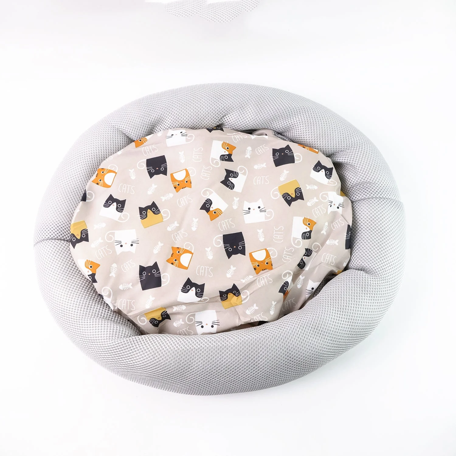 Round Soft Plush Cat Bed with Cartoon Cat Print Cushion – Breathable Mesh Border Pet Sleeping Pad for Cats, Kittens & Small Pets – Lightweight & Cozy Nest Design – 1 Pc