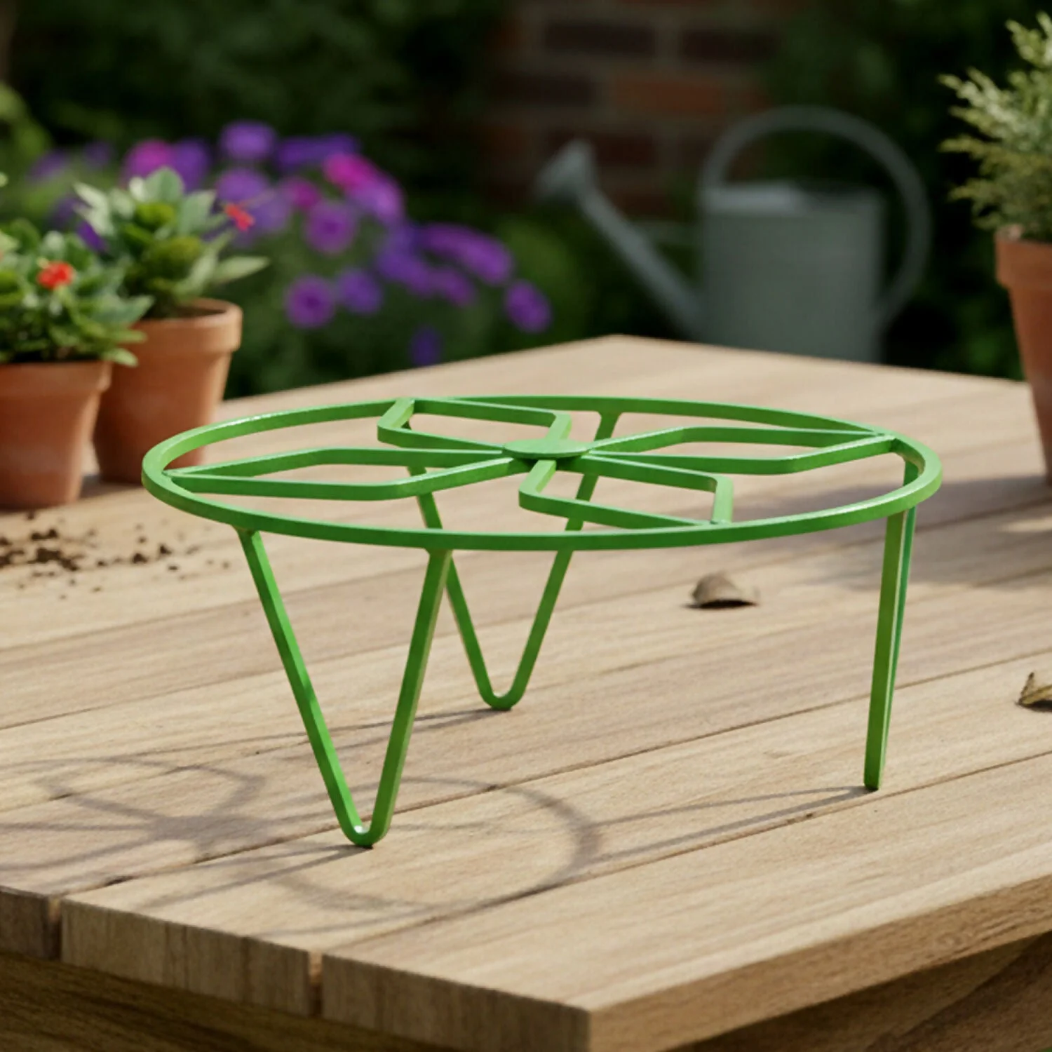 Made from durable iron with a rust-resistant green coating, it is suitable for both indoor and outdoor use. Perfect for living rooms, balconies, patios, gardens, and tabletops, this plant stand adds a neat and elegant look to your plants while providing stable support.
