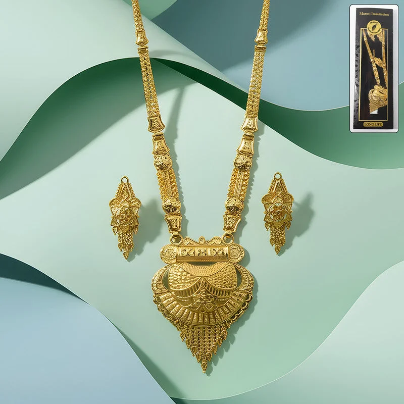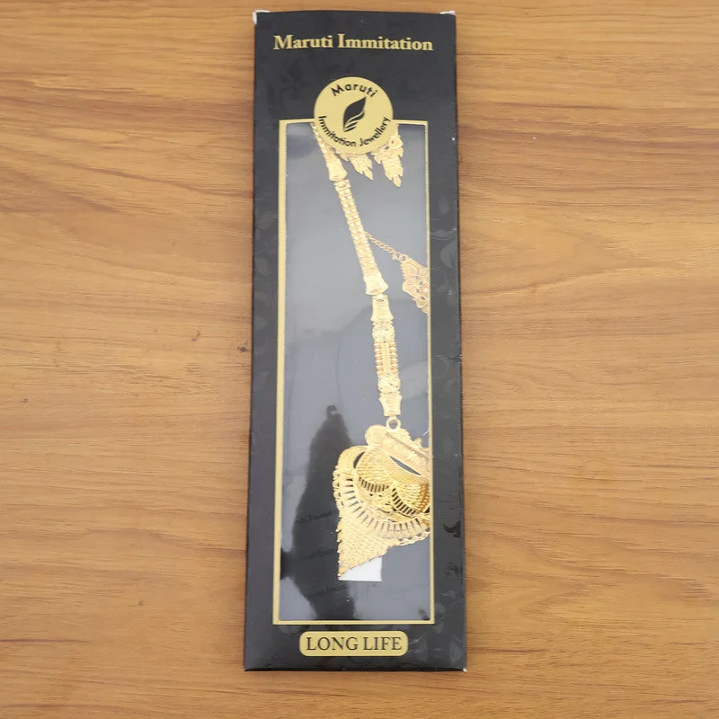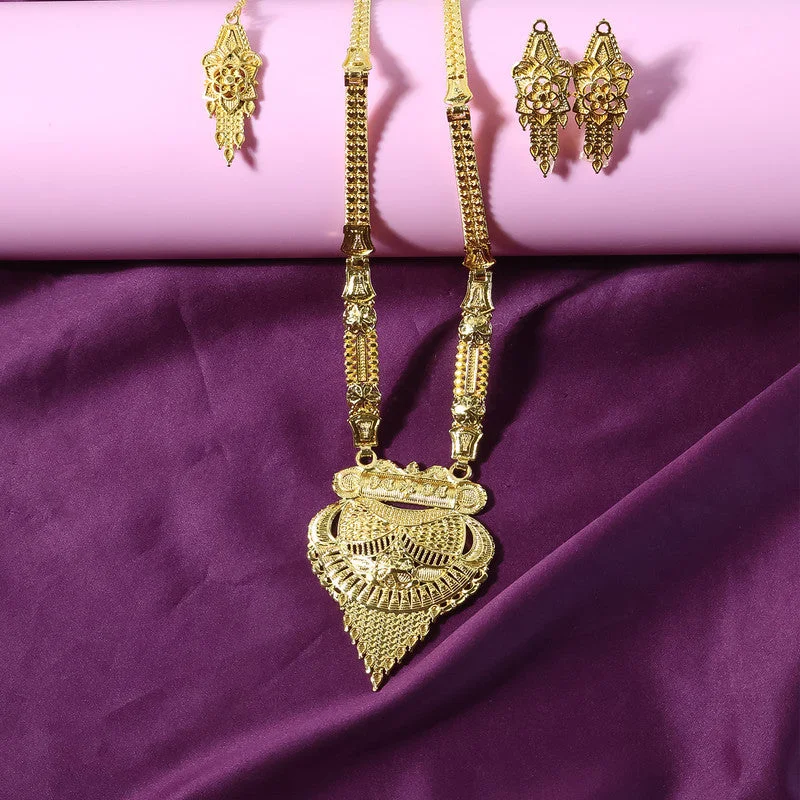 This luxurious necklace set showcases a majestic temple-inspired pendant featuring layered carvings, bold contours, and intricate hand-detailed textures that give it a premium royal finish. The long designer chain is crafted with ornate motifs and traditional beadwork, adding grandeur and richness to the overall look. Complementing earrings enhance the set with matching artistry, making it perfect for bridal styling, festive wear, and cultural celebrations. Its statement pendant, detailed craftsmanship, and antique-inspired aesthetic make it one of the most trending choices for women who love classic, regal jewelry with a modern edge.