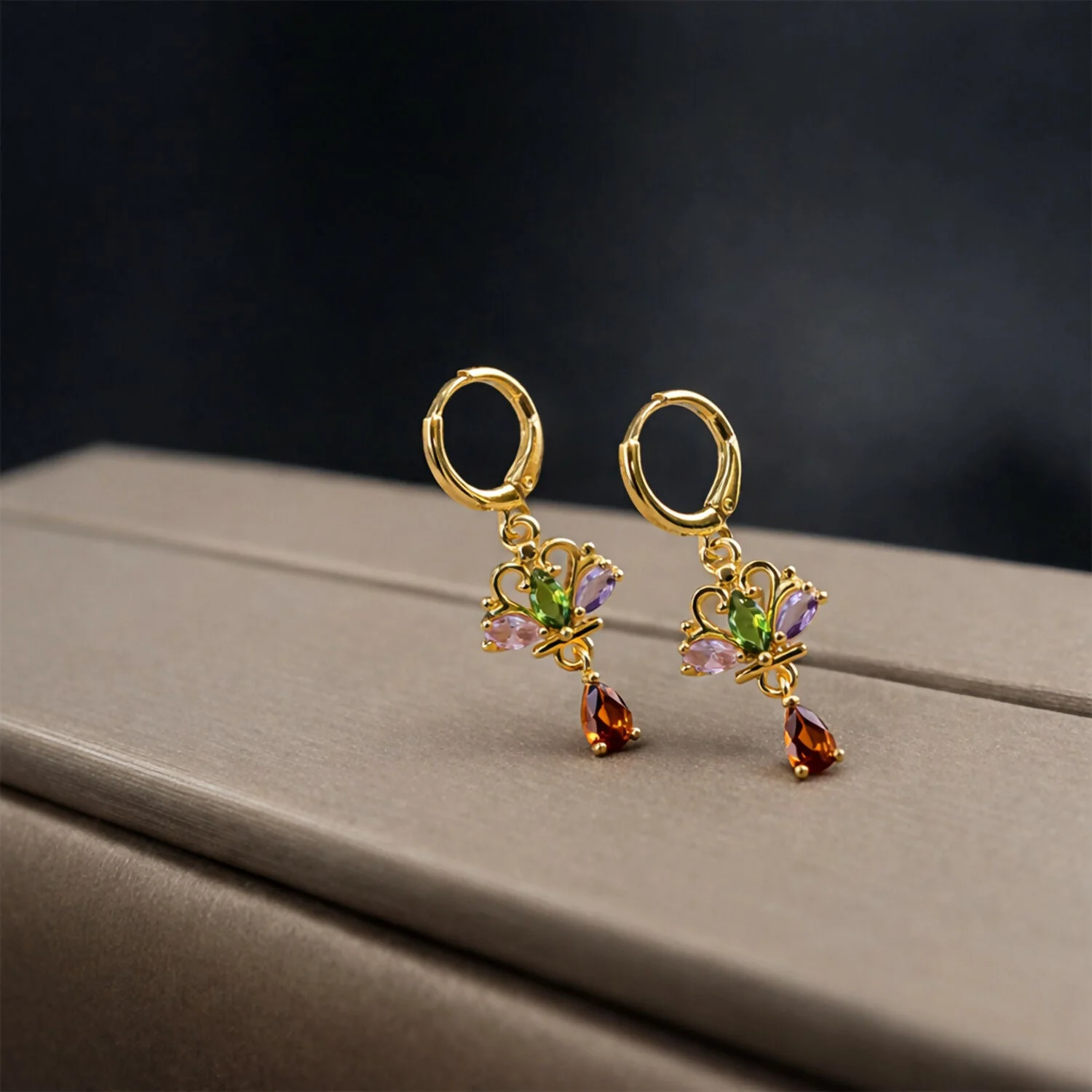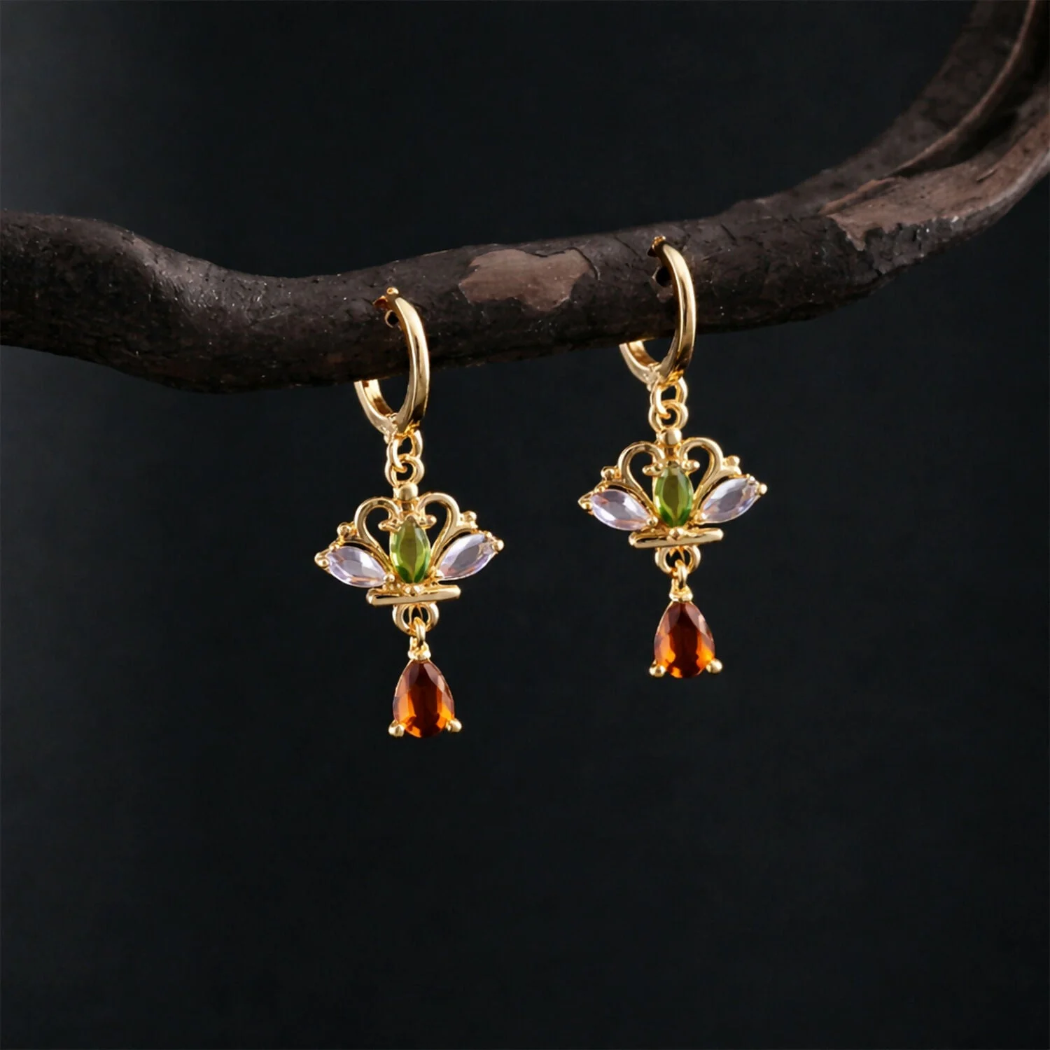 Inspired by regal crown motifs, these stunning multicolor crystal dangle earrings bring a graceful blend of elegance and charm. The design features a beautifully structured floral-crown pattern adorned with green and lavender marquise stones, creating a vibrant and balanced look. Suspended below is a rich amber-toned teardrop crystal that adds depth, movement, and brilliance to the overall design. The polished gold hoop closure ensures a secure and comfortable fit while enhancing the luxurious finish. Perfect for festive occasions, evening gatherings, wedding functions, or adding a royal touch to your outfit, these earrings make a refined and eye-catching accessory.