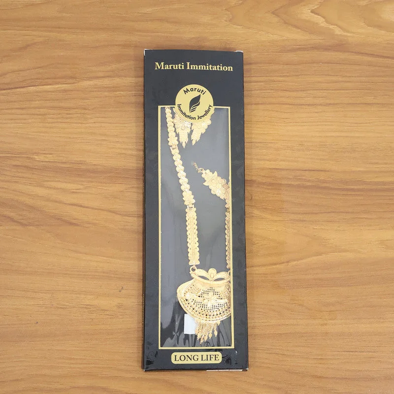 This luxurious gold-plated bridal necklace set showcases intricate craftsmanship inspired by traditional royal jewelry. The bold statement pendant is paired with finely detailed earrings and a beautifully patterned long chain, creating a complete ethnic look. Its radiant golden finish enhances bridal attire, making it a perfect accessory for weddings, engagements, and grand festive celebrations. Designed to stand out, this set adds elegance, charm, and a timeless cultural touch to every special moment.