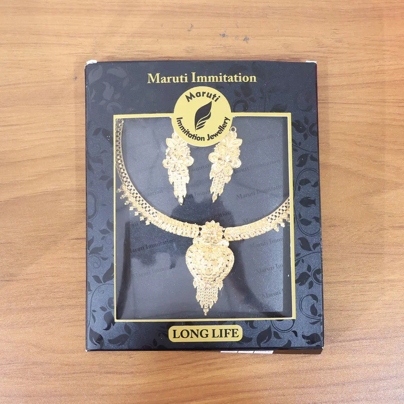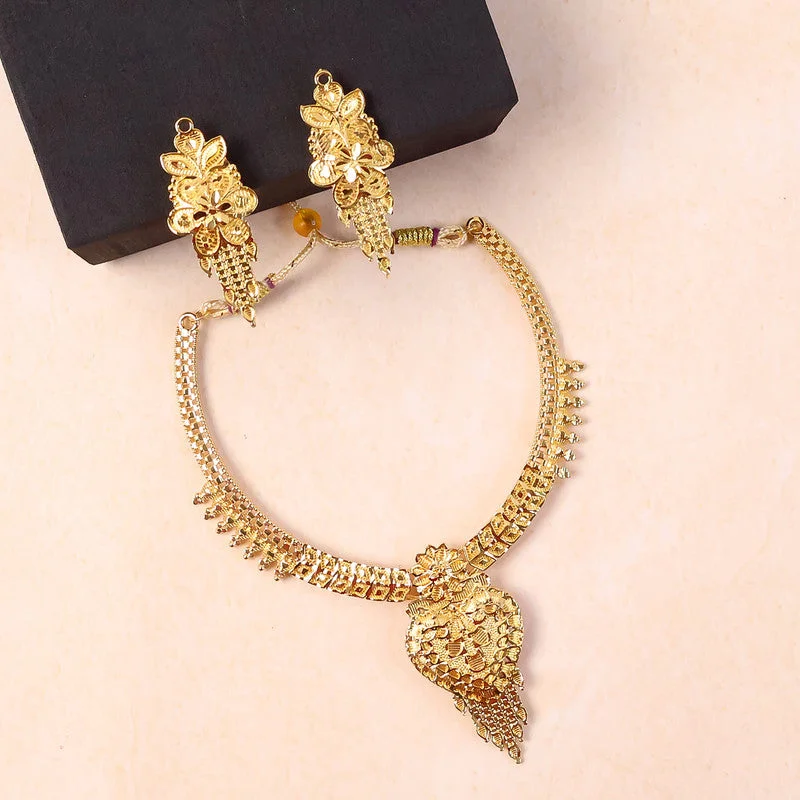 This elegant choker necklace set features a beautifully detailed leaf-inspired pendant that adds a rich and graceful touch to traditional outfits. The choker band is crafted with intricate engraved patterns and fine texturing, giving it a premium and luxurious look. The matching earrings echo the same exquisite craftsmanship, creating a perfectly coordinated and sophisticated ensemble. Ideal for weddings, festive celebrations, and cultural occasions, this jewellery set stands out with its refined finish, eye-catching centerpiece, and timeless ethnic appeal. Perfect for women who love classic jewellery with a bold traditional presence.