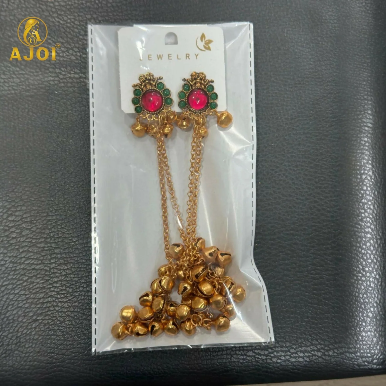 Be the first to review Royal Kashmiri-Inspired Gold-Plated ERuby Pink & Emerald Green Stones, Dual Chain Ghungroo Drops!