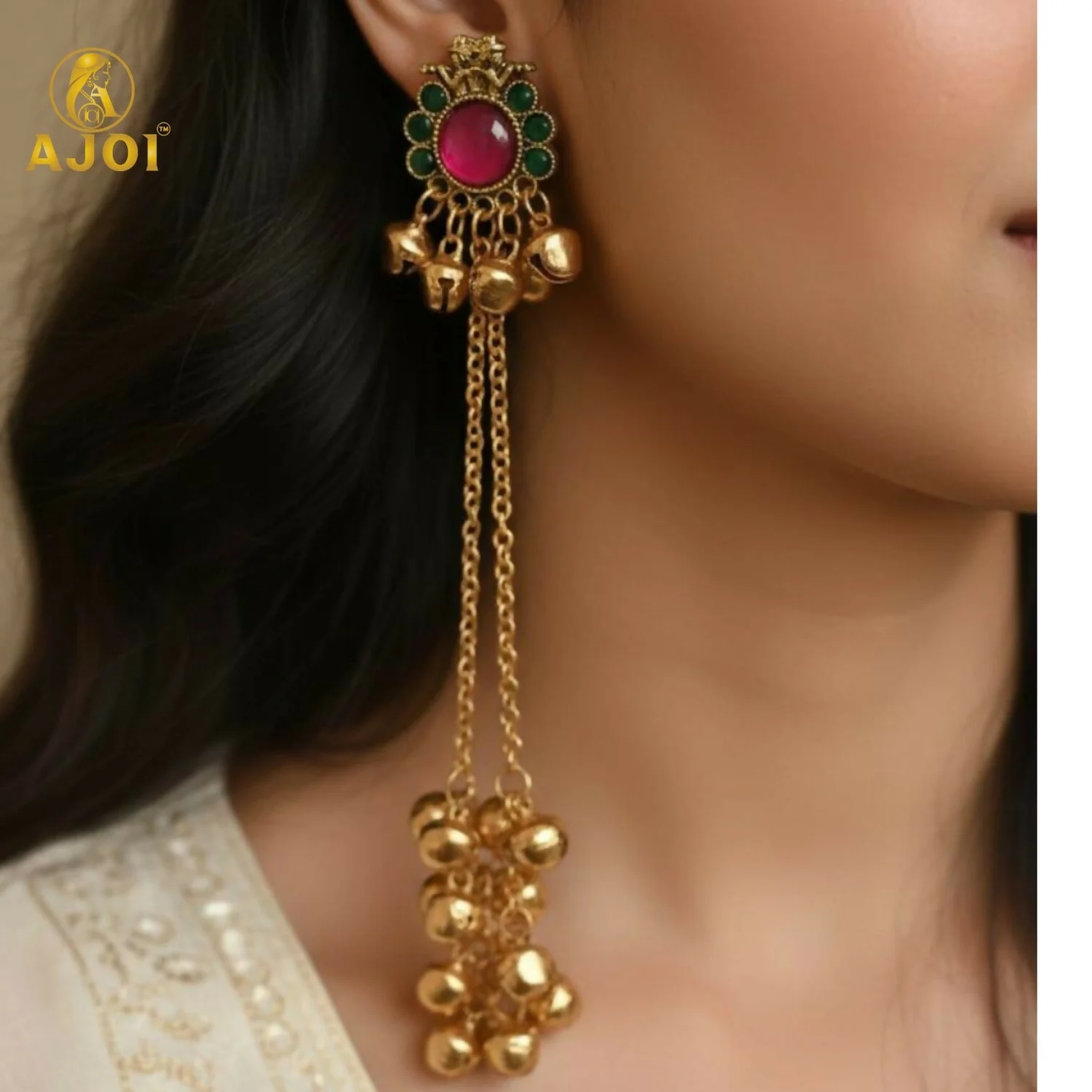 Flowing below the stud are dual fine gold-plated chains that cascade elegantly, ending in clusters of traditional ghungroo bells. These softly polished ghungroo drops add rhythmic movement and a festive charm, enhancing the earrings with every turn and step. The balanced chain length ensures a dramatic yet refined look without feeling heavy.