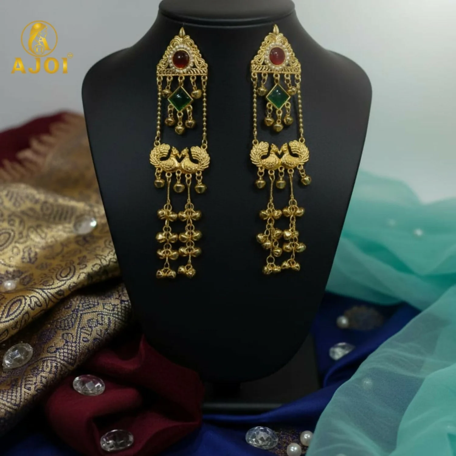 Add a touch of royal heritage to your jewellery collection with these beautiful Kashmiri-inspired antique gold jhumka earrings. Designed with intricate craftsmanship, the earrings feature a majestic peacock motif, symbolizing grace, beauty, and prosperity in traditional Indian culture.