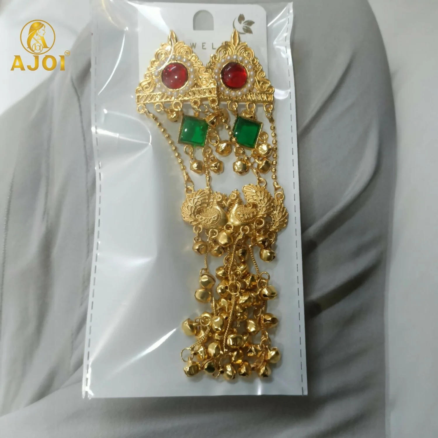 The top portion showcases a rich ruby-red stone surrounded by pearl detailing, followed by elegant hanging chains set with a vibrant emerald-green stone centerpiece. The detailed carvings and layered structure give a true vintage Kashmiri temple jewellery look. The lower section is adorned with finely carved peacocks and delicate ghungroo danglers that create a graceful movement when worn.