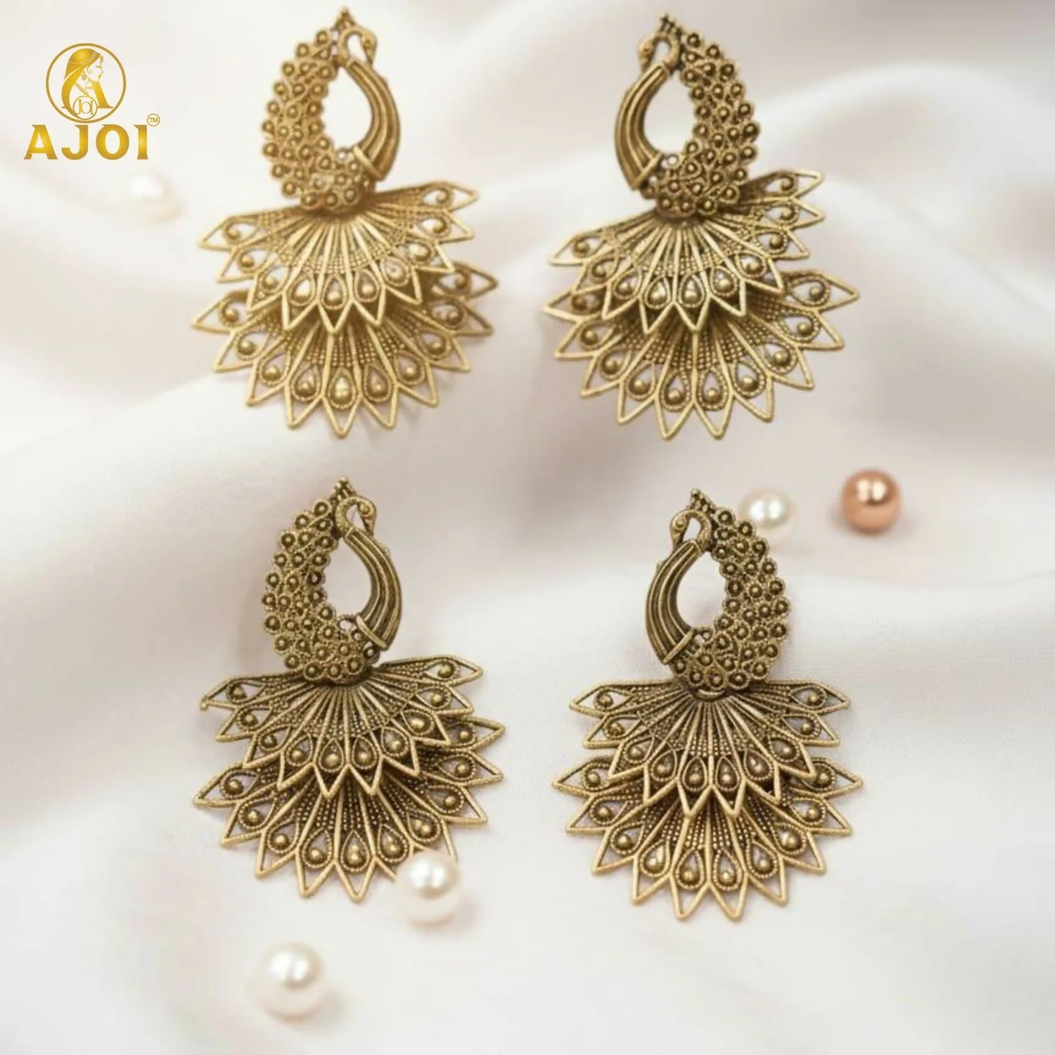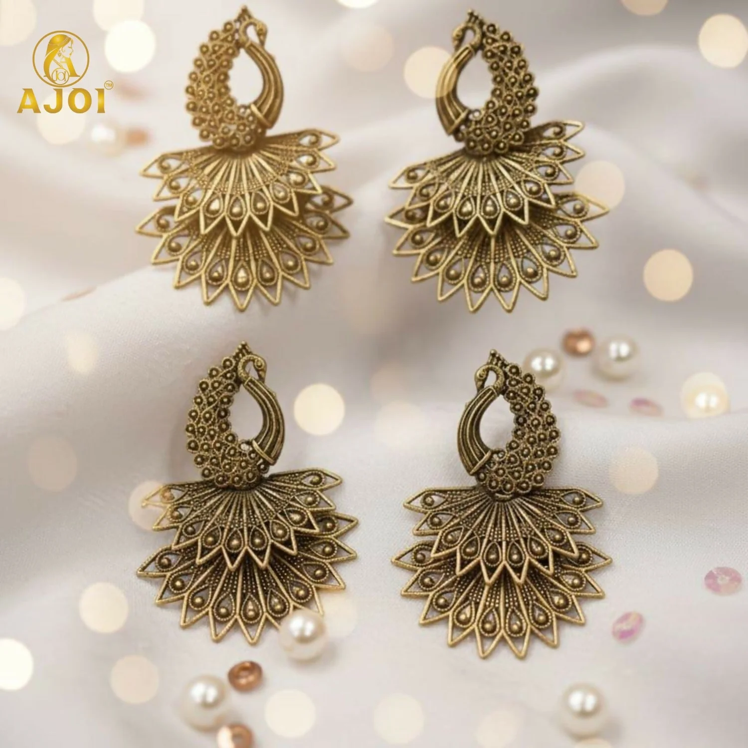 Embrace timeless elegance with this stunning Peacock Earrings Combo, featuring 2 beautifully crafted pairs in a rich antique gold finish. Inspired by the majestic peacock, each pair showcases intricate detailing with layered fan-shaped motifs that reflect traditional Indian craftsmanship.