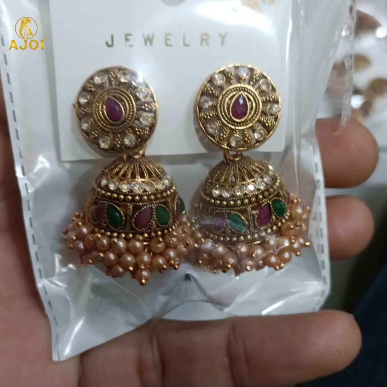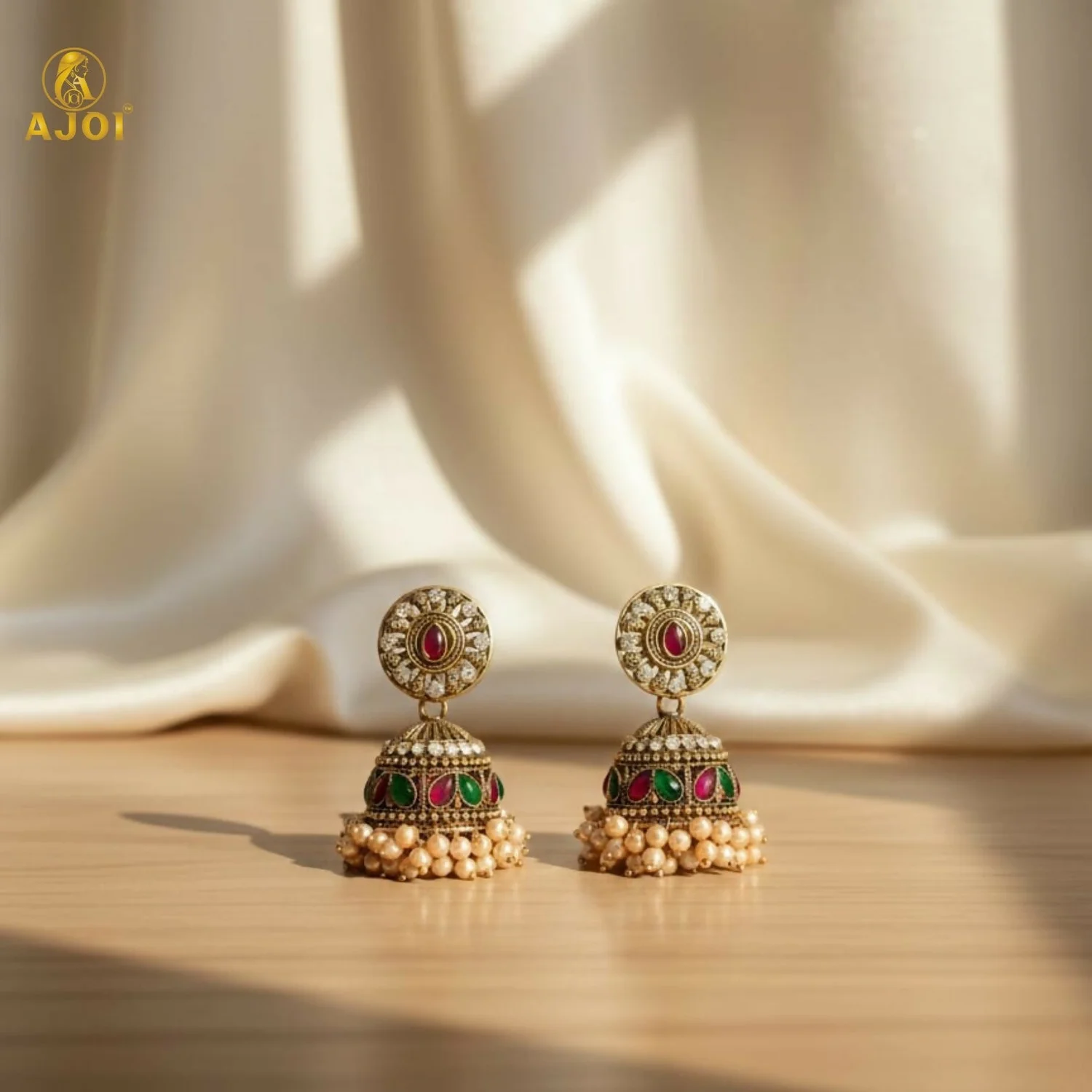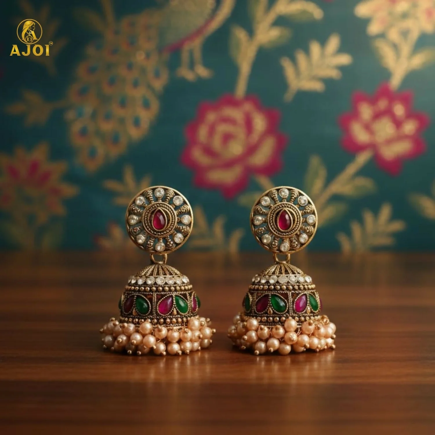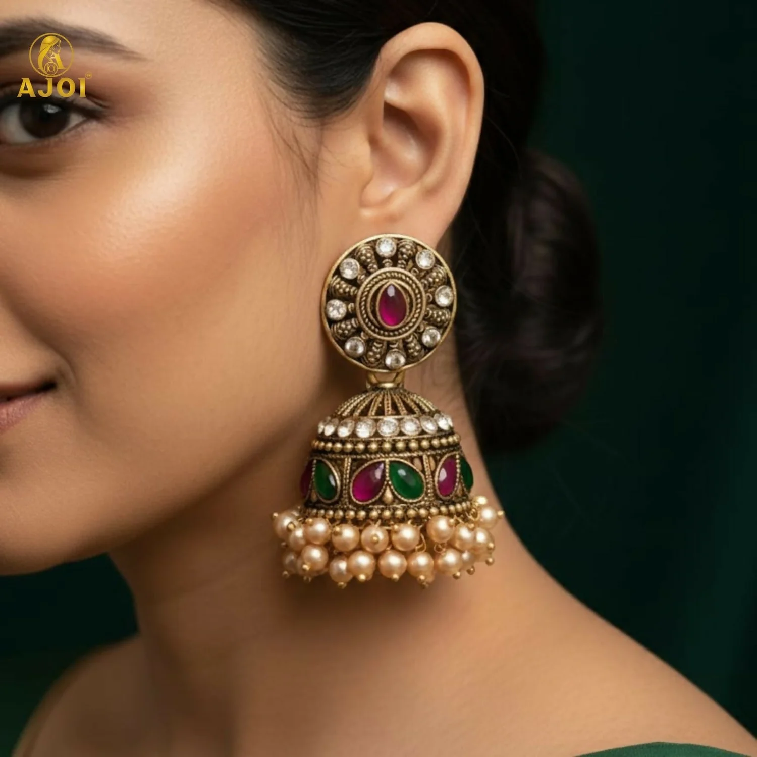 Be the first to review Royal Pearl Drop Antique Gold Jhumka Earrings with Green & Pink Stone Work!
