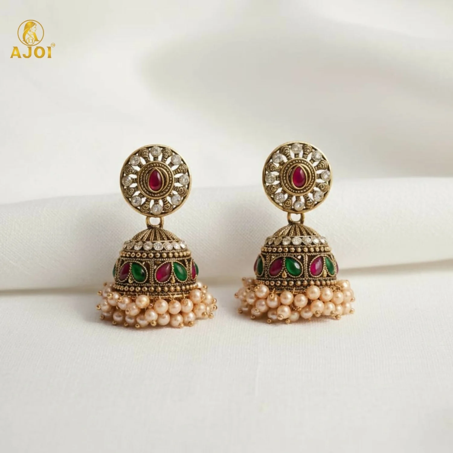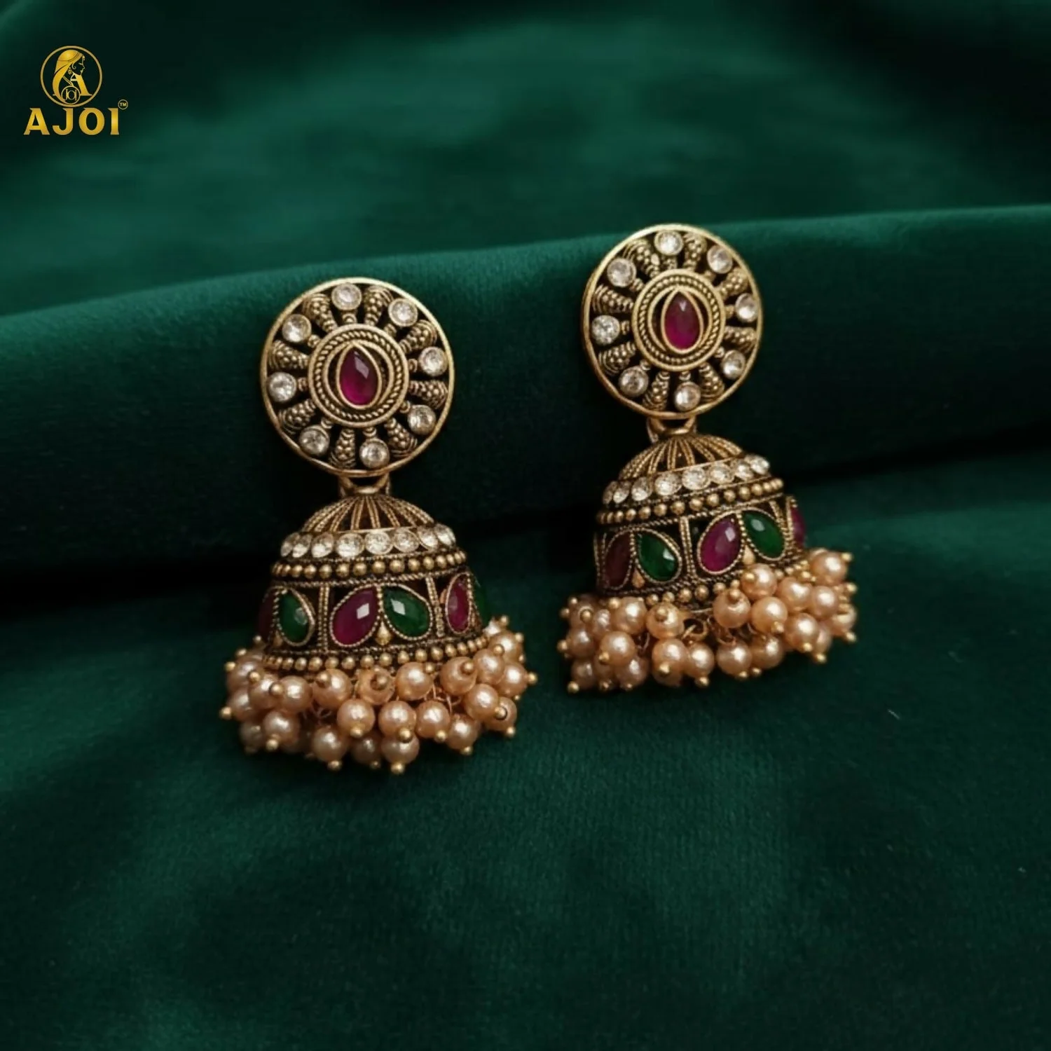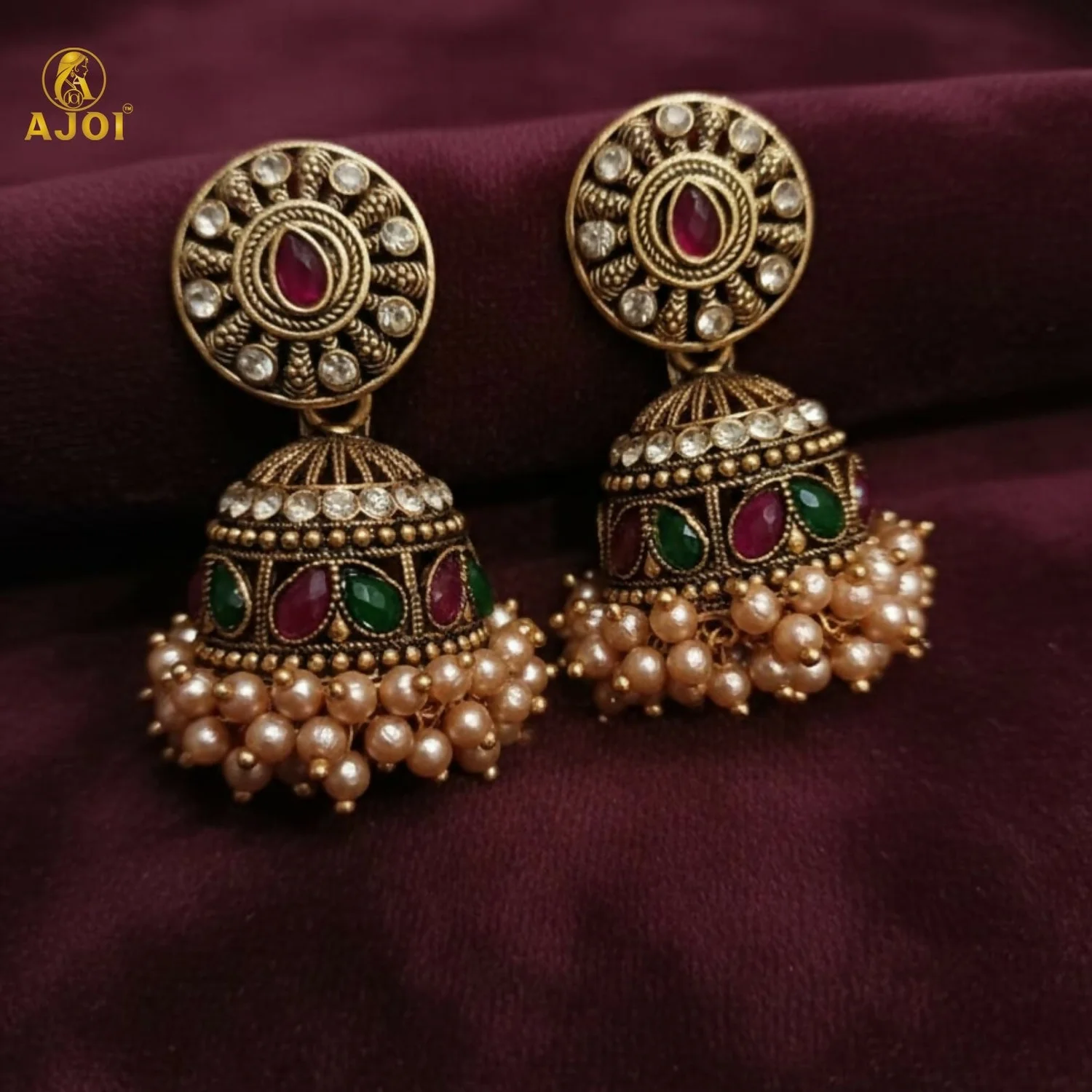 Elevate your traditional look with these beautifully handcrafted antique gold plated jhumka earrings. Featuring an elegant round stud design highlighted with sparkling stones and a rich pink center accent, these earrings flow into a detailed dome-shaped jhumka adorned with vibrant green and pink stone work. The base is finished with soft pearl bead clusters that add graceful movement and a touch of luxury.