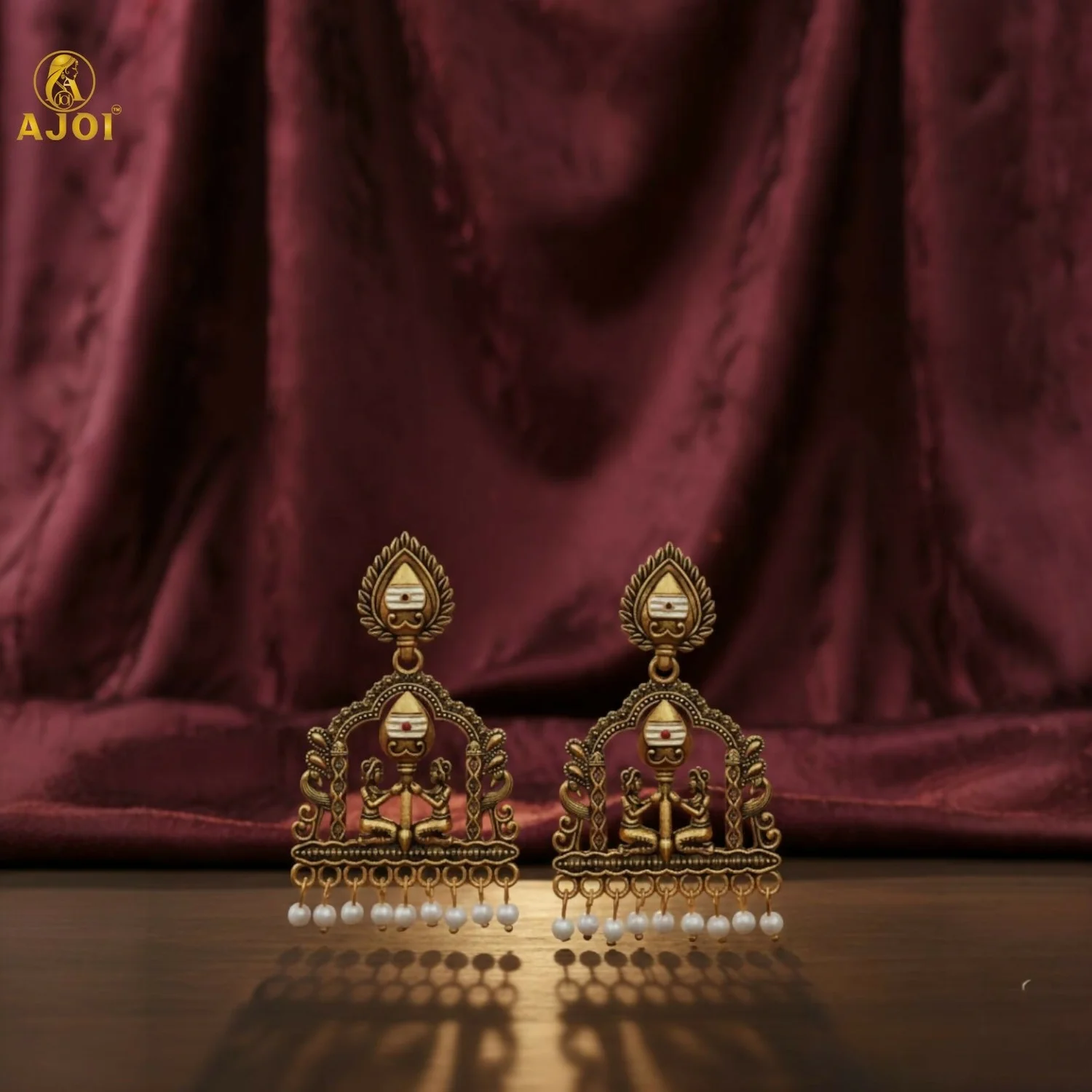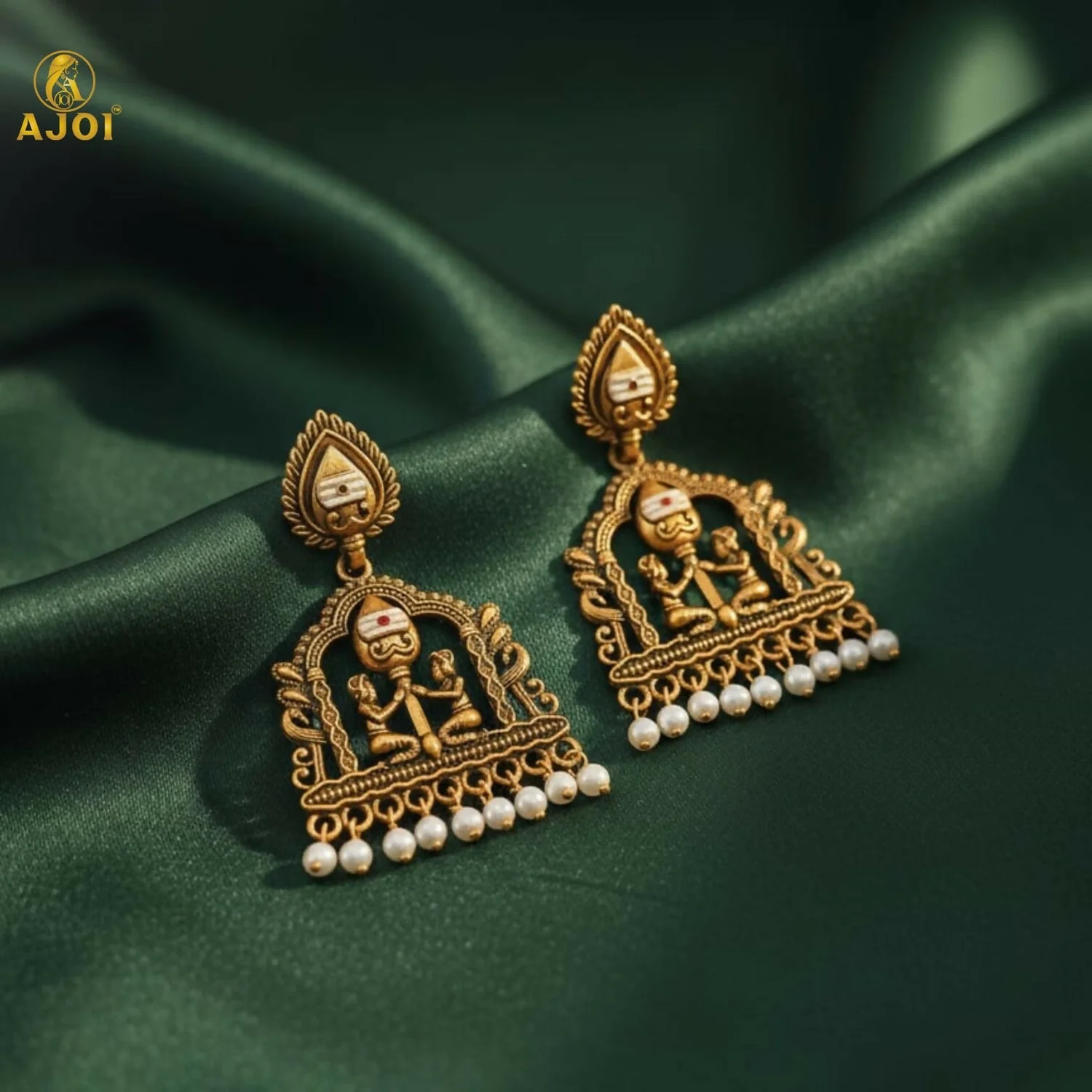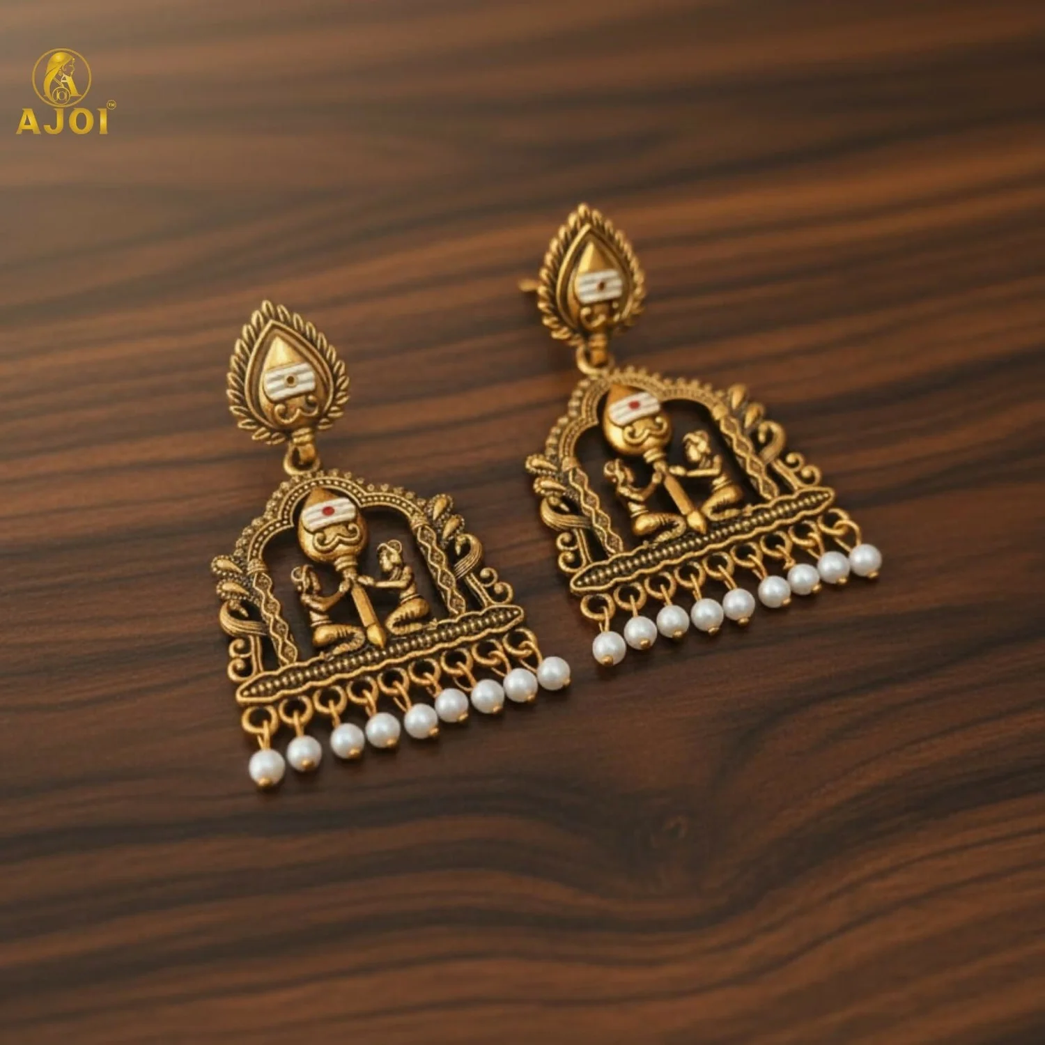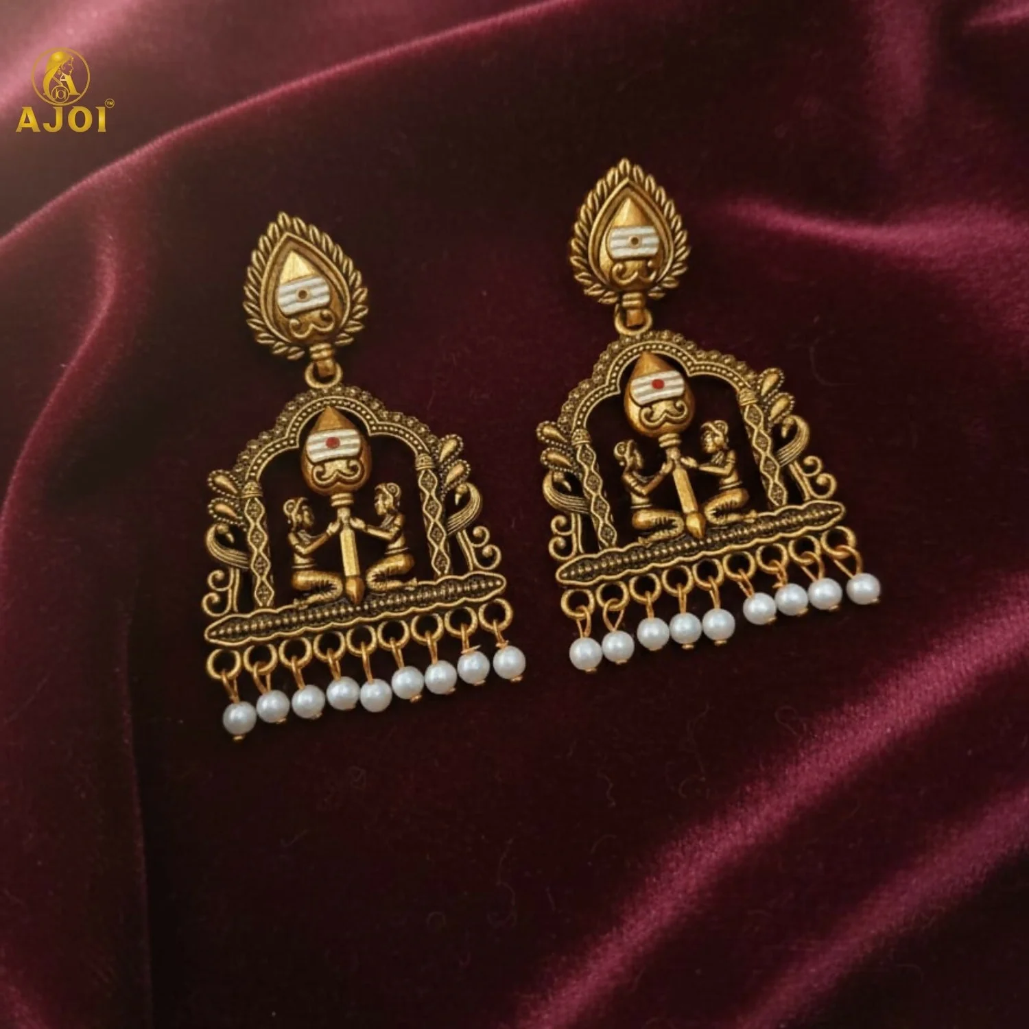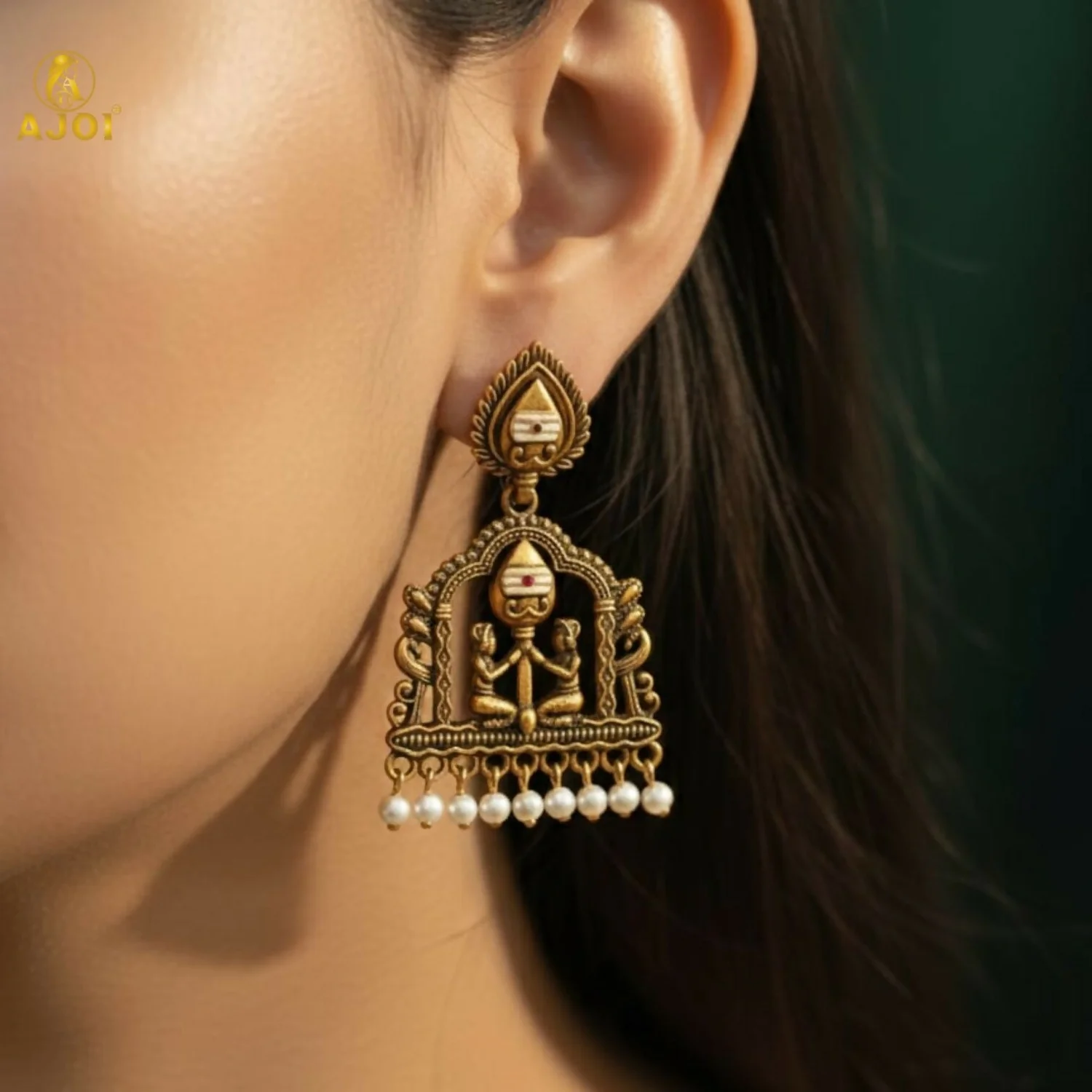 The intricate framework is enhanced with delicate texturing and finished with lustrous pearl danglers that add a graceful, feminine charm. Designed to make a statement, this heirloom-inspired pair perfectly complements bridal ensembles, festive attire, and rich ethnic wear.