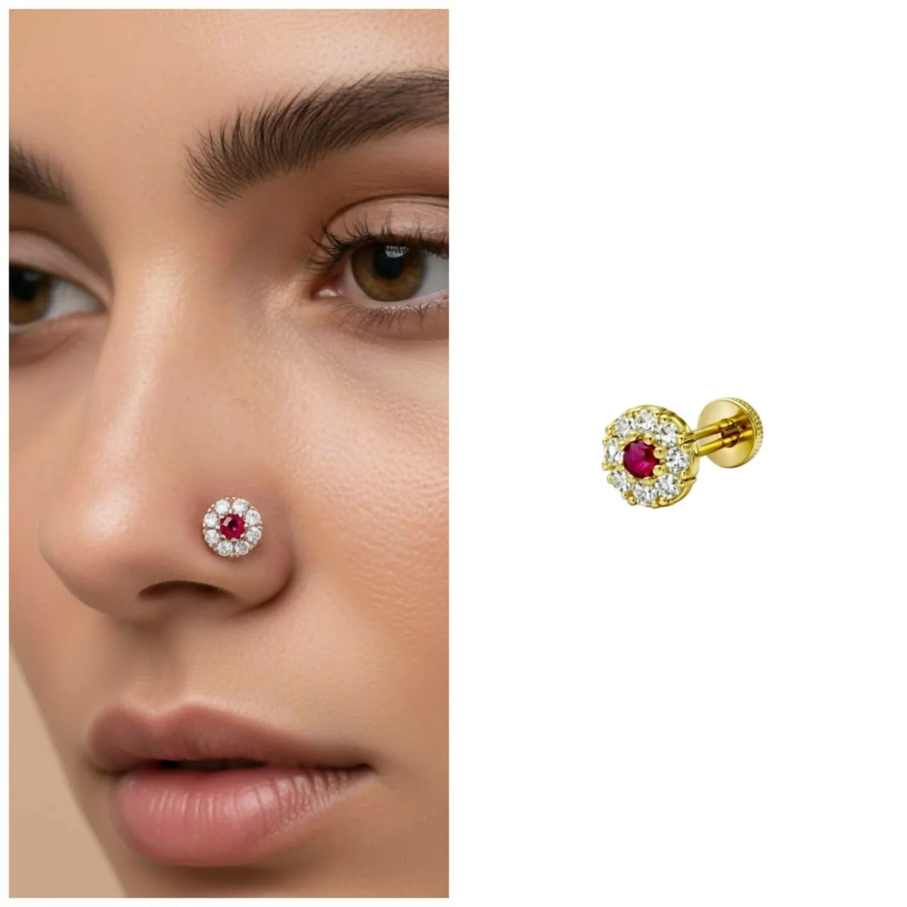 Elevate your everyday style with this exquisite Floral Halo Nose Pin. Designed for those who appreciate timeless elegance, this piece features a vibrant, lab-grown red ruby center, encircled by a shimmering halo of brilliant white stones.