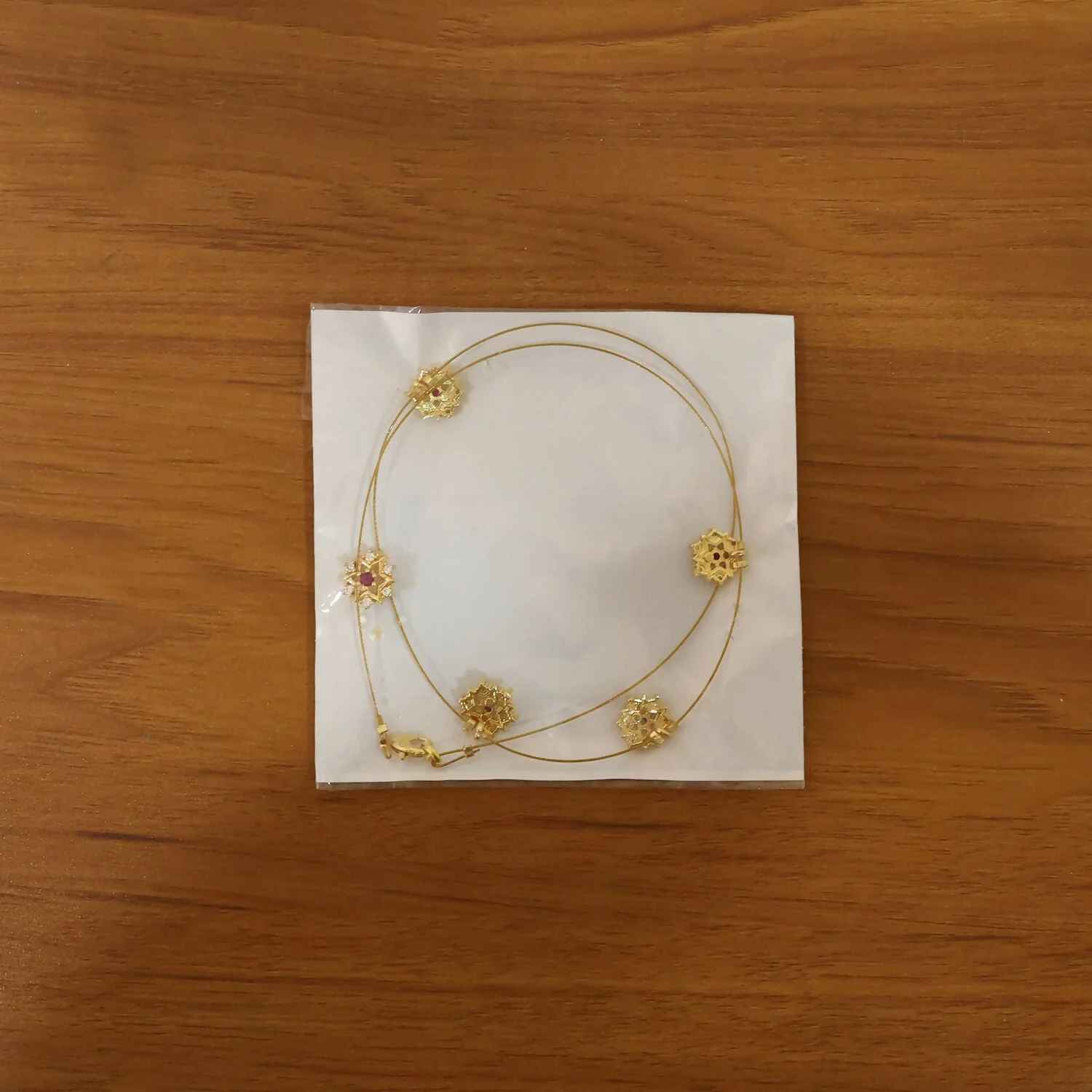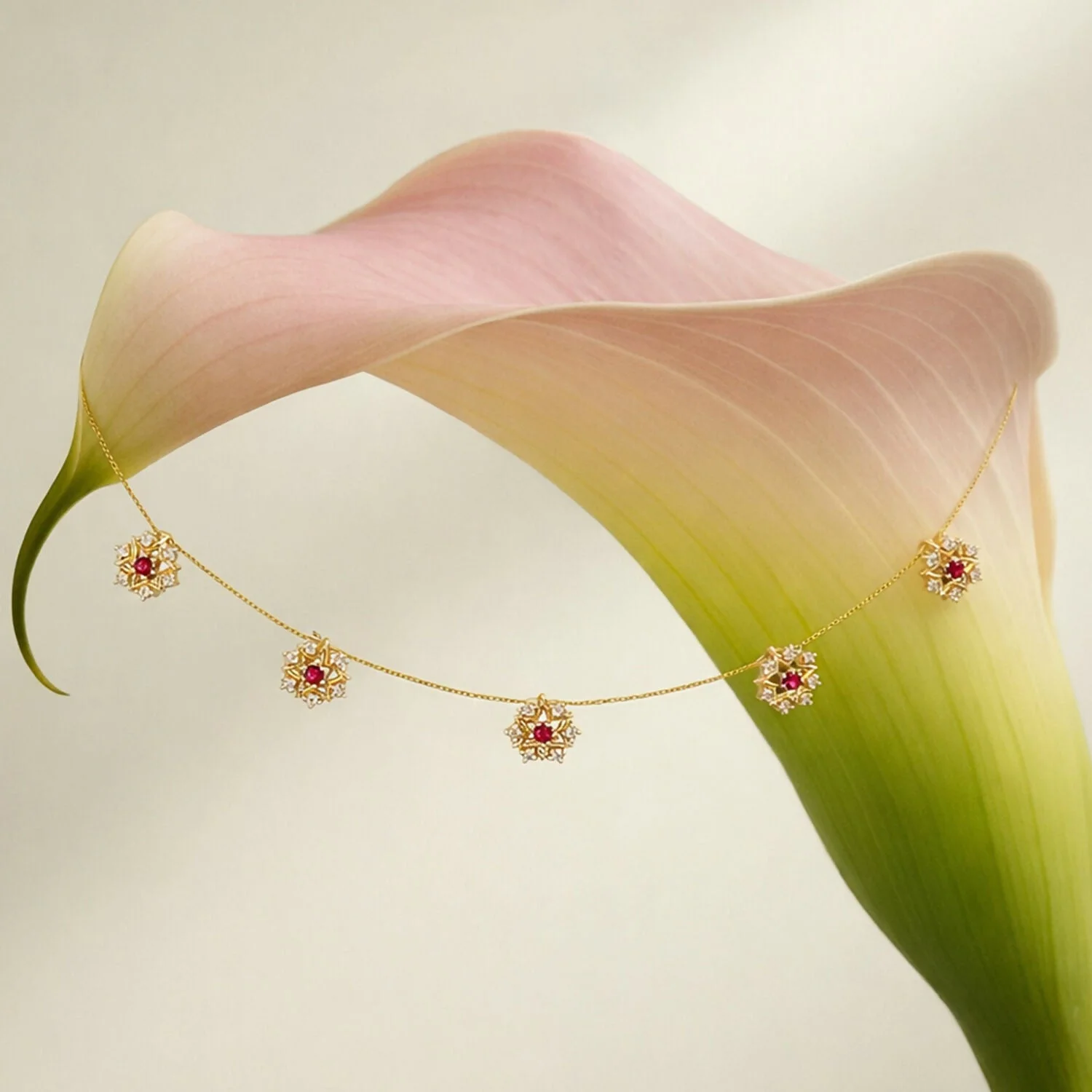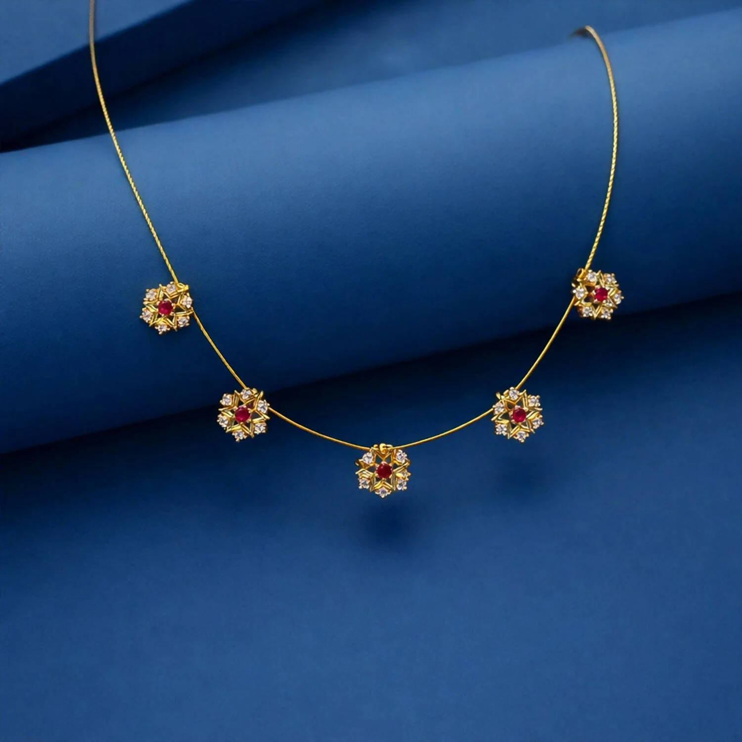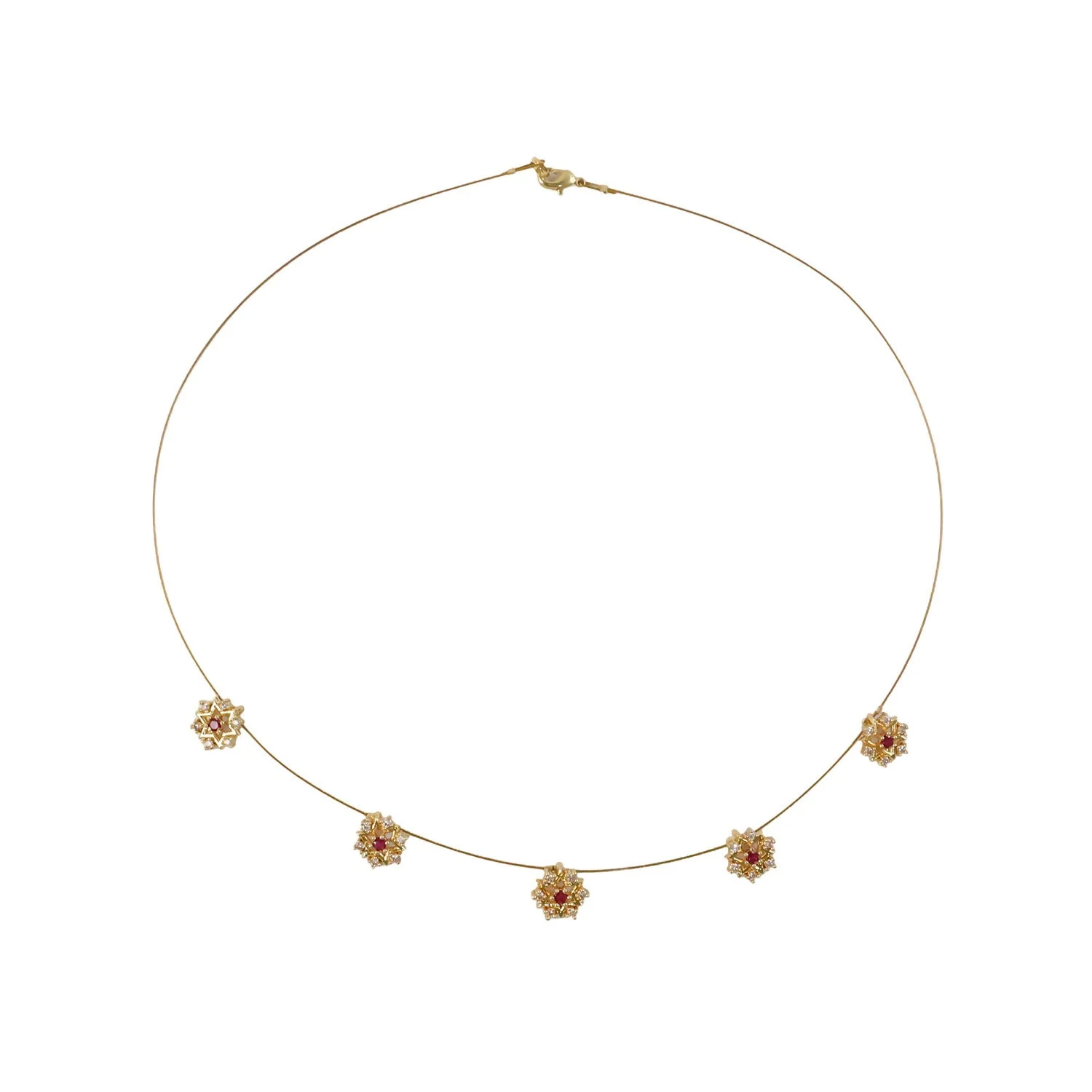 This elegant necklace features a delicate gold chain adorned with five evenly spaced floral motifs. Each motif is intricately designed in a starburst pattern, combining fine gold detailing with sparkling white stones that enhance its brilliance. At the center of every flower sits a striking red gemstone, adding a rich pop of color and a touch of traditional charm.
