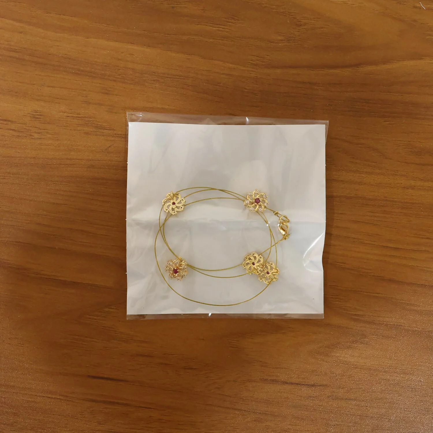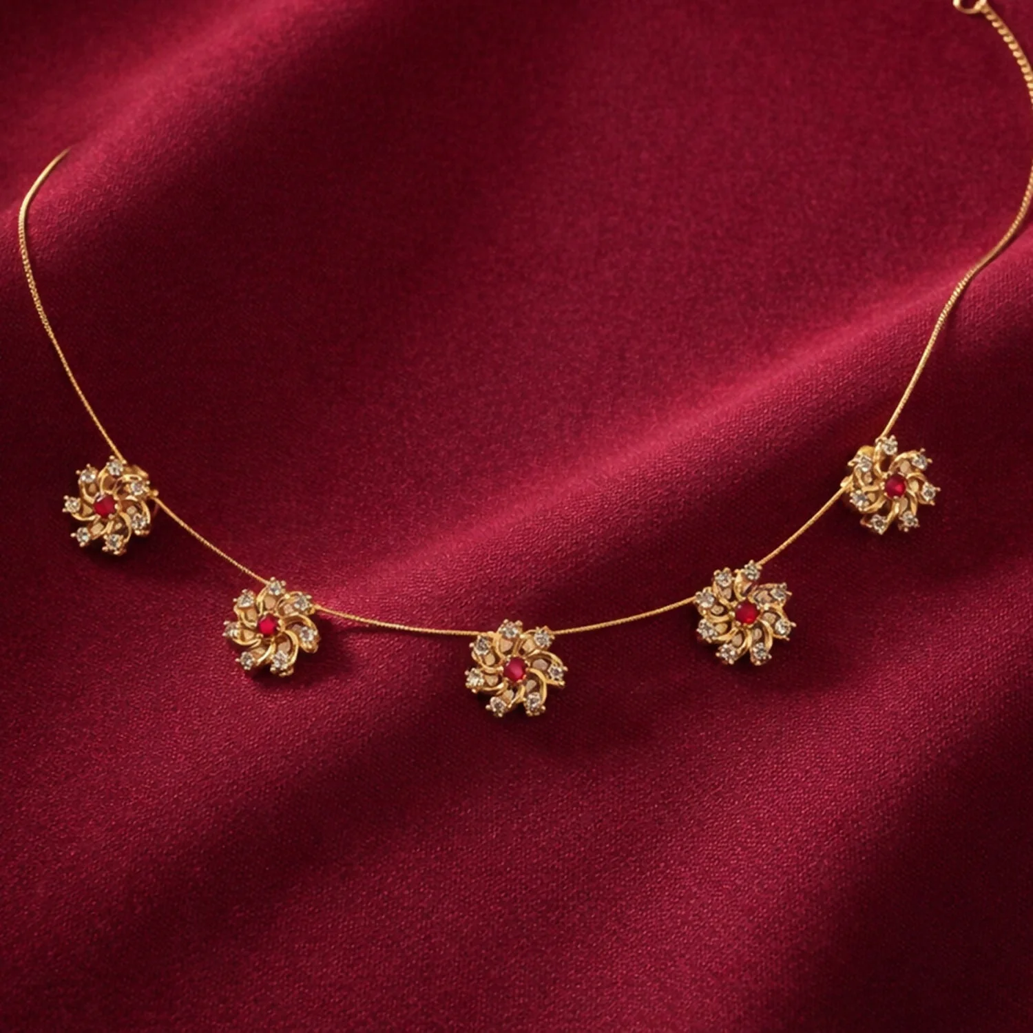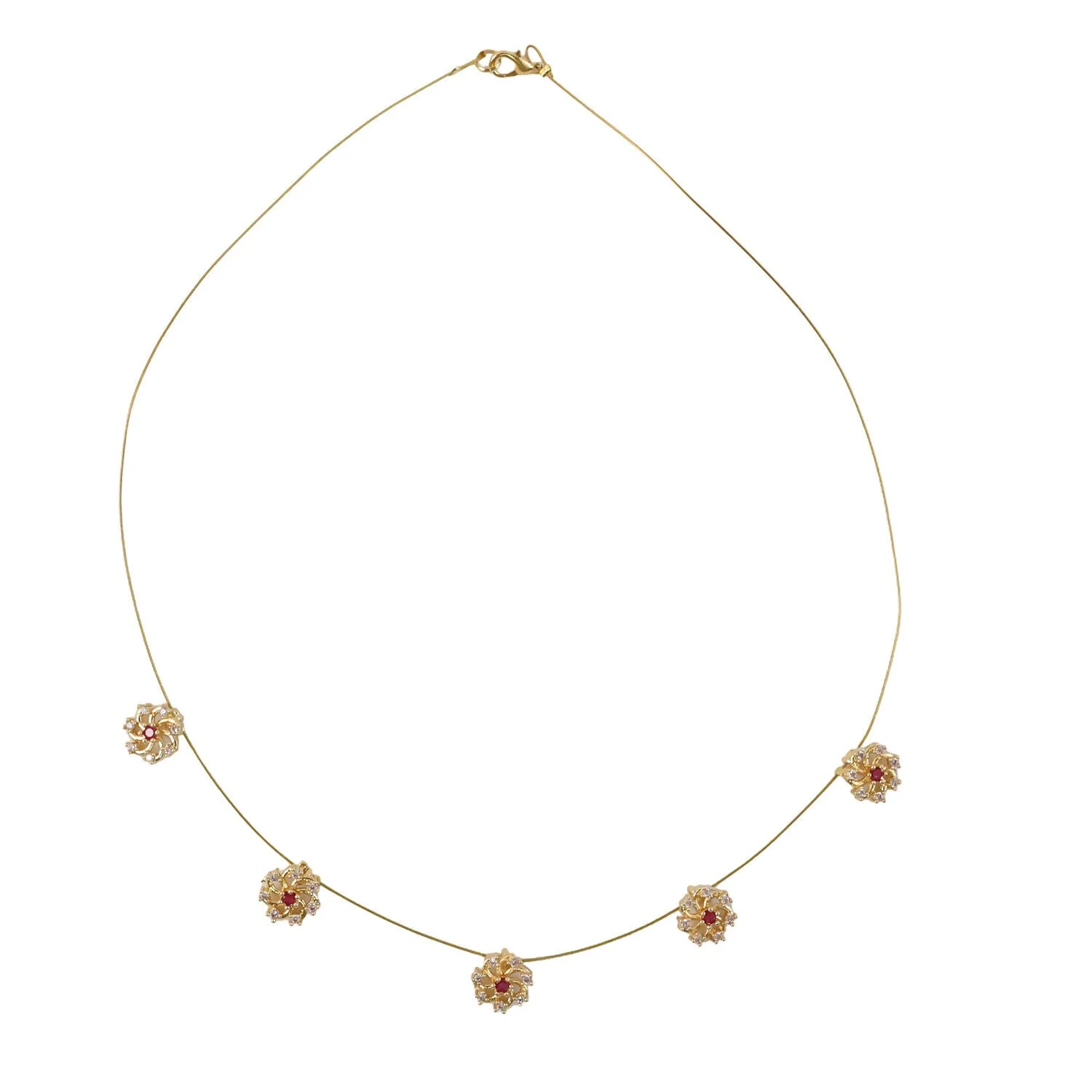This delicate necklace features a graceful arrangement of small, intricately designed floral motifs spaced evenly along a fine, lightweight chain. Each flower showcases a radiant gold-tone finish, beautifully accented with shimmering white stones and a rich red centerpiece that adds a touch of classic elegance.
