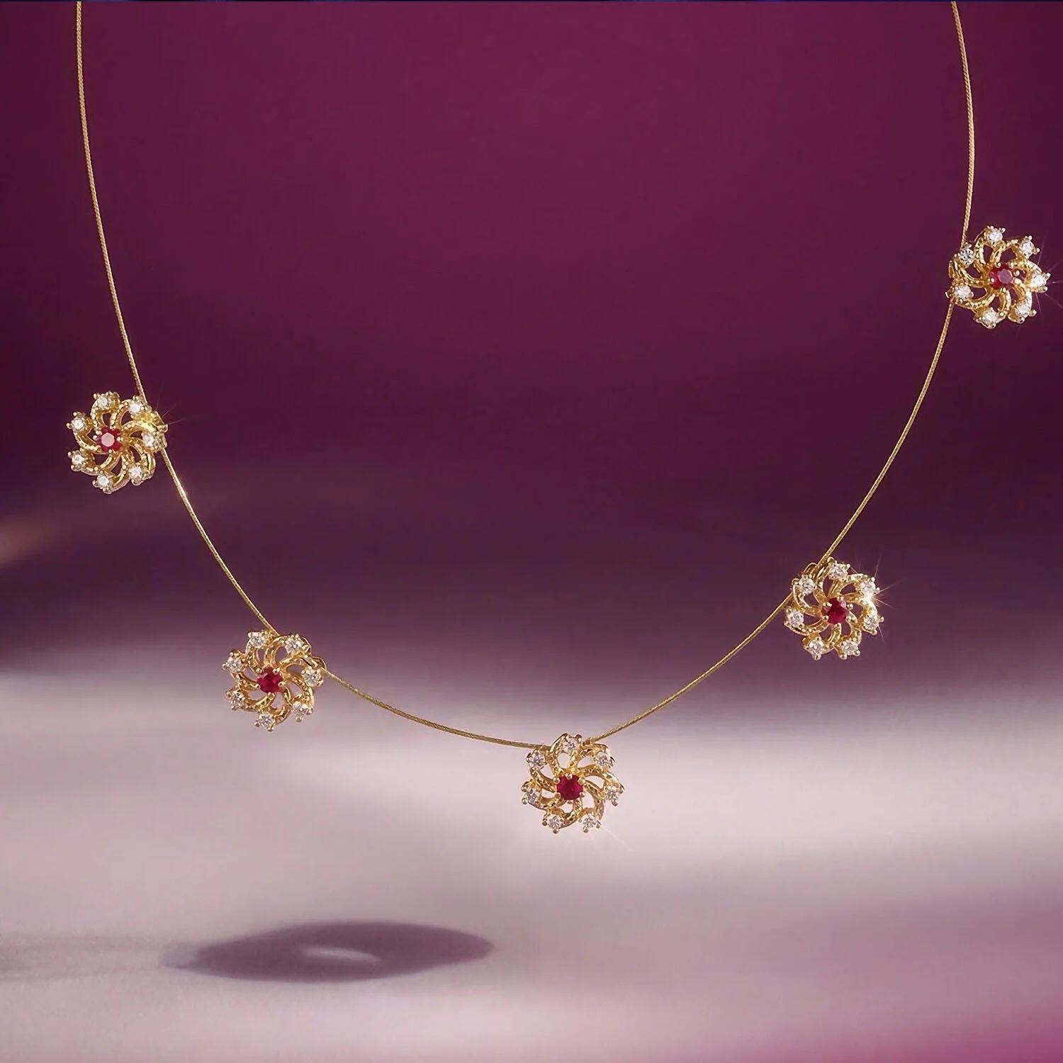 Be the first to review Ruby Floral Station Necklace with Diamond Detailing and Elegant Gold Chain Design!