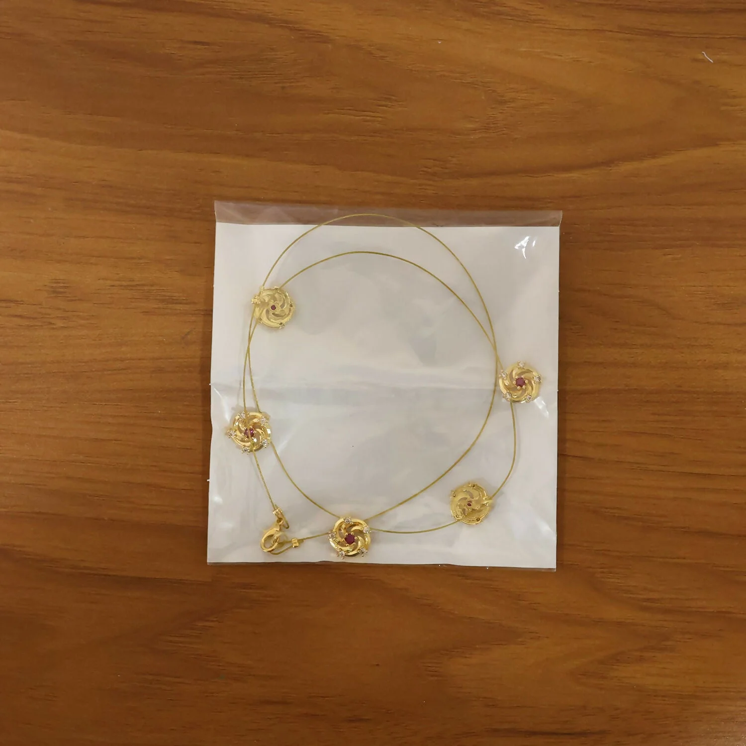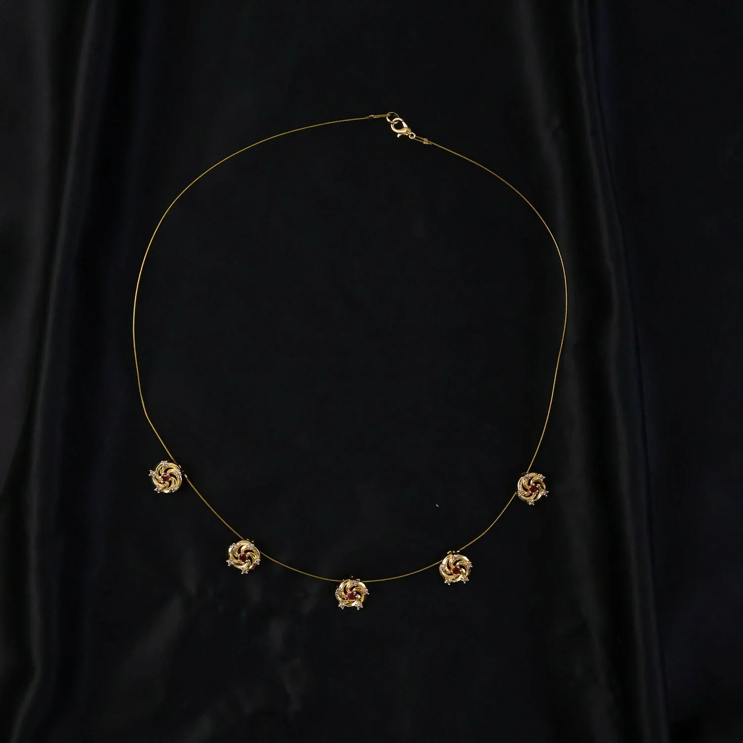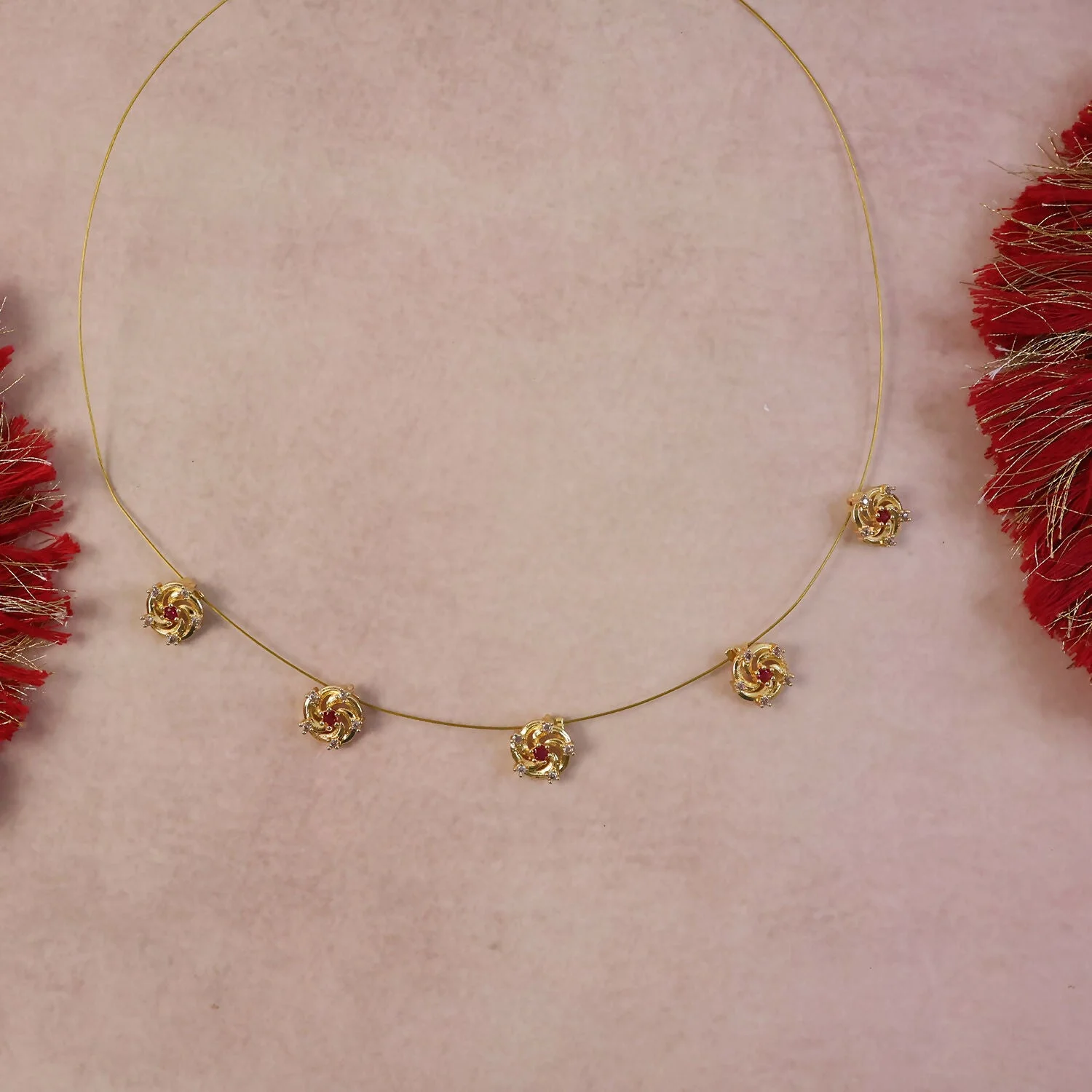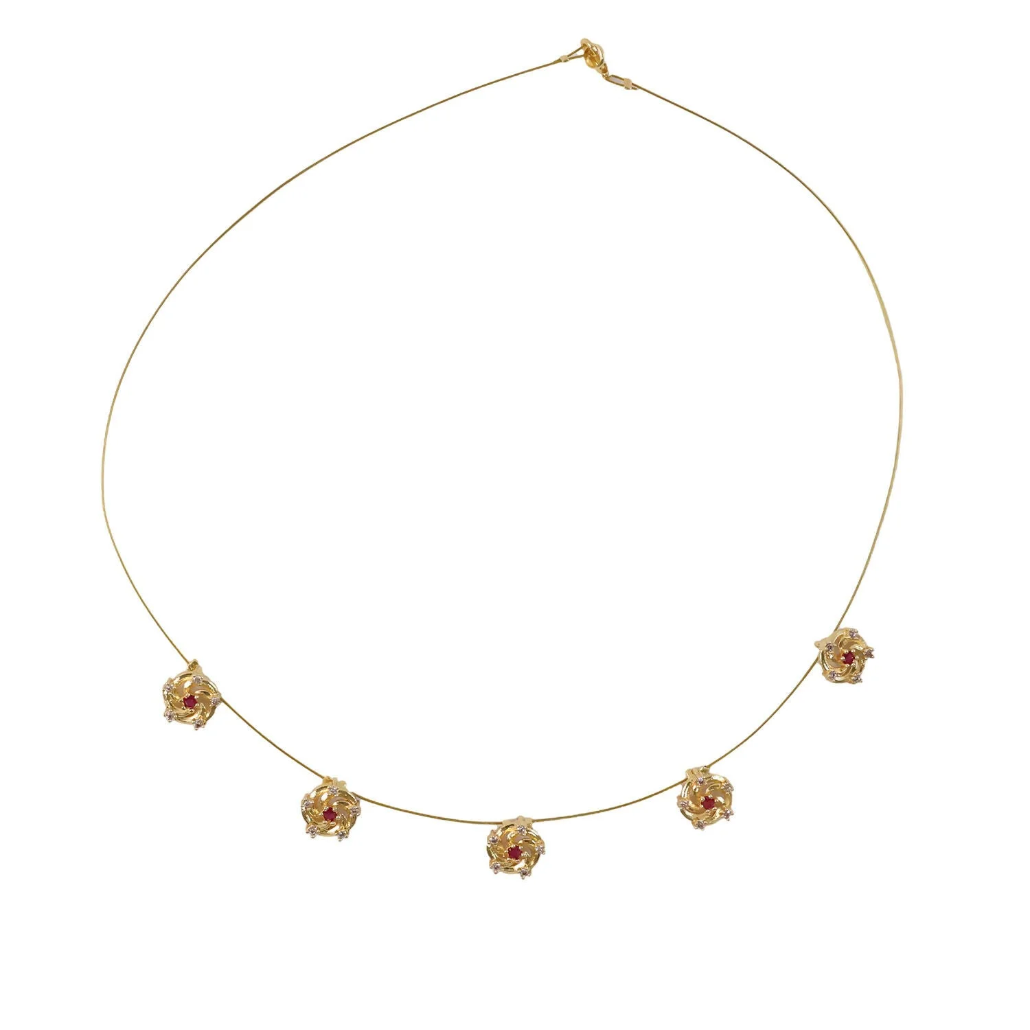 Add a touch of graceful sophistication to your jewelry collection with this beautifully crafted gold necklace. Designed with a delicate chain, it features a series of finely detailed floral motifs, each centered with a subtle red accent that enhances its charm and elegance.