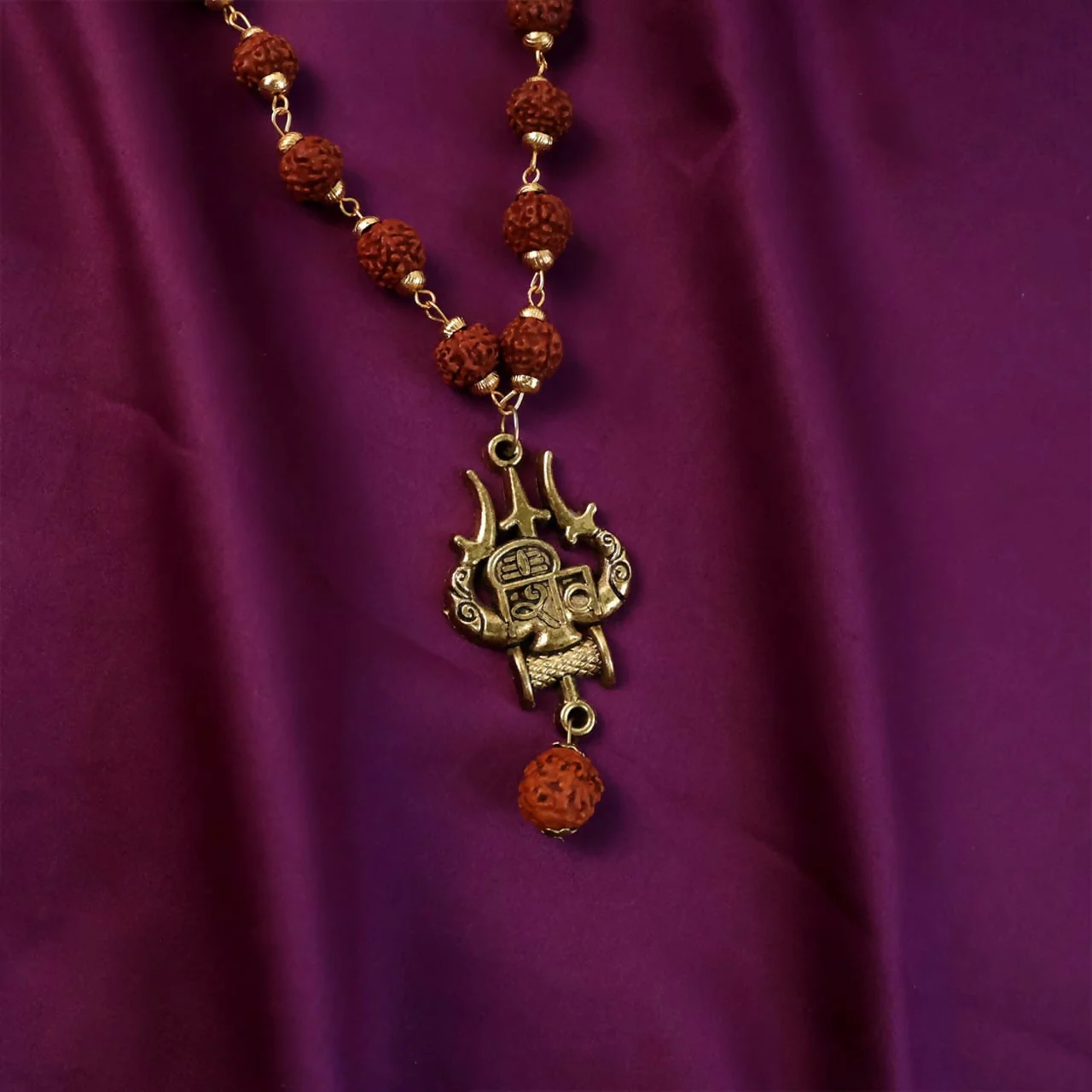The centerpiece features a beautifully detailed Trishul-inspired pendant symbolizing the power and protection of Lord Shiva. A small Rudraksha bead drop adds a graceful finishing touch, enhancing the sacred and traditional look of the necklace.