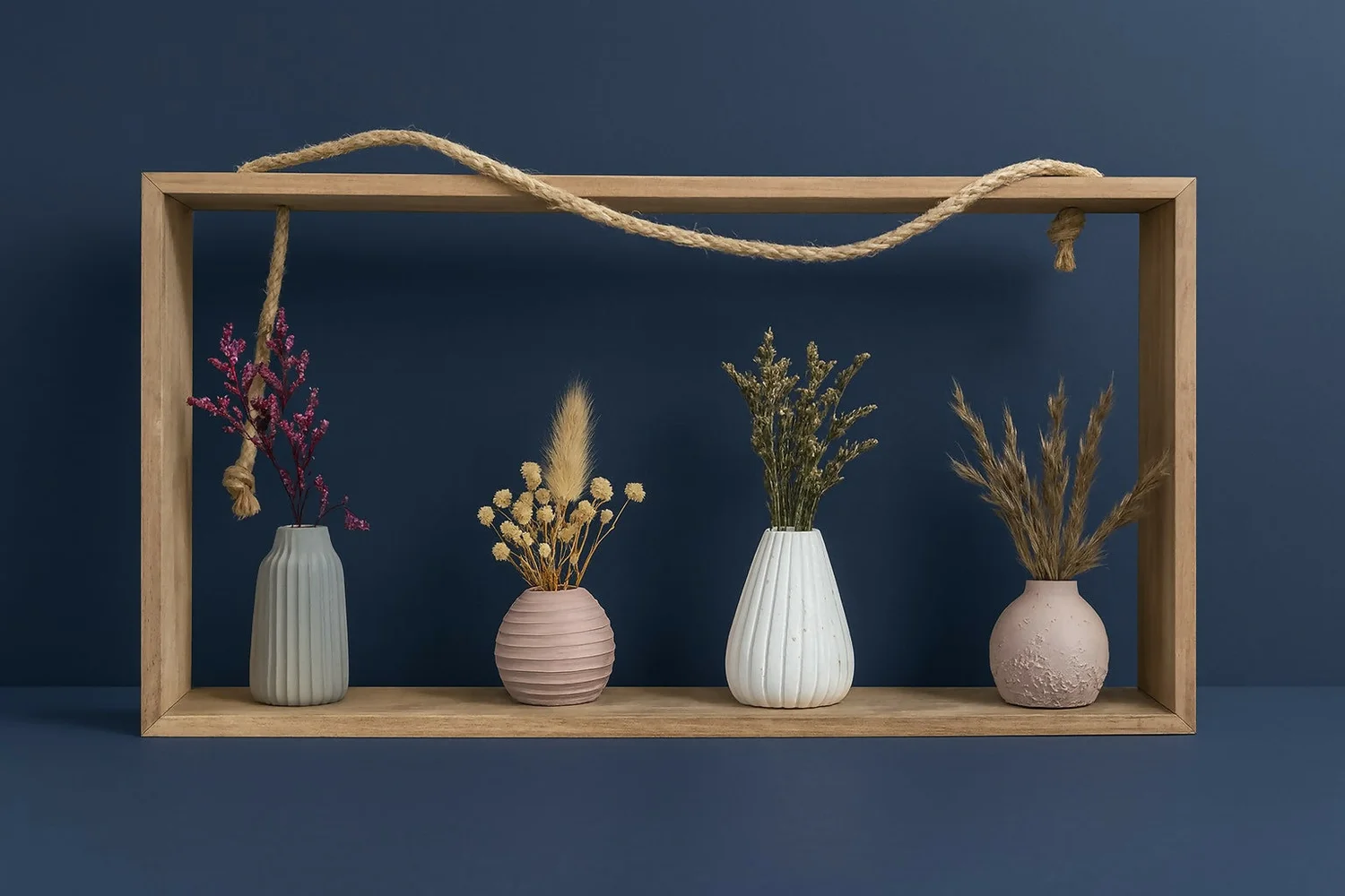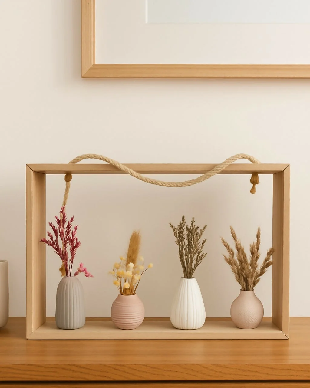 Complete Décor Set – Includes 4 pastel-colored ceramic mini vases with dried flowers in a stylish wooden frame.