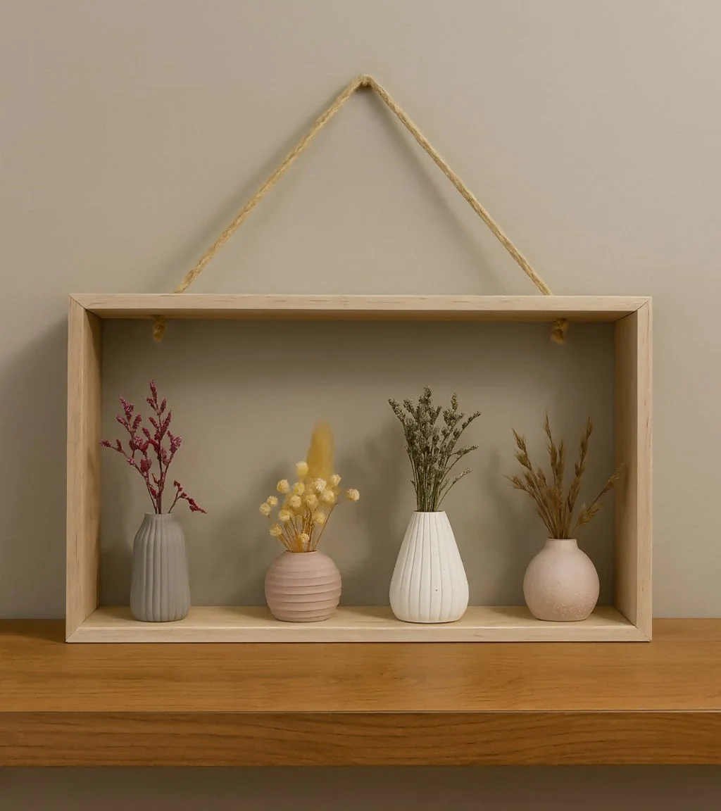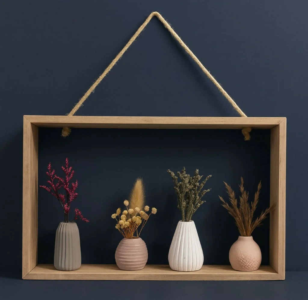 Bring a touch of rustic charm and elegance to your home with this Rustic Wooden Frame Mini Vase Set, featuring four beautifully crafted ceramic vases in soft pastel shades, each paired with carefully arranged dried flowers. The vases are displayed inside a sturdy wooden frame with a rope detail, making it a ready-to-use decorative piece for your living room, bedroom, office, or entryway. Whether placed on a shelf, console table, or desk, this set creates a cozy and stylish ambiance. It also makes a thoughtful gift for housewarmings, weddings, birthdays, or festive occasions.