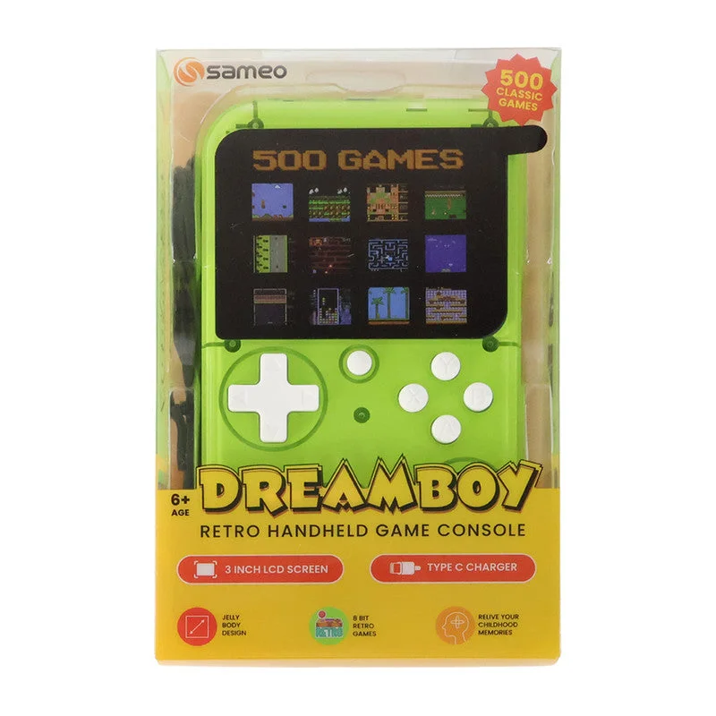 The Sameo DreamBoy Retro Handheld Gaming Console brings back the thrill of classic gaming with 500 built-in games packed into a sleek, portable design. Featuring a bright display, responsive controls, and a lightweight build, it delivers smooth gameplay and hours of fun for both kids and adults. With AV output support, the console easily connects to your TV for a bigger-screen experience, while its rechargeable battery with USB charging ensures convenience for travel and everyday play. Perfect for leisure, gifting, or reliving nostalgic moments, the DreamBoy handheld console is an all-in-one entertainment device that makes classic gaming easy and enjoyable anytime, anywhere.