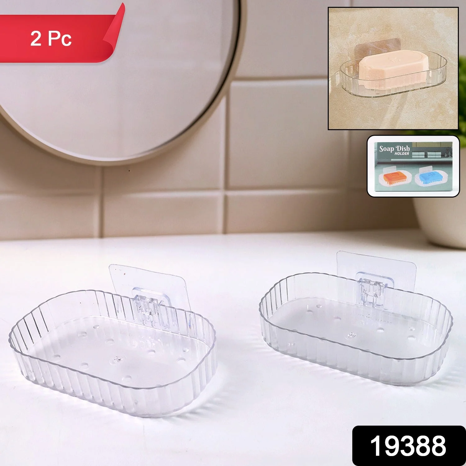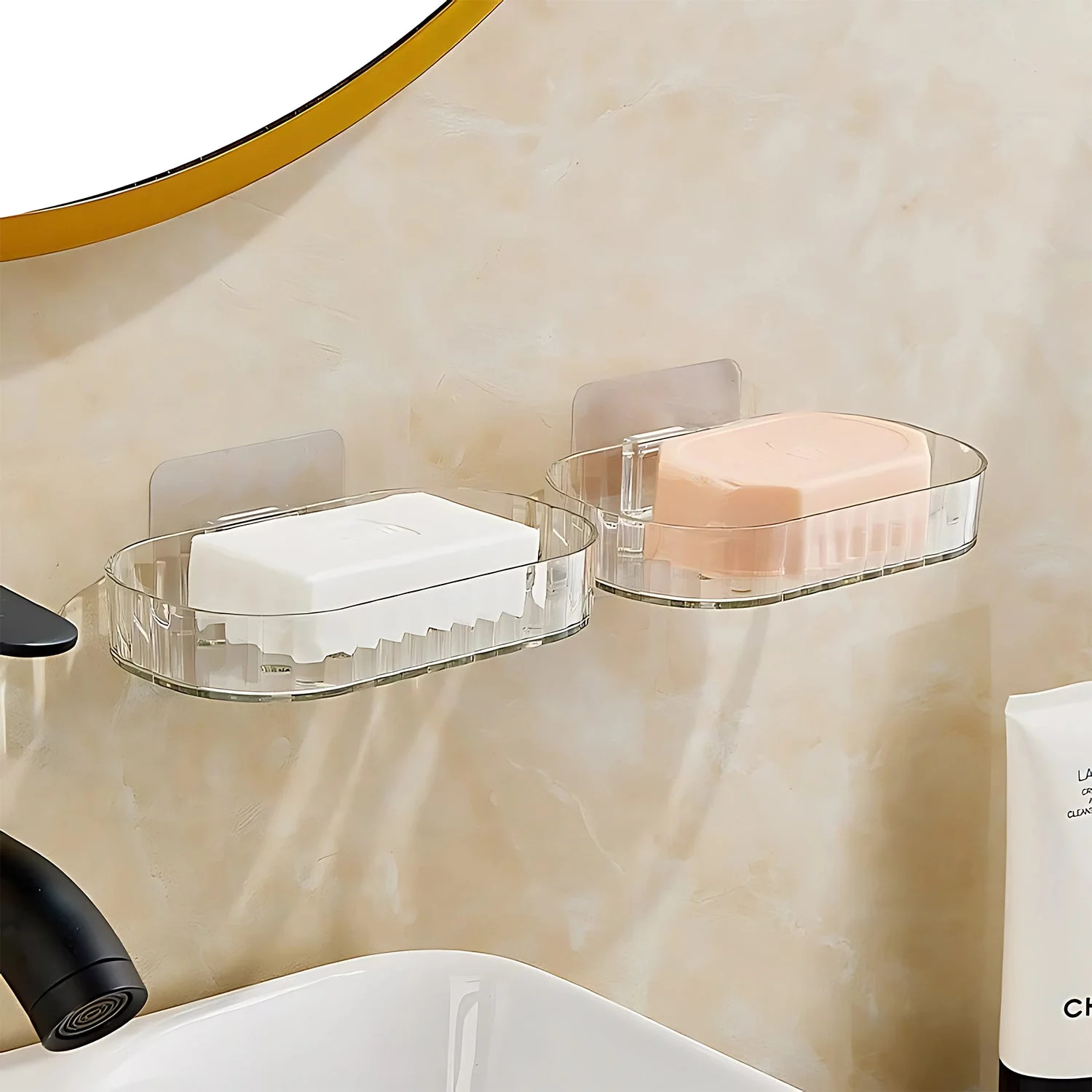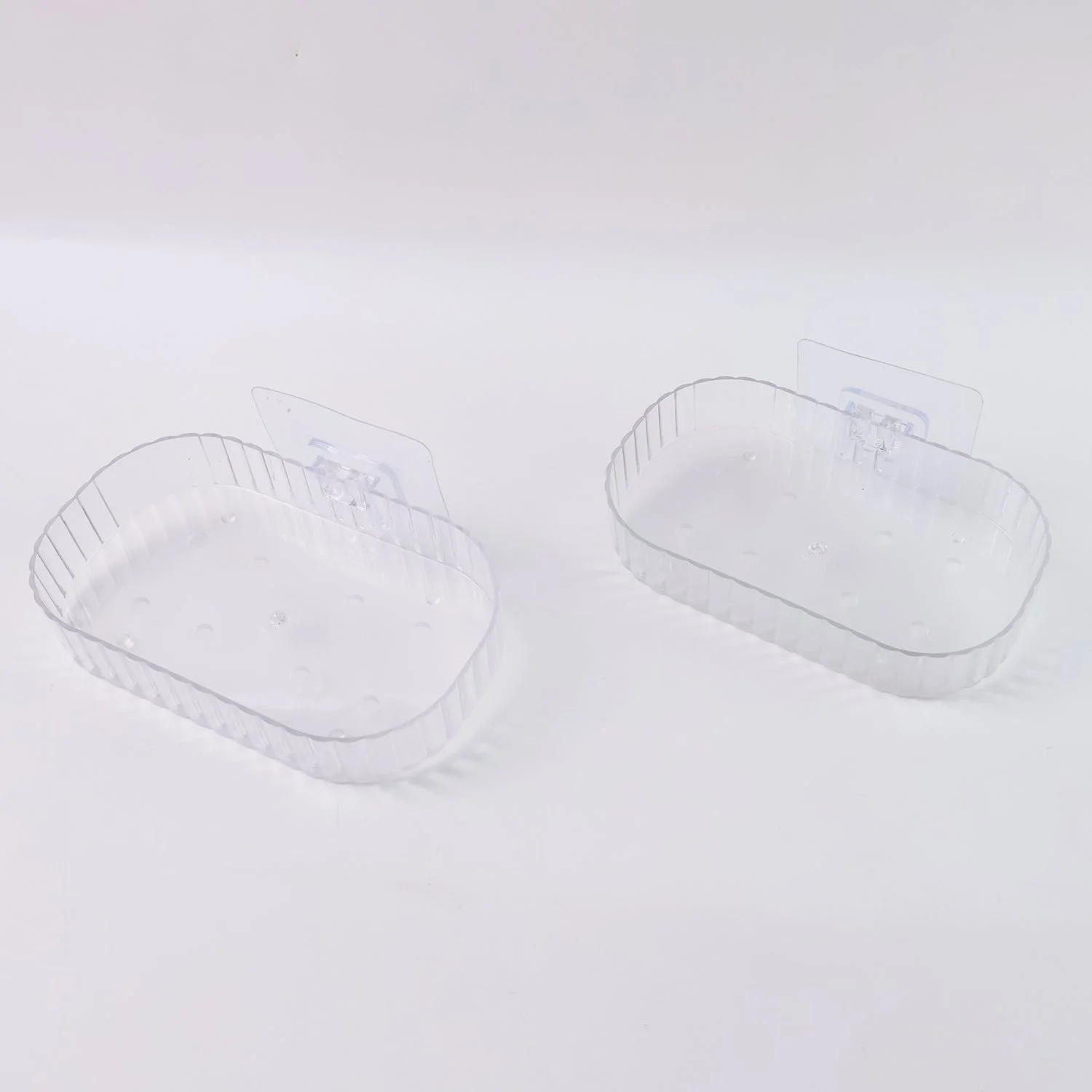 Self Adhesive Transparent Wall Mounted Soap Dish Holder with Drain Holes – Oval Ribbed Design – Reusable Bathroom Storage Tray – Pack of 2