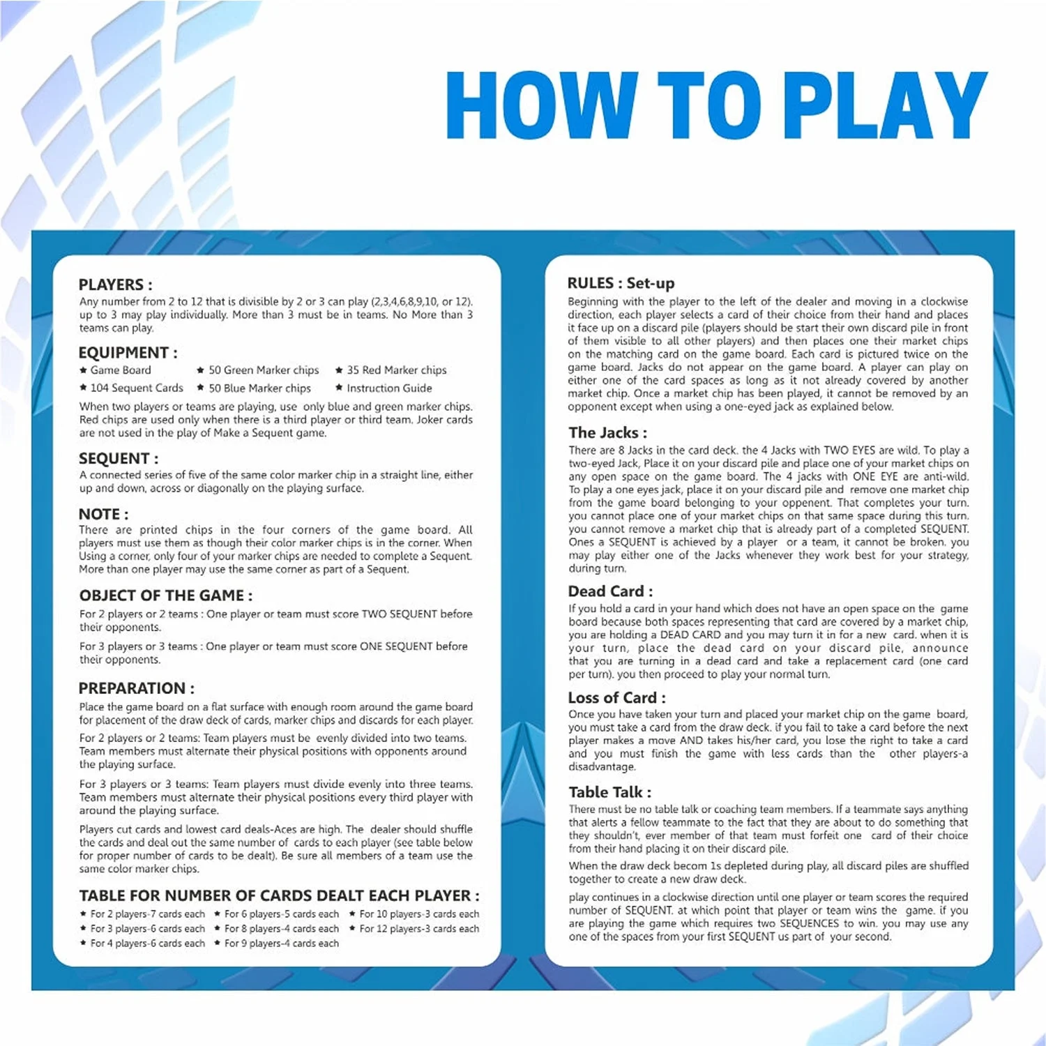 A-Sequent is a fast-paced strategy board game designed to build logic, planning, and teamwork while keeping players fully engaged. The set includes a premium foldable game board, ABS plastic coins, and high-quality playing cards—everything needed for a smooth and exciting gameplay experience. Players must form strategic sequences using their cards and coins, making every round a mix of skill, luck, and clever thinking. Ideal for family nights, group play, and fun learning, this game offers hours of entertainment while improving focus and decision-making skills.