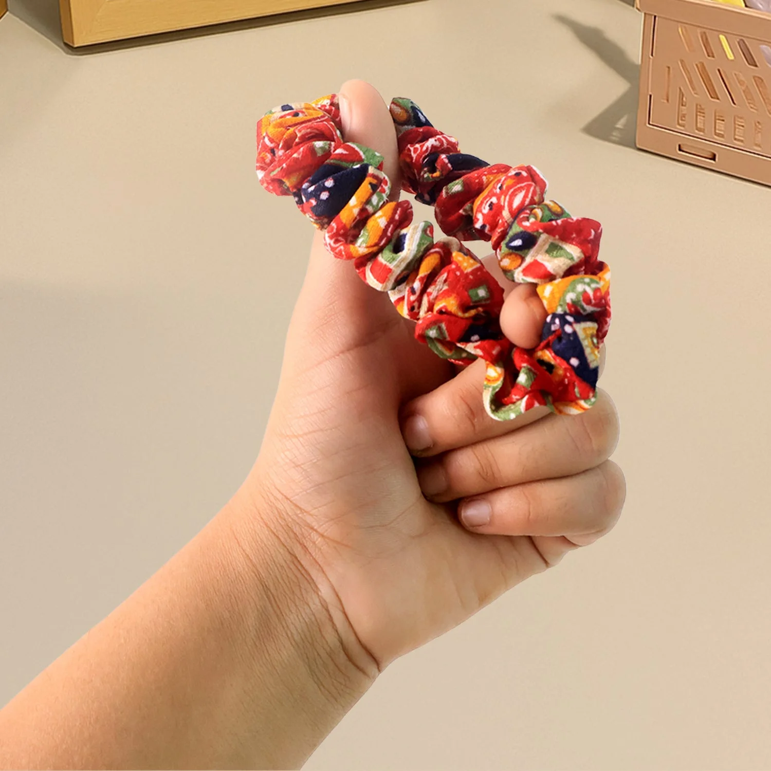 Set of 12 high-quality printed scrunchies in assorted designs and colors.