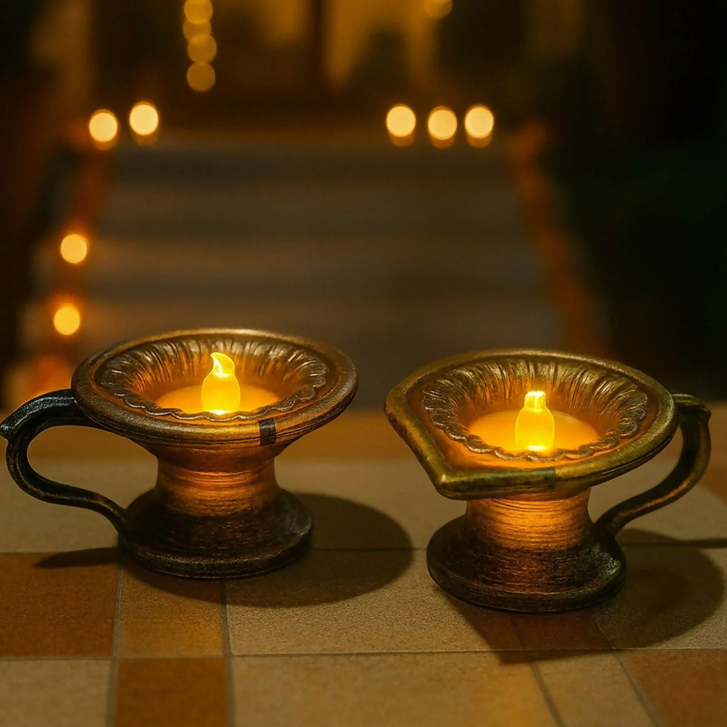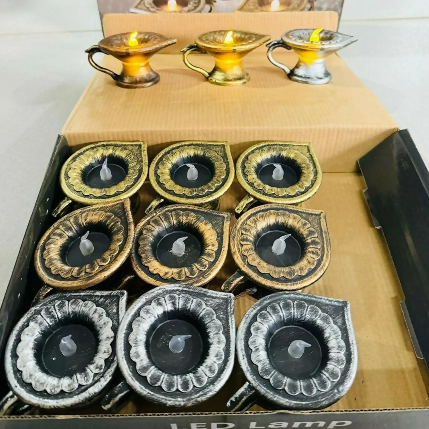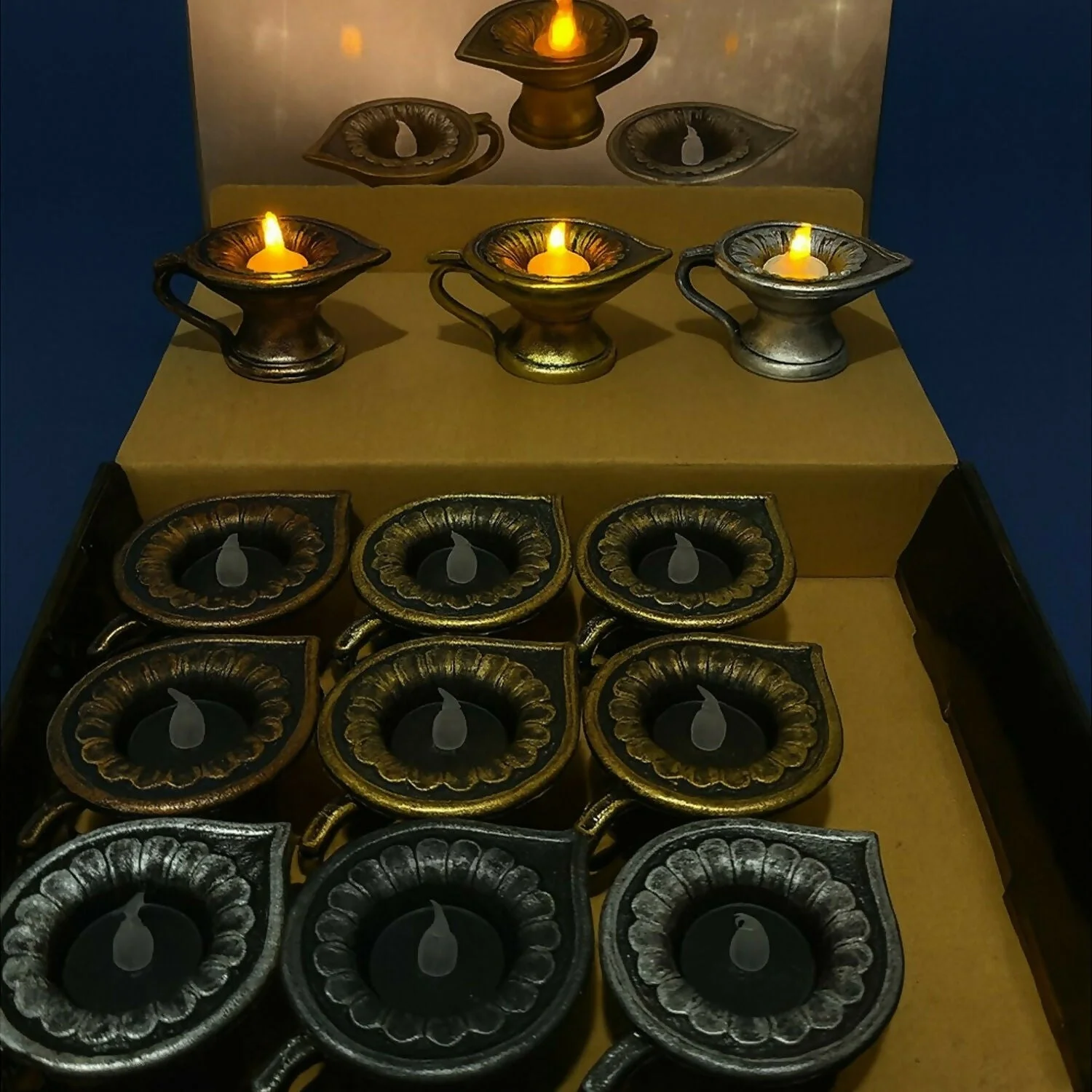 Illuminate your home and celebrations with this set of 12 antique-style LED diya lamps. Each diya is designed with a vintage metallic finish and a realistic warm flame effect, making them perfect for Diwali décor, pooja rituals, Navratri celebrations, and wedding decorations.