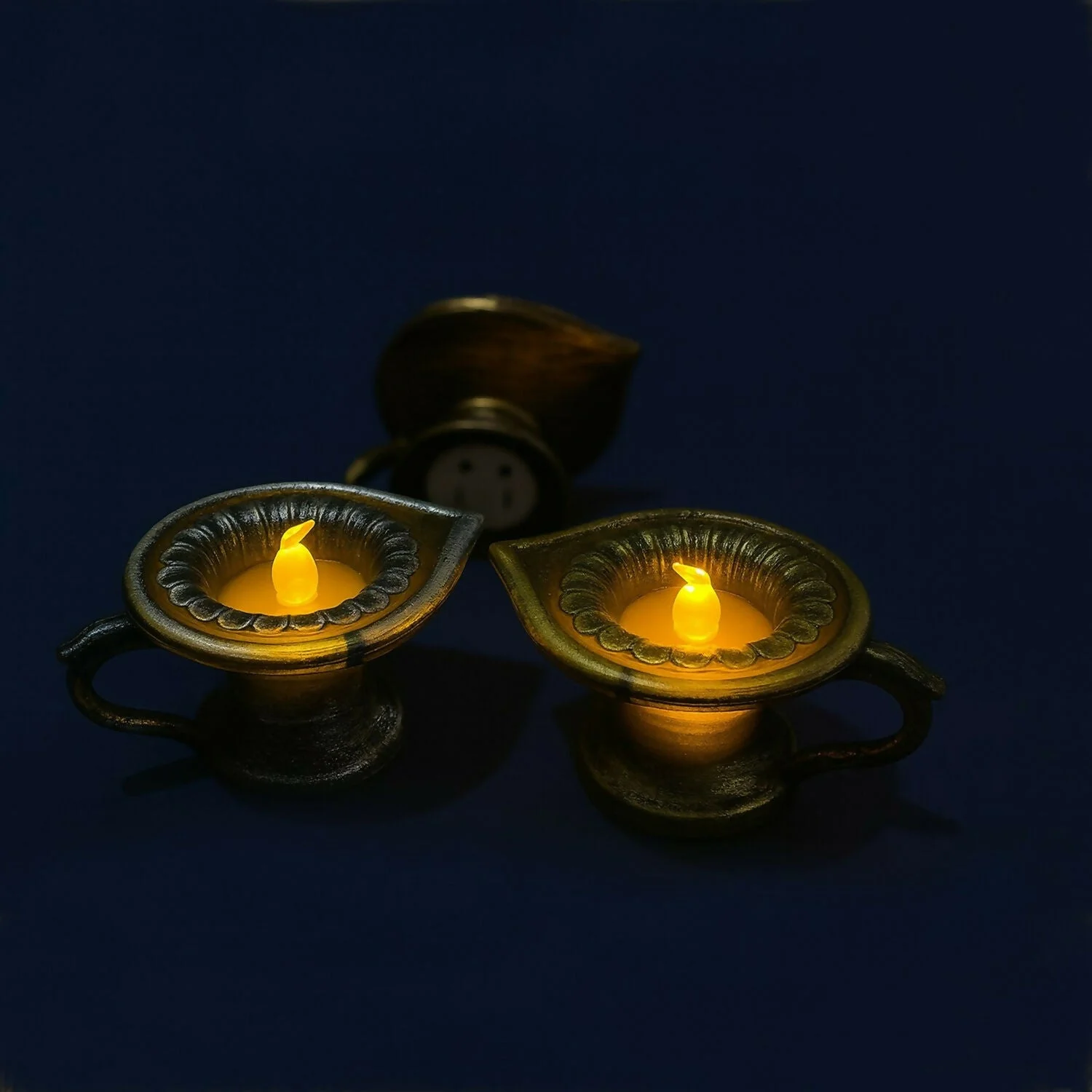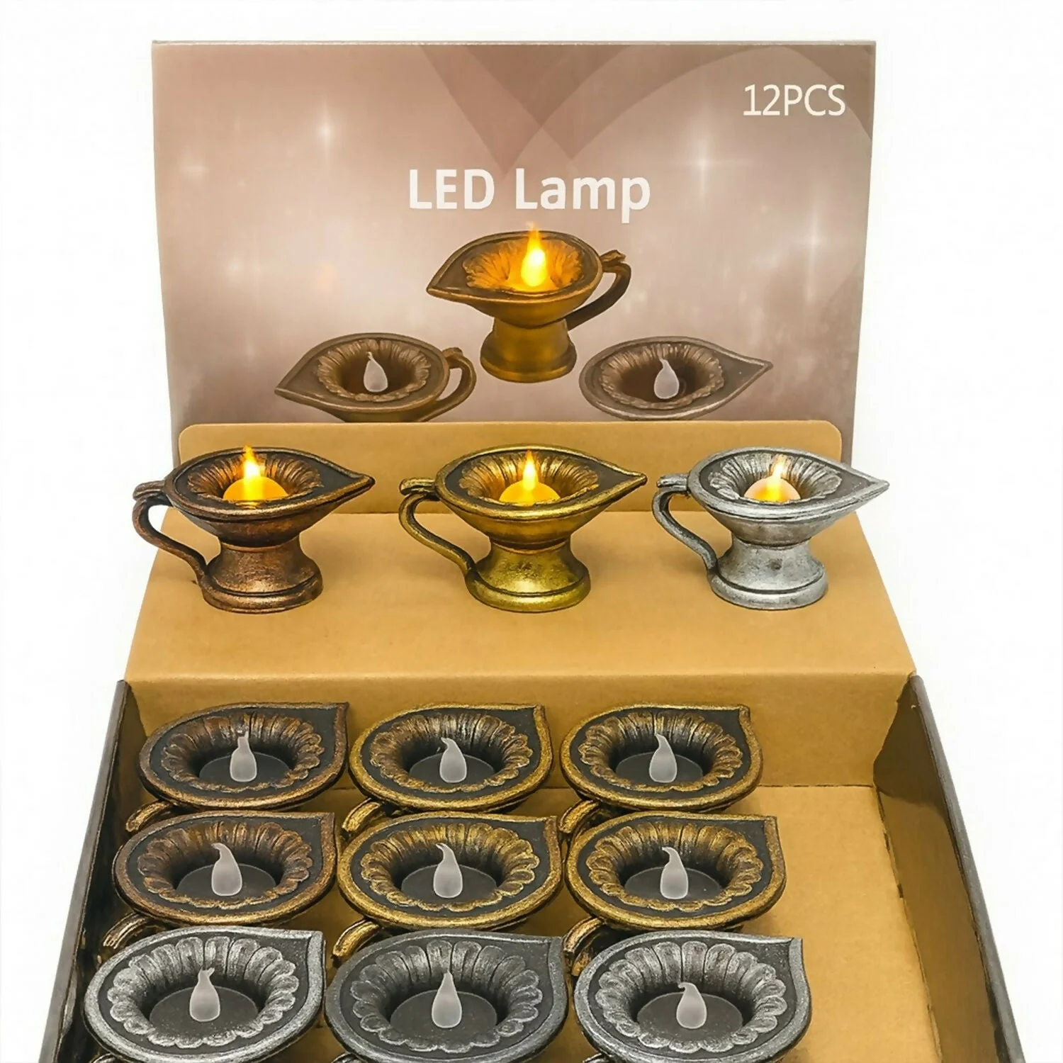 LED diya set of 12, battery operated diya lights, flameless deepak set, antique finish LED diya, reusable pooja lamps, Diwali diya lights, LED deepak for temple, vintage diya set, festival decoration lights, battery powered pooja diyas, safe LED diya for kids
