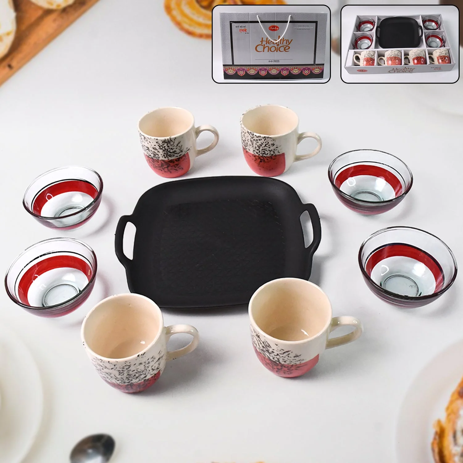 Healthy Choice Set Of 4pc Ceramic Cup And 4pc Glass Bowl With Plastic Plate (9 Pcs Set)