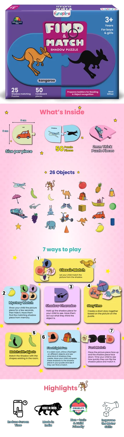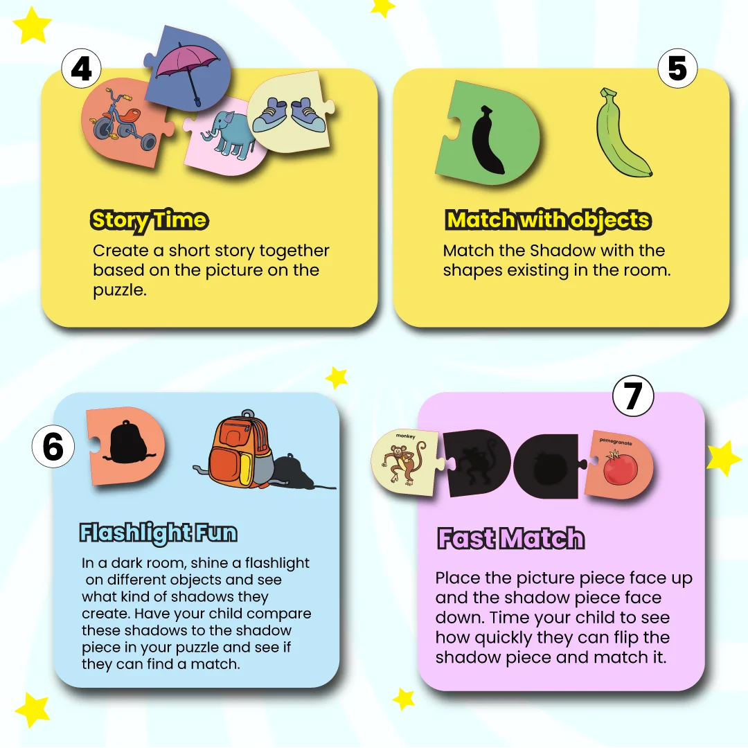 Helps in: Finding the correct match for the shadow encourages critical thinking and problem-solving skills, helping children develop strategies to tackle future challenges.