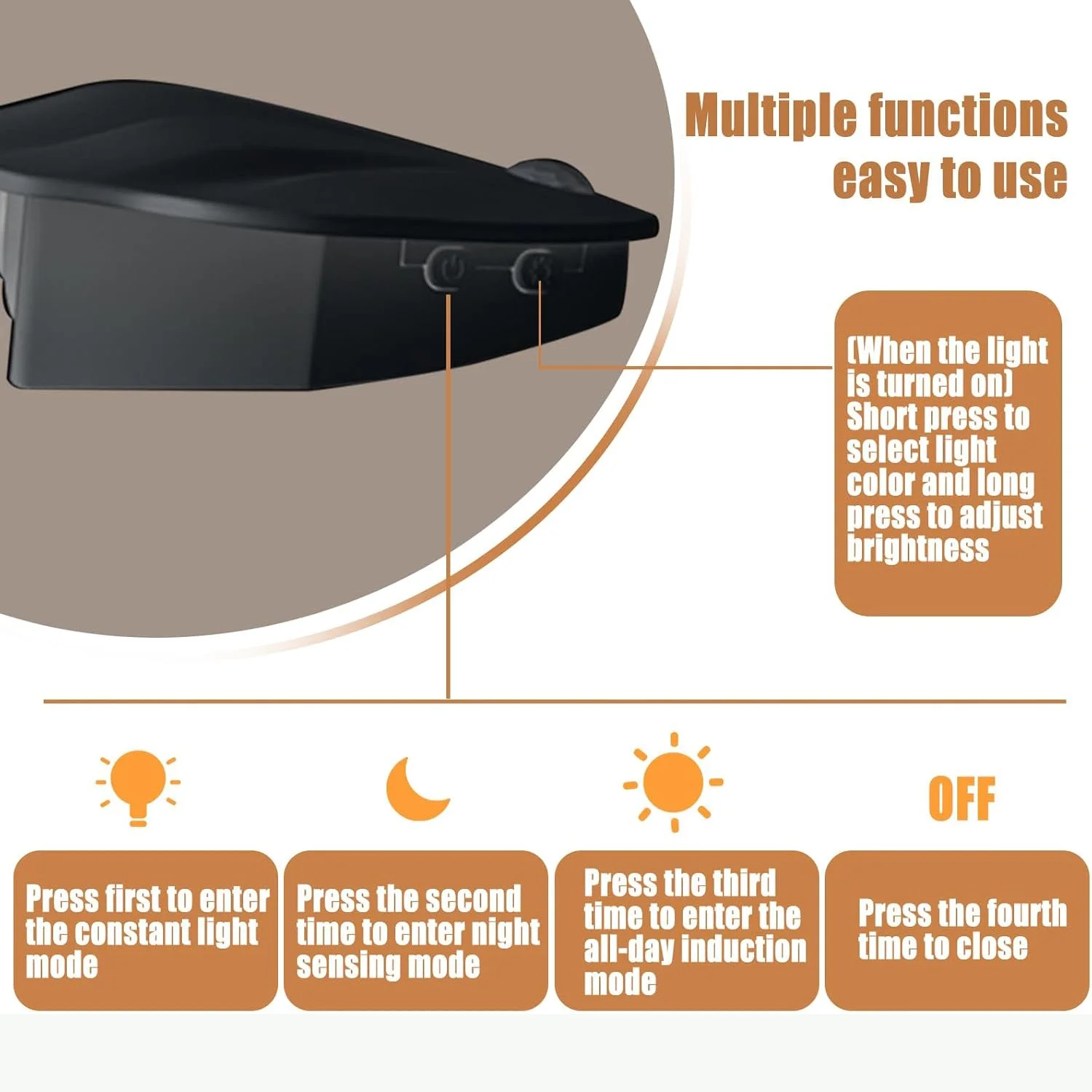 Sensor: Passive Infrared (PIR) with auto-on in low light; auto-off after delay