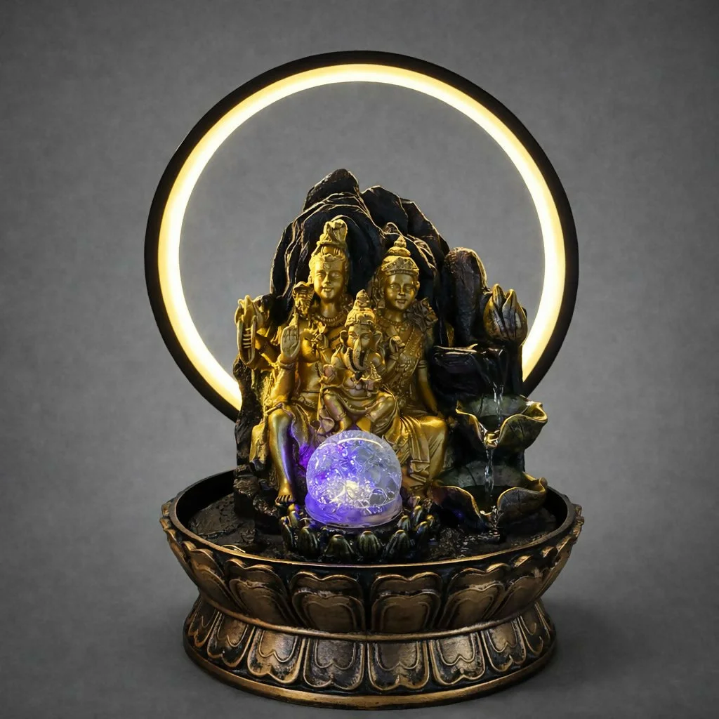 shiv parivar fountain, shiva family decor, LED water fountain, pooja room decor, spiritual tabletop fountain, halo ring light decor, home temple decor item, indoor decorative fountain, religious home decor, meditation water feature, festival gift item, devotional fountain
