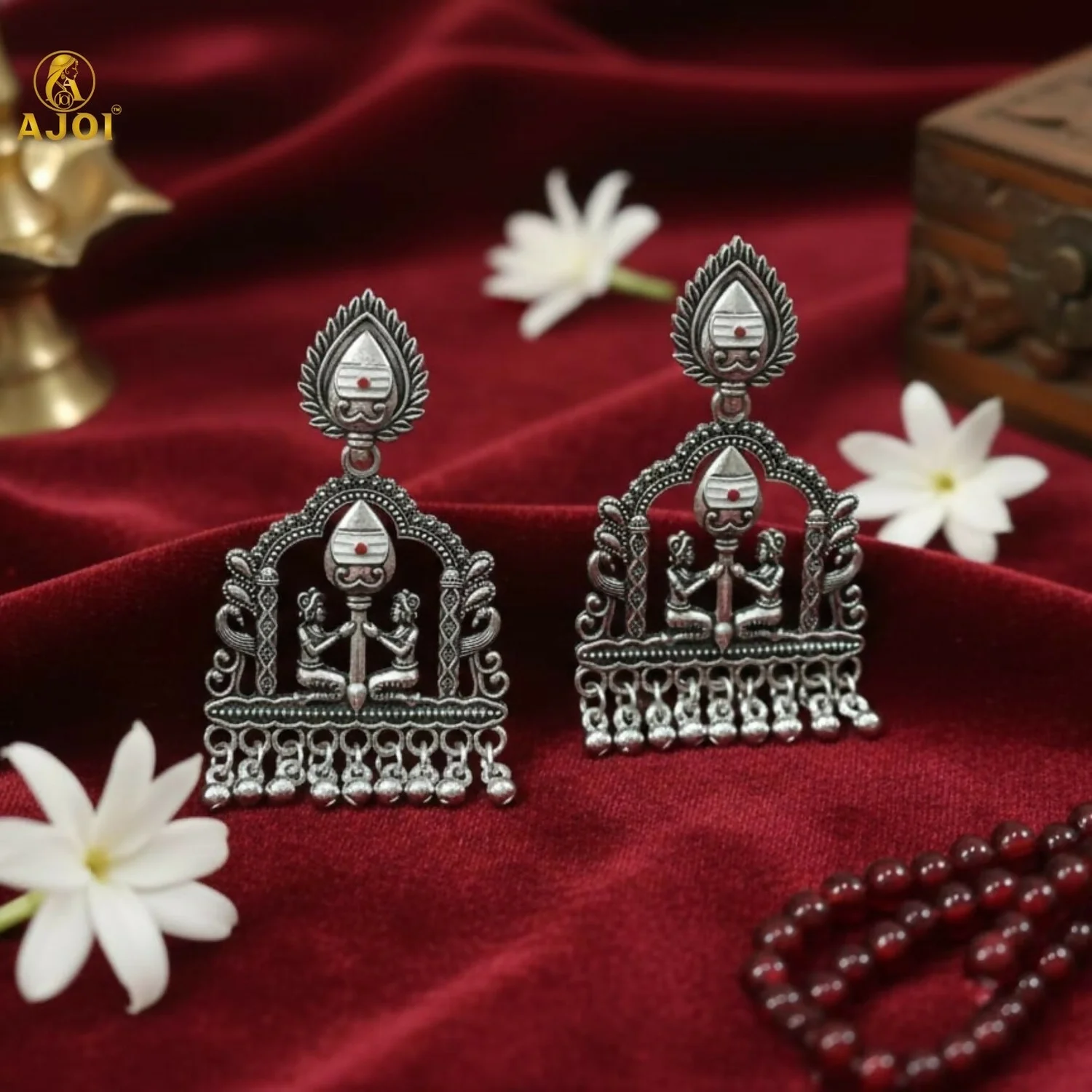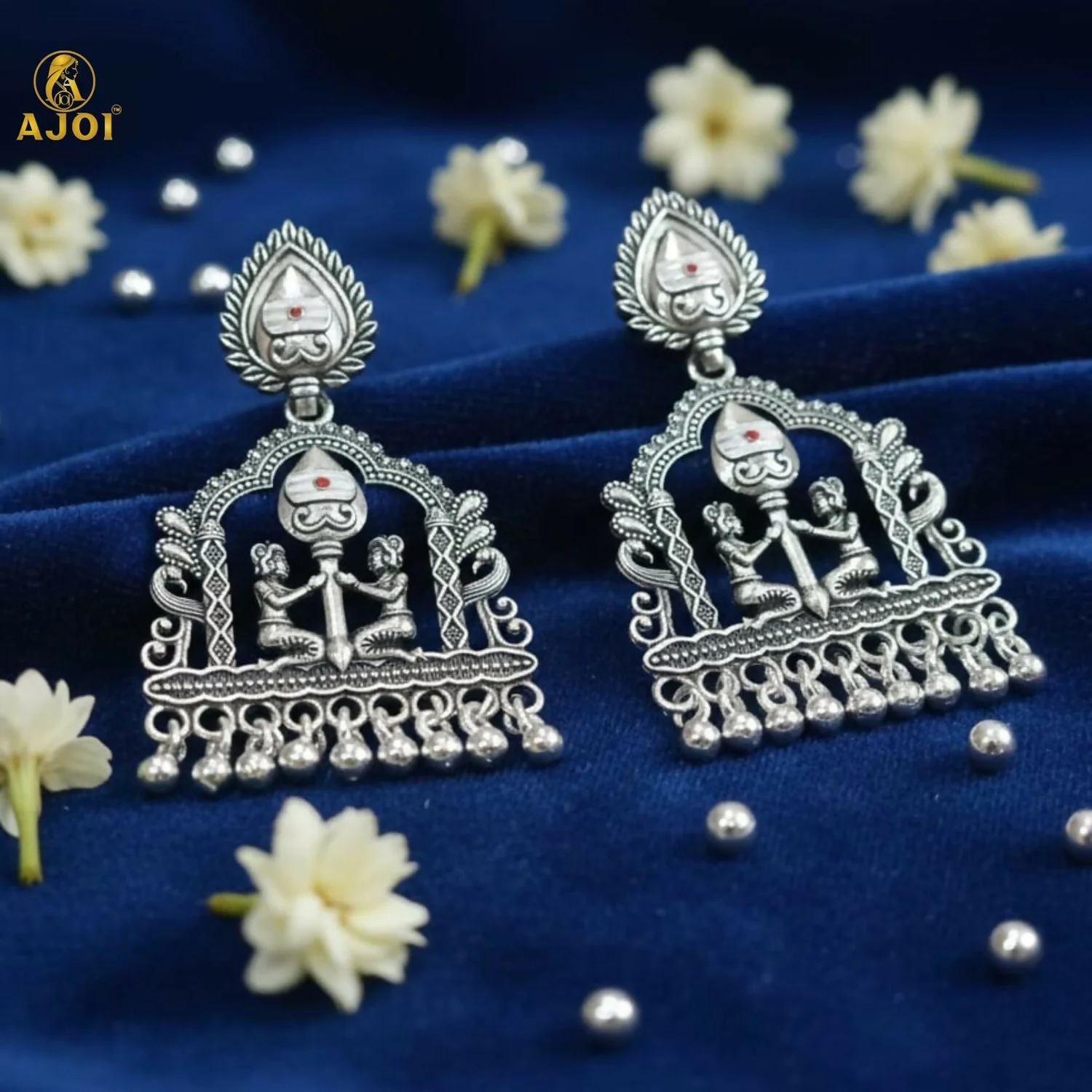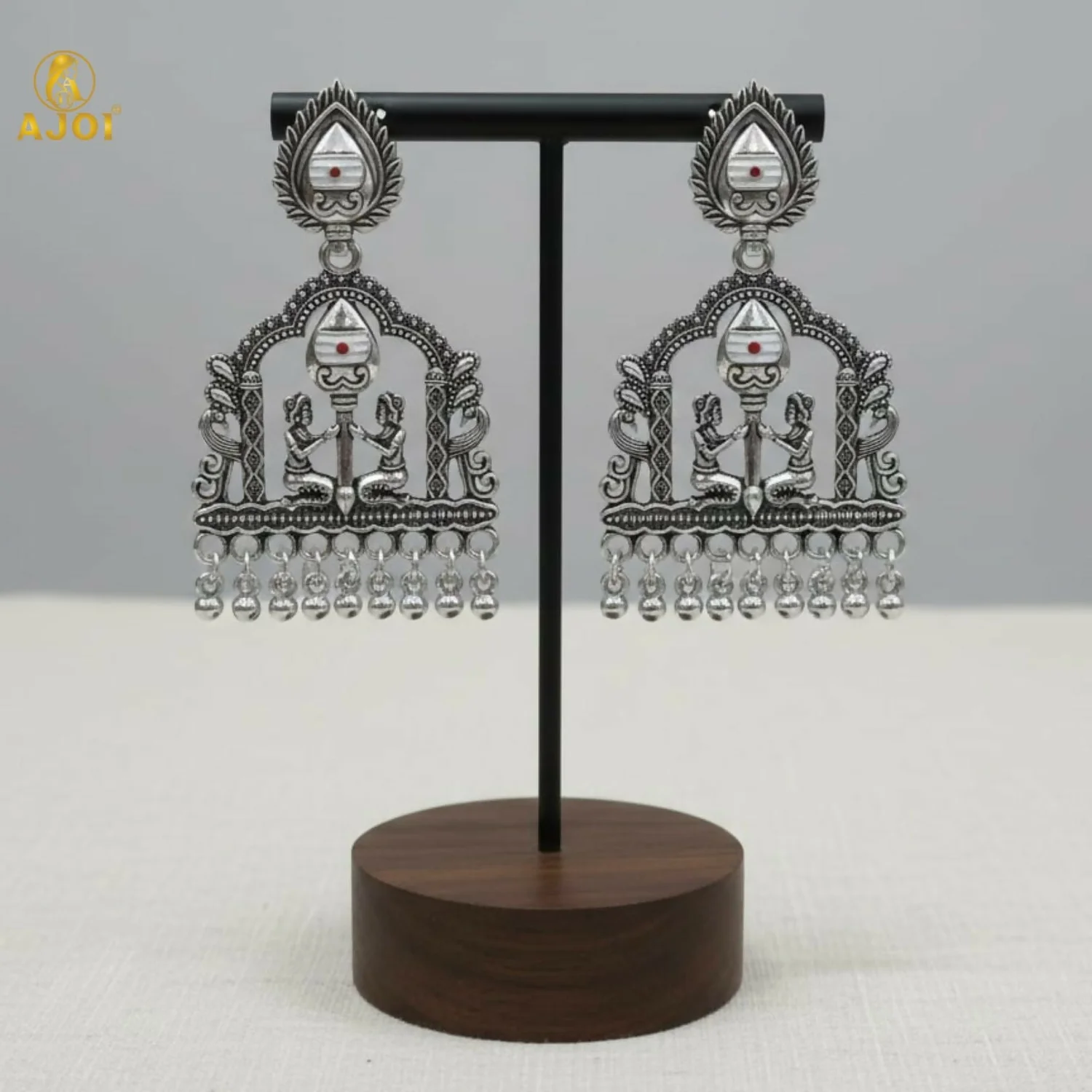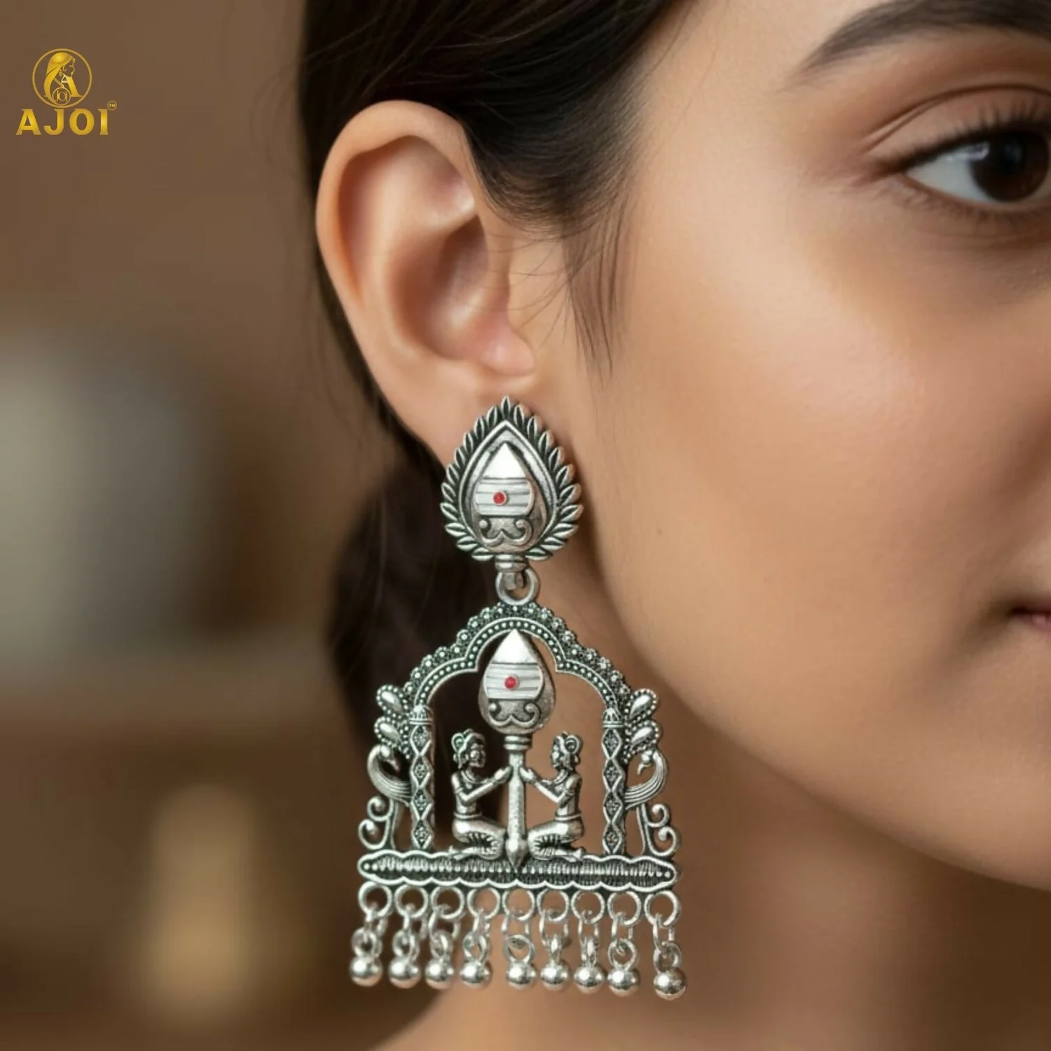 Rooted in sacred Indian artistry, Shivarpan earrings reflect timeless devotion and heritage craftsmanship. Designed in a classic temple silhouette, the elegant teardrop stud flows into an intricately carved arch featuring divine motifs and traditional figures, symbolizing balance, faith, and harmony. The oxidized silver finish enhances every fine detail, while the graceful dangling ghungroo beads add rhythmic movement and antique charm.