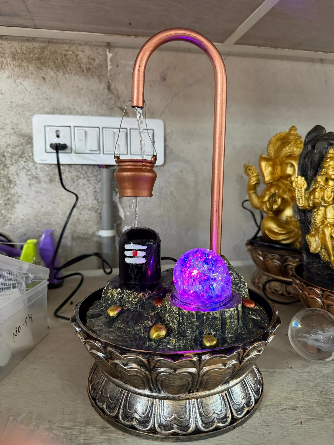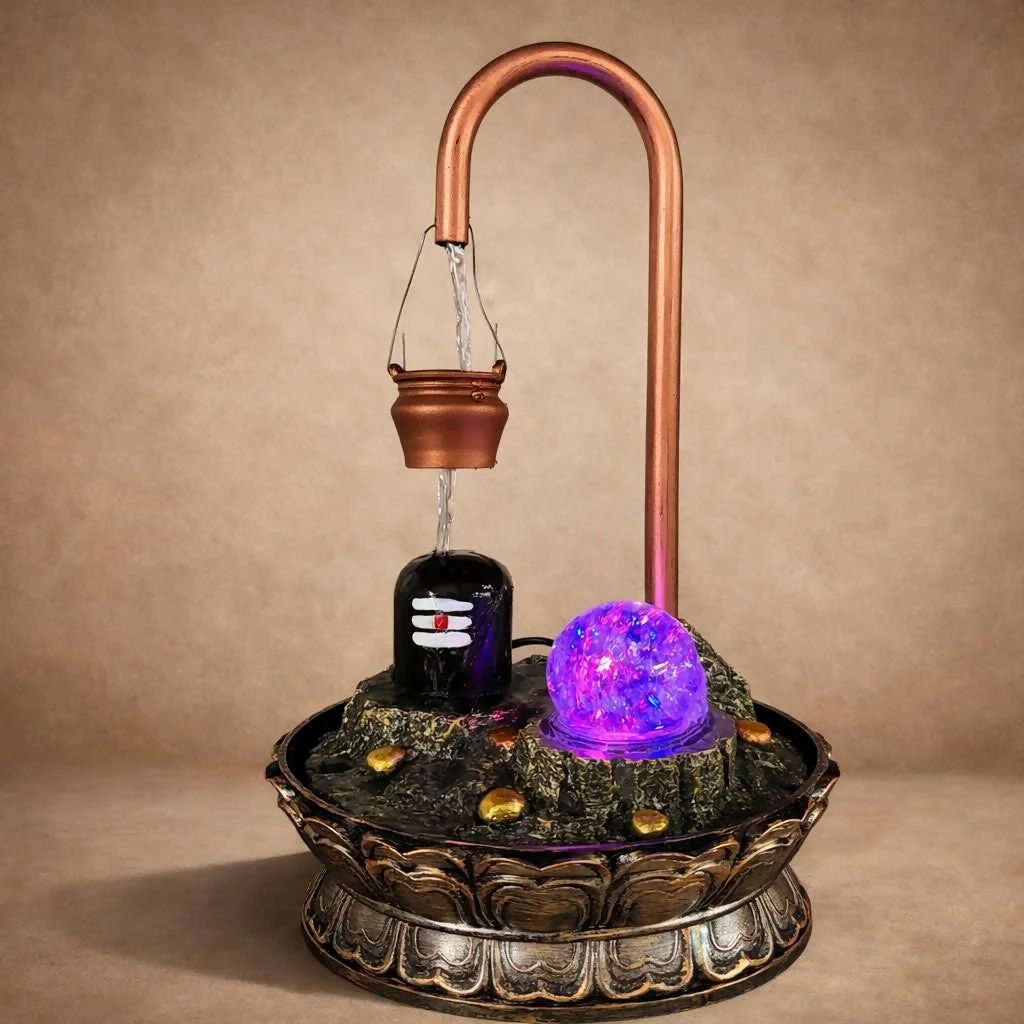 shivling water fountain, spiritual tabletop fountain, pooja room decor, indoor water fountain, LED crystal fountain, home temple decor, meditation fountain, decorative water feature, religious decor item, desk fountain, gift for housewarming, festival decor
