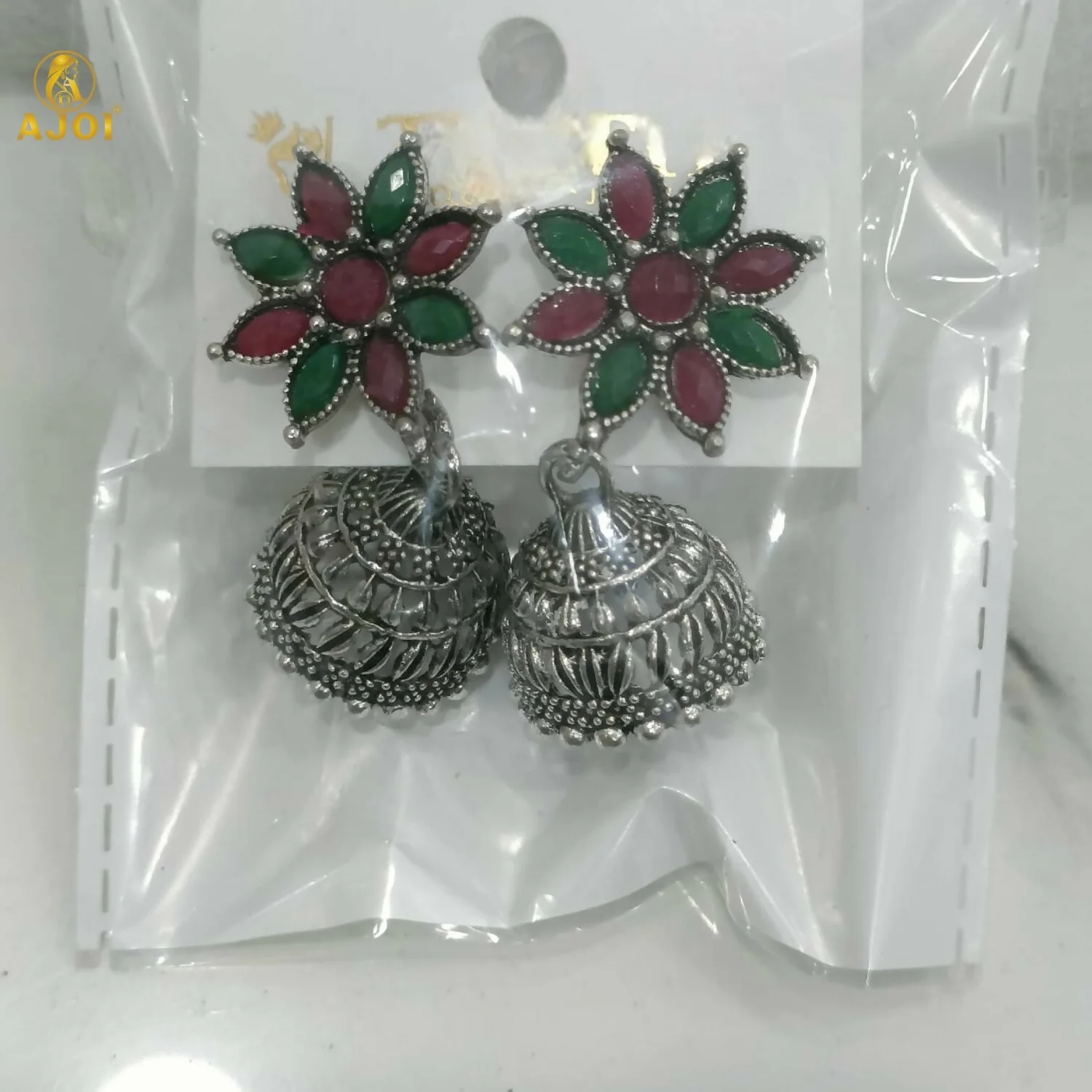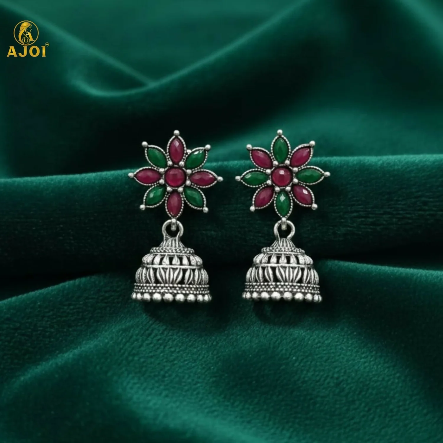 An ode to timeless Indian elegance, Shringara Ratnam earrings are crafted to celebrate beauty, artistry, and tradition. The exquisite floral stud is embellished with rich ruby and emerald-toned stones, forming a radiant bloom that reflects royal opulence. Below, a finely sculpted oxidized silver jhumka unfolds in intricate layers, echoing the grandeur of classical Indian ornamentation.