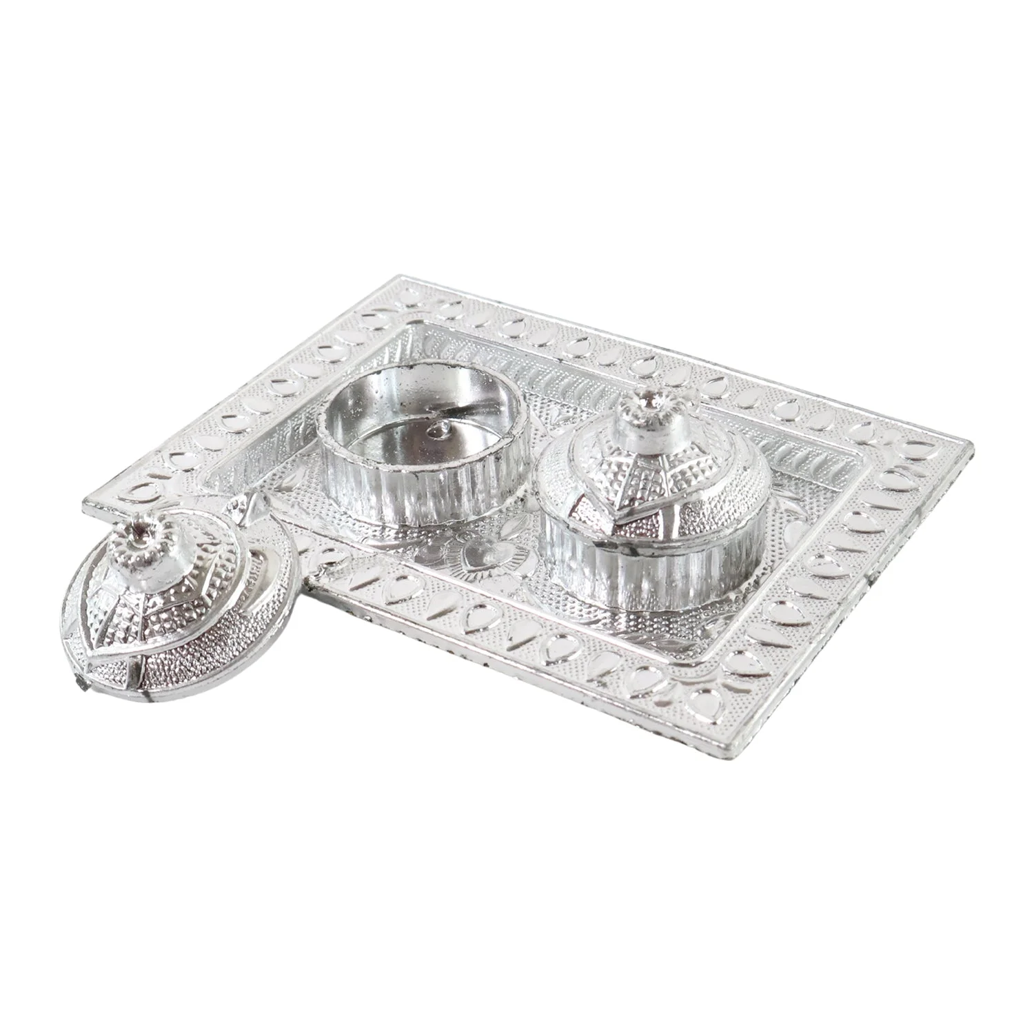 Silver-finish kumkum box, pooja tray set, tilak holder set,compact pooja accessory, mandir kumkum box, festive ritual tray, square pooja plate,chandan holder for rituals, silver pooja set, decorative pooja tray, kumkum dabbi set, traditional pooja item, puja thali with containers, roli chandan box set
