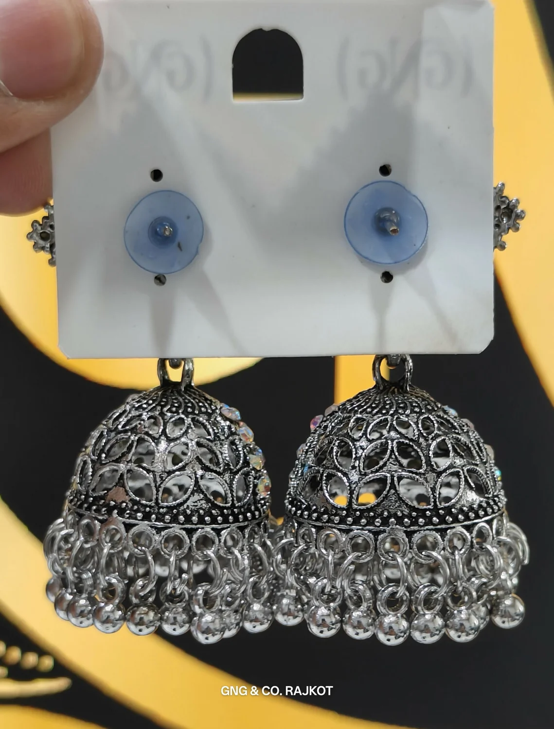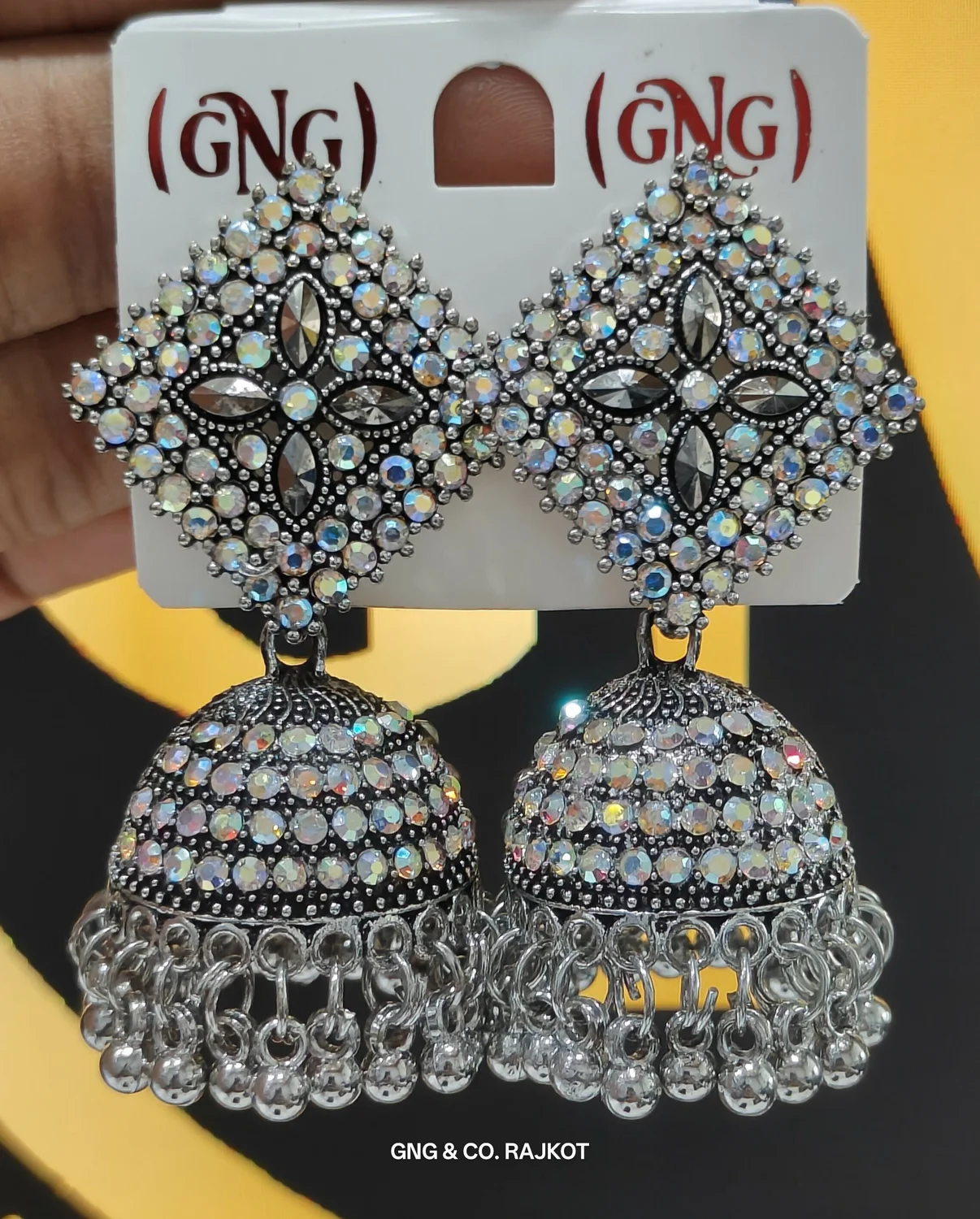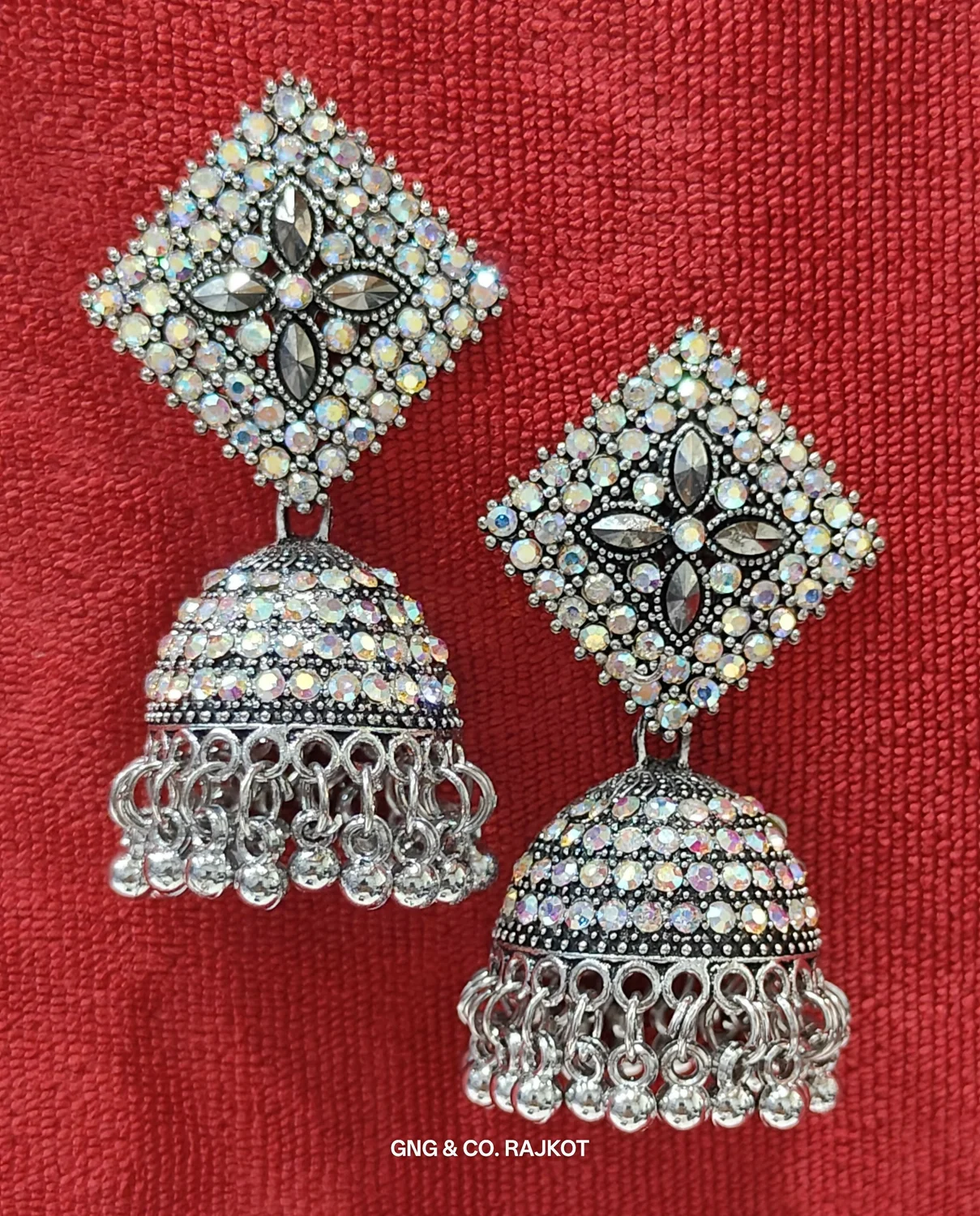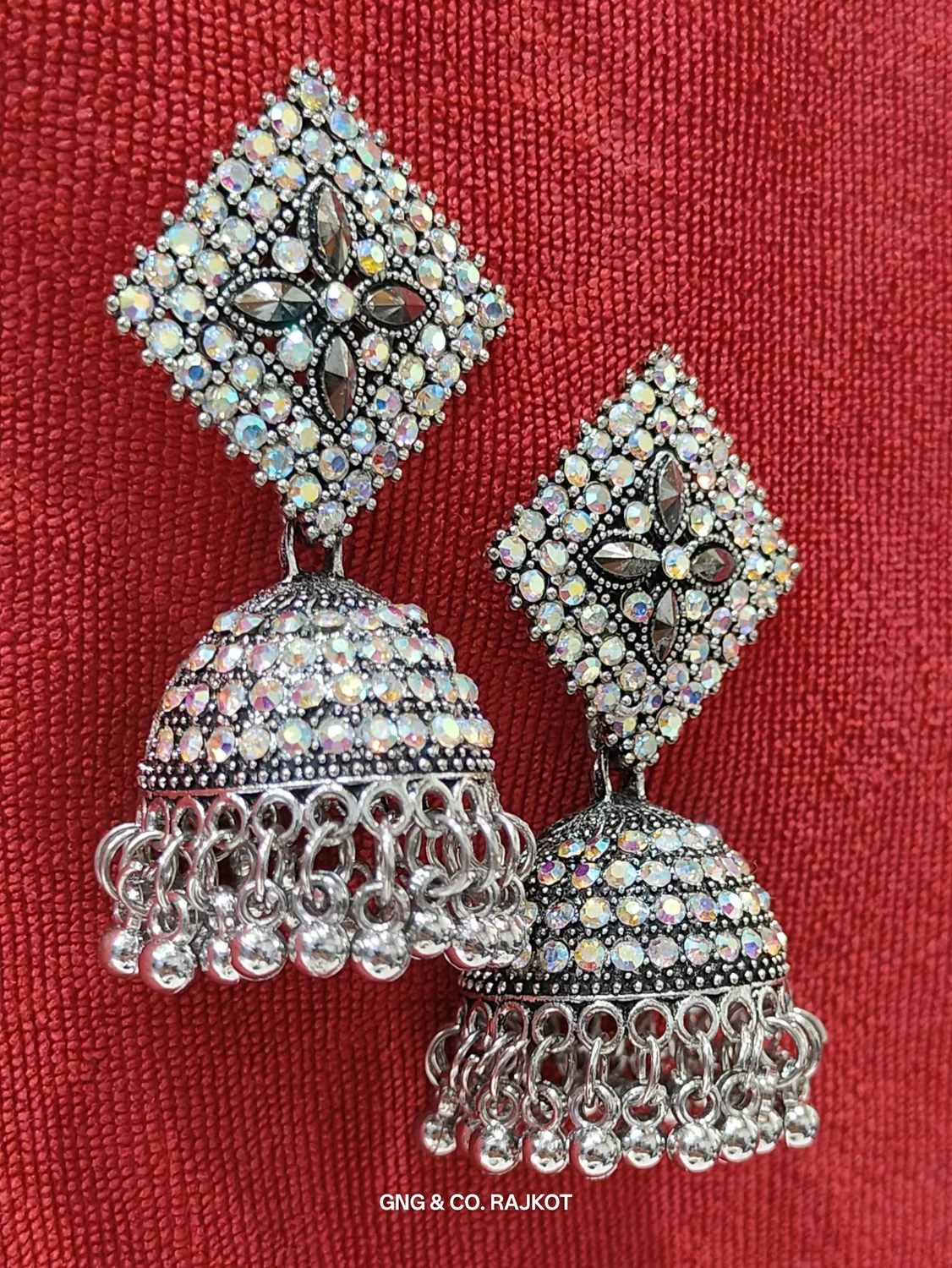 Elevate your elegance with these stunning silver jhumka earrings, featuring a bold square-shaped top completely encrusted with shimmering diamond stones. The dazzling design continues through the entire jhumka, creating a sparkling masterpiece that captures the light from every angle. Crafted for those who love luxury and timeless beauty, these earrings are perfect for weddings, parties, or festive occasions. A true blend of tradition and modern glamour.