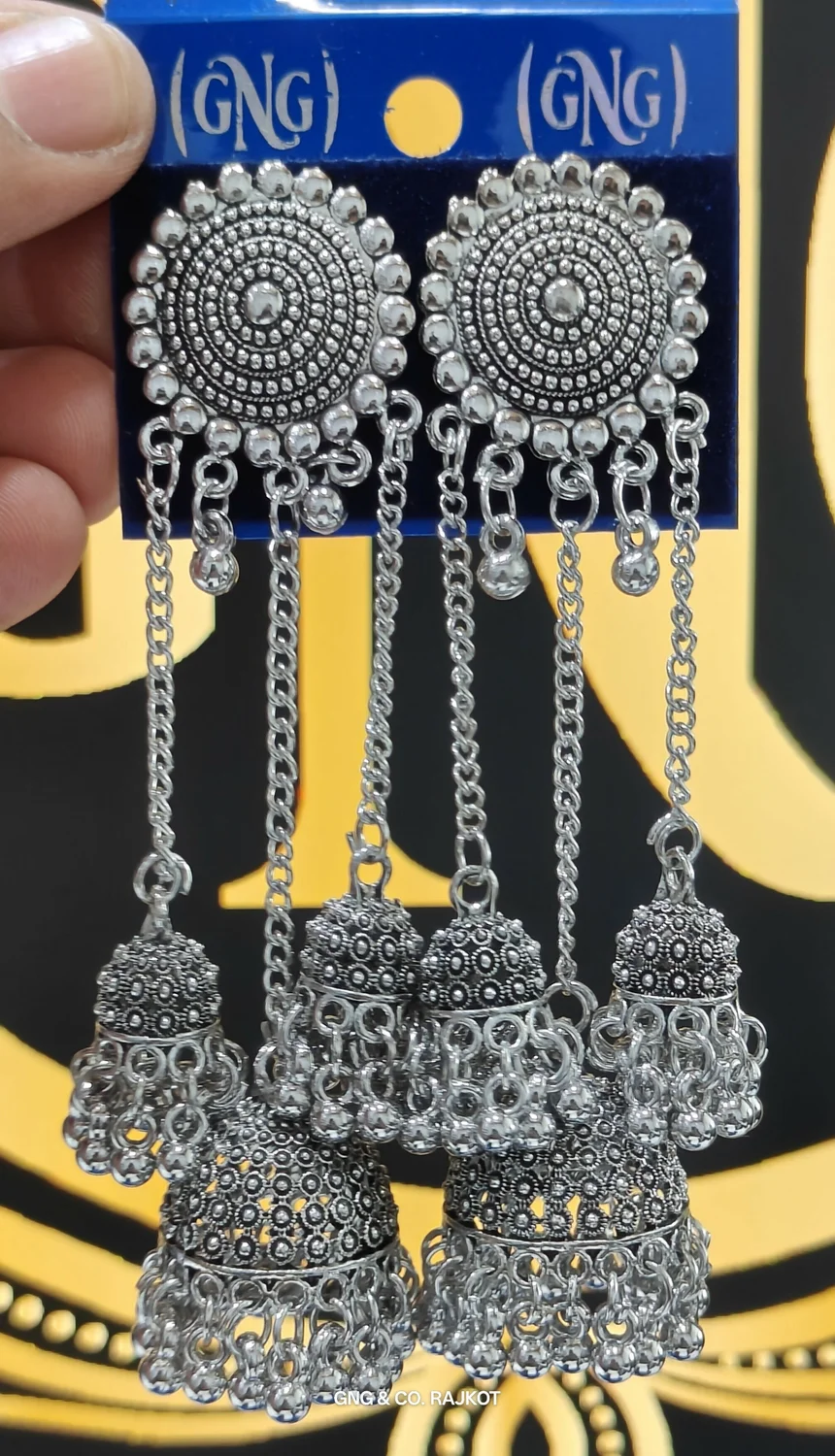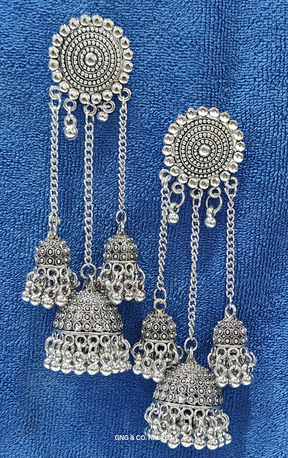 Elevate your ethnic look with these stunning Oxidized Silver Triple Jhumka Earrings. Featuring a beautifully detailed round stud top with intricate concentric dot work and a floral outer design, these earrings cascade into three chains that hold delicately carved dome-shaped jhumkas. Each jhumka is adorned with intricate motifs and classic ghungroo-style dangling beads, giving them a rich, traditional appeal. Crafted from high-quality oxidized silver, these earrings exude vintage charm and make a perfect statement piece for festive occasions, weddings, or cultural events.