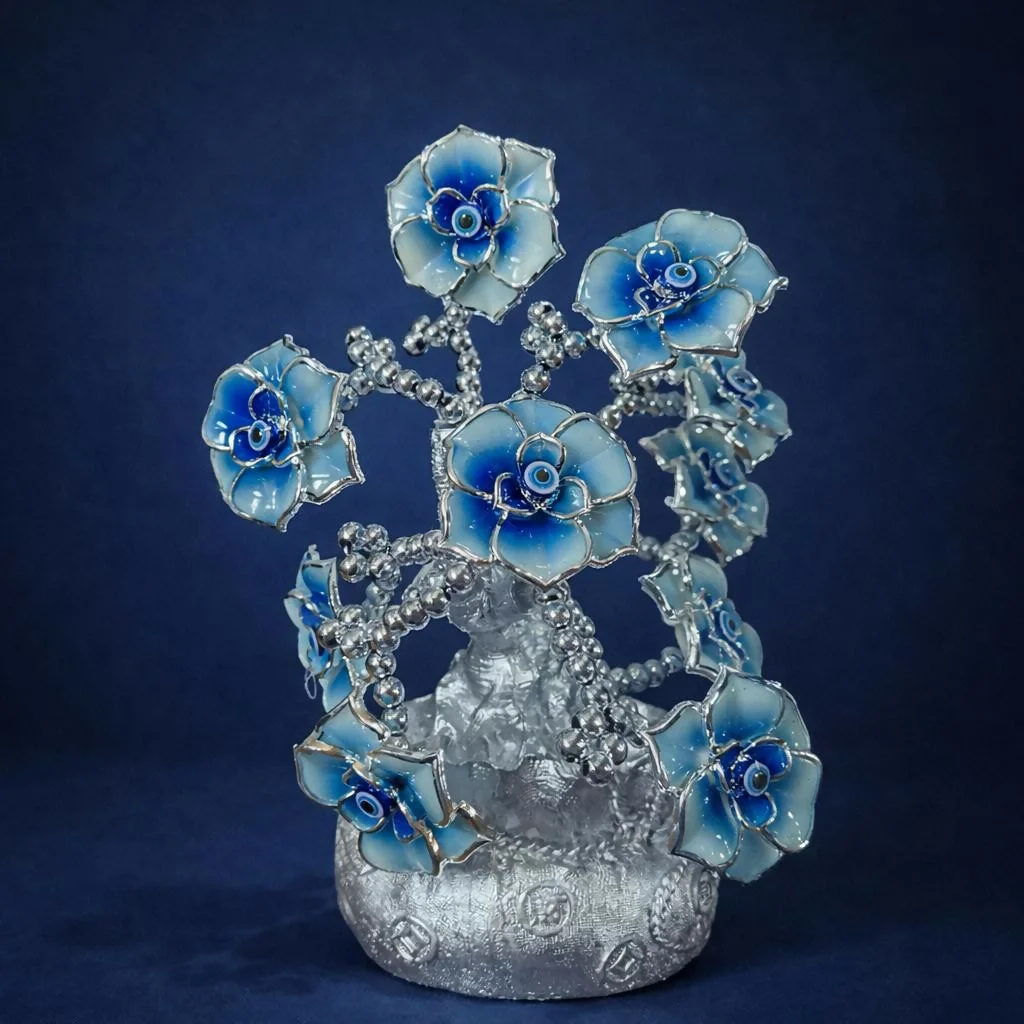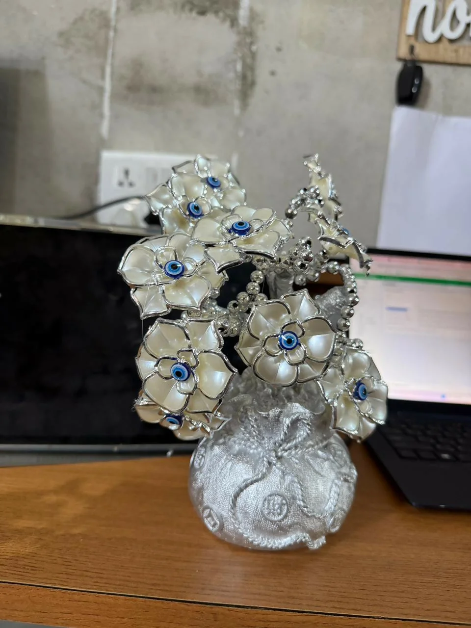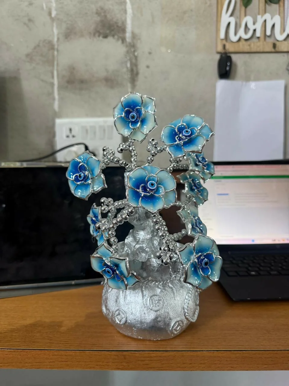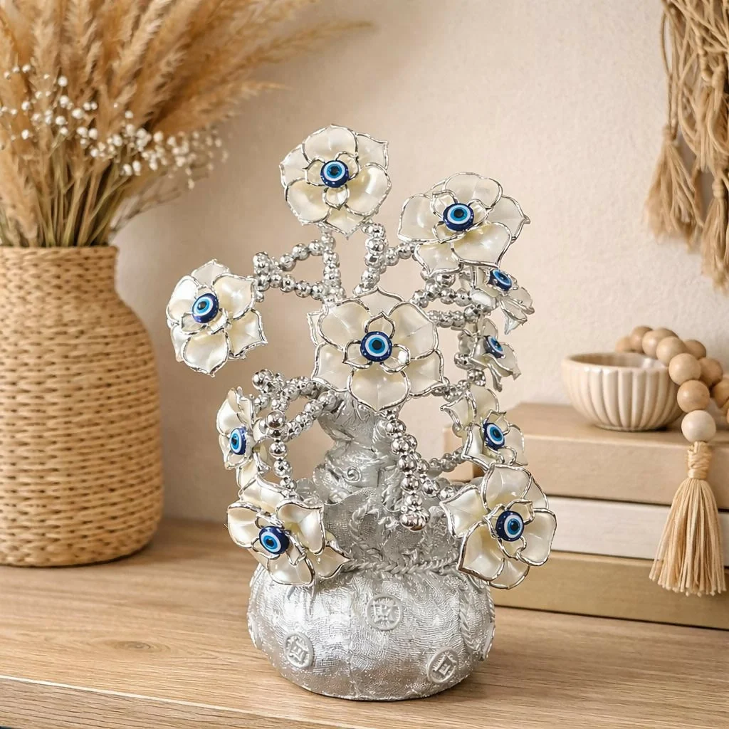 Enhance the beauty of your home with this elegant silver lucky flower tree decorative showpiece. Designed with delicate pearl-like flowers and blue evil eye accents, this stunning décor piece symbolizes protection, prosperity, and positive energy. The intricate silver branches and beautifully crafted vase-style base create a luxurious centerpiece that complements both modern and traditional interiors. Perfect for decorating living rooms, office desks, shelves, or entry tables, this decorative tree adds charm and sophistication to any space. It also makes a thoughtful gift for housewarming parties, weddings, festivals, and special occasions.