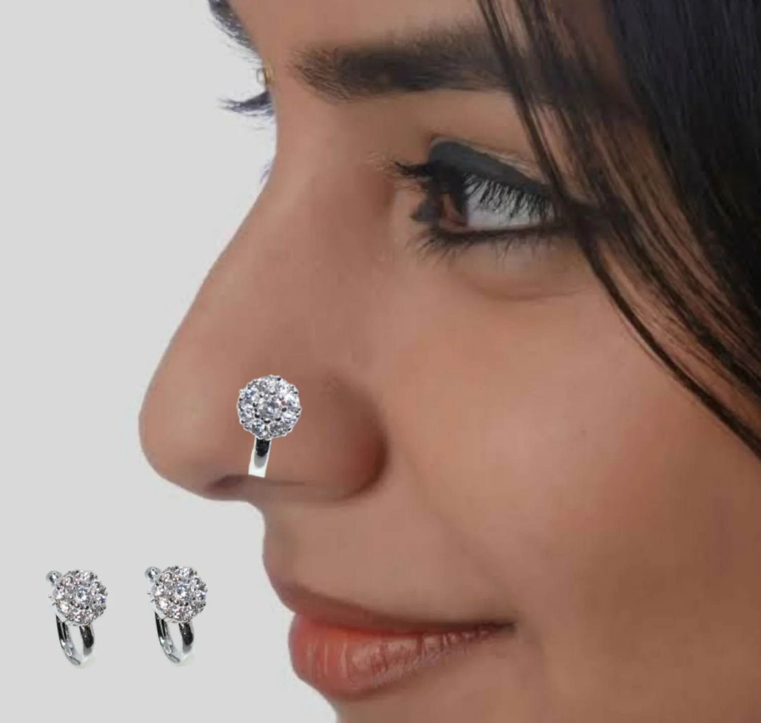 Elevate your glow without the need for a piercing. This stunning 2-in-1 jewelry piece features a brilliant floral cluster of premium cubic zirconia stones set in a high-quality silver-plated finish. Designed with a comfortable clip-on mechanism, it offers the perfect fit for everyone—whether you want to rock a stylish nose stud (nath) or a pair of elegant mini hoops.