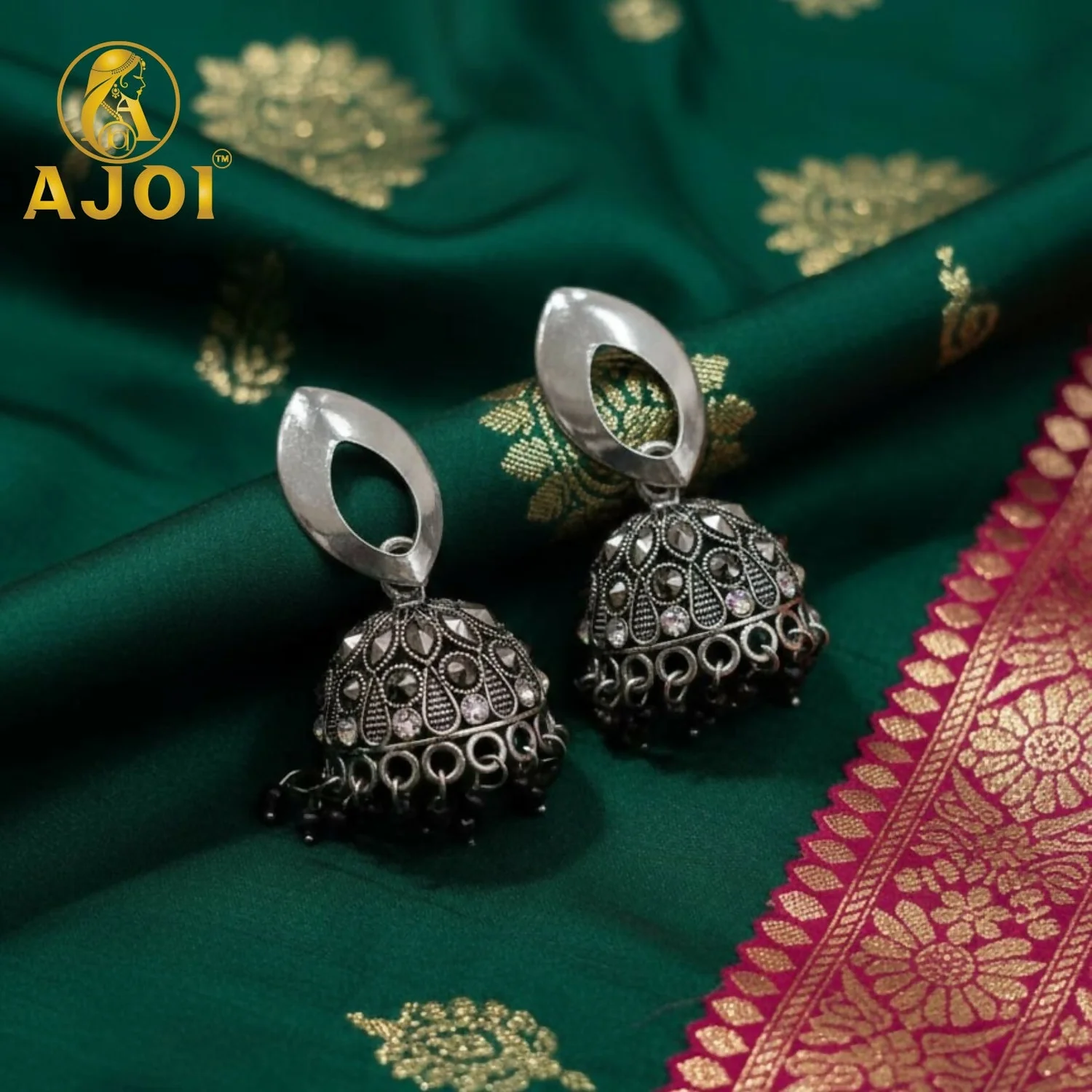 The oxidized silver finish gives a bold vintage appeal, while the delicate hanging bead accents enhance movement and grace. The detailed craftsmanship reflects traditional artistry blended with modern sophistication, making these earrings perfect for festive occasions, wedding celebrations, cultural events, and elegant everyday ethnic wear.
