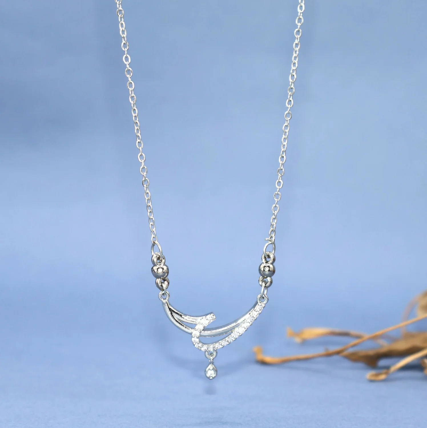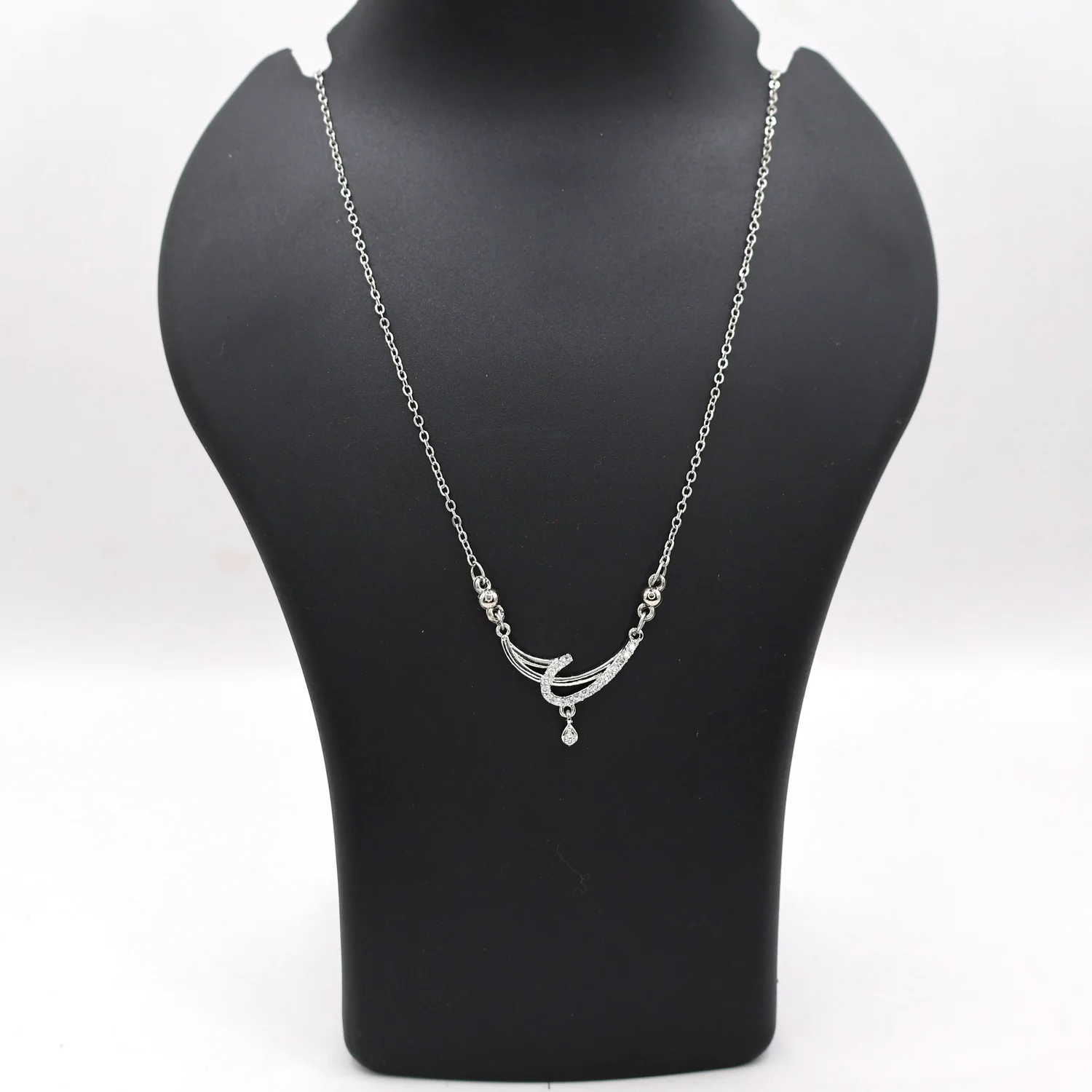 One side of the curve is beautifully paved with sparkling Cubic Zirconia (CZ) stones for brilliant shine, while the other side is highly polished. A delicate CZ teardrop stone dangles from the center, adding movement and an extra focal point of sparkle. The pendant hangs from a fine chain, accented with small, polished beads for a subtle, sophisticated touch.