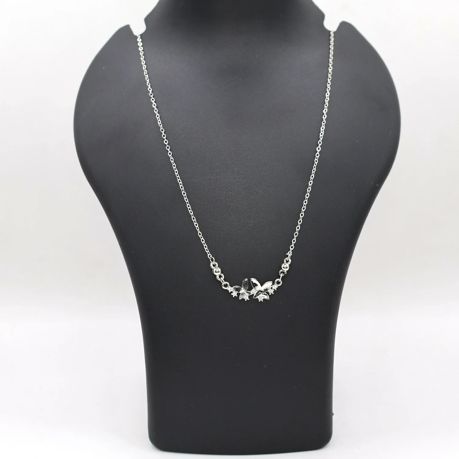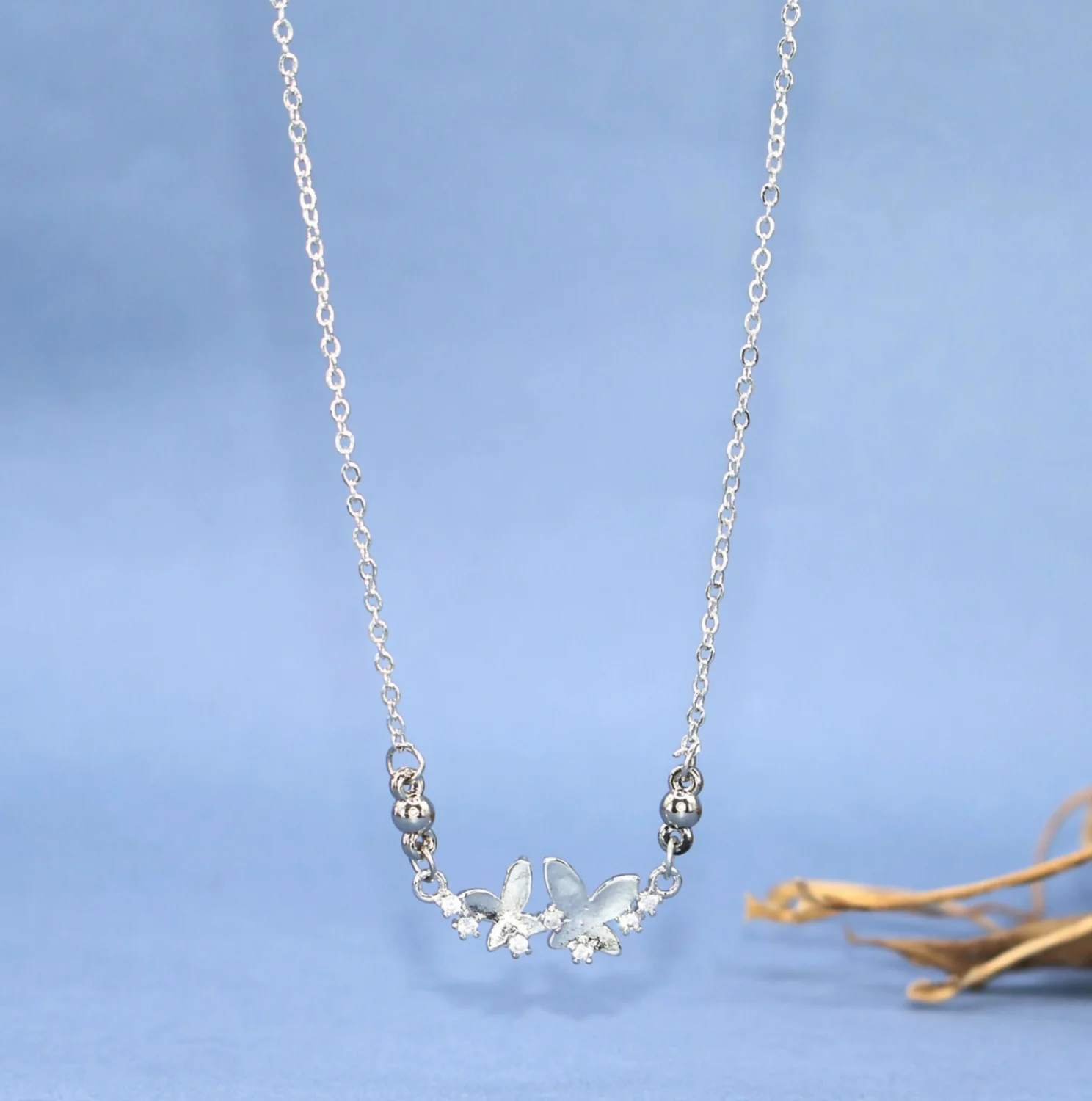 The butterflies are crafted in a gleaming silver-tone finish, with the wings of one or both subtly accented with sparkling, pave-set Cubic Zirconia (CZ) stones for a brilliant, eye-catching effect. The pendant is secured to a fine chain, beautifully accented with polished beads on either side, adding a refined touch to the design.