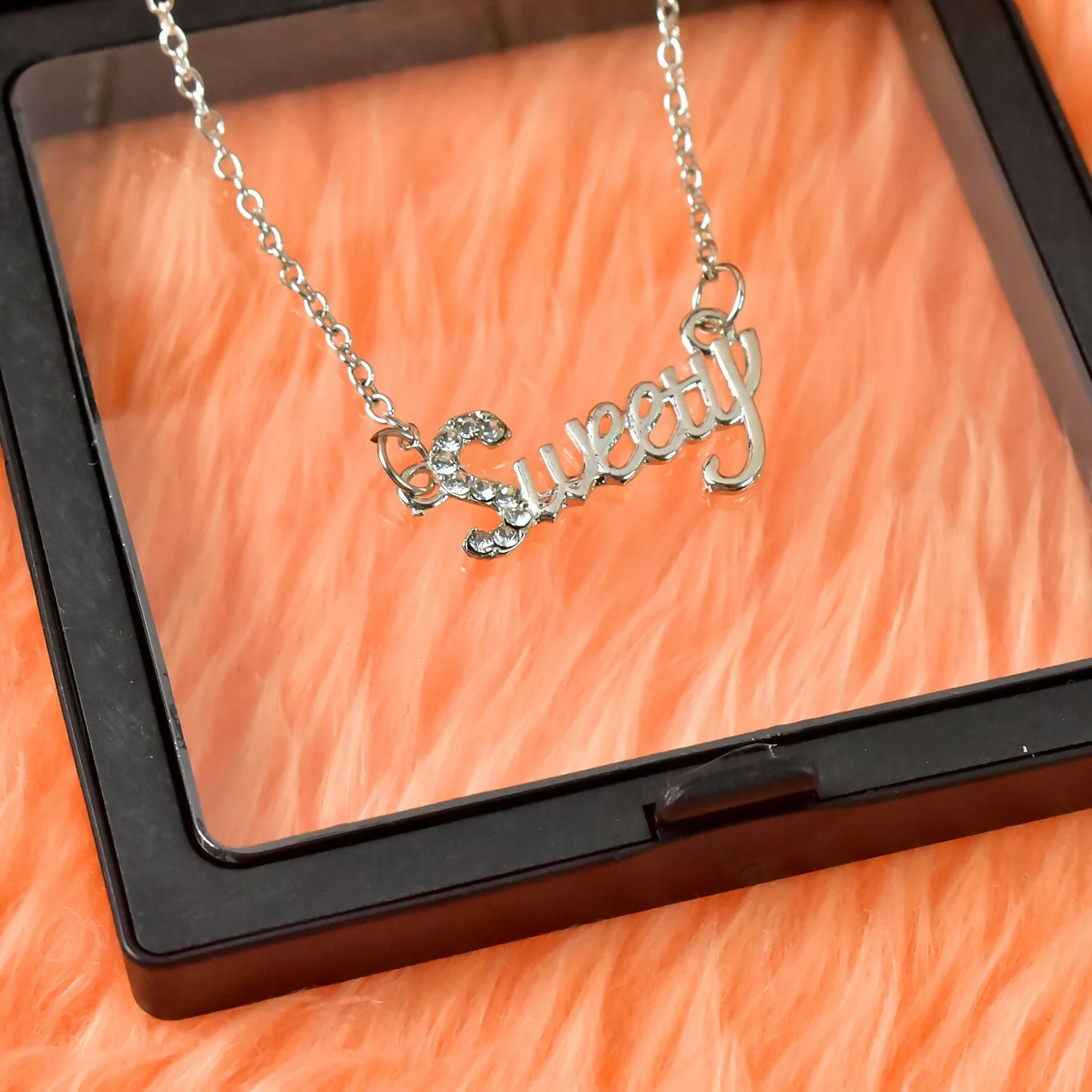 This charming pendant necklace features the word "Sweety" in a stylish script design, adding a personal and affectionate touch to any look. The sleek silver-tone finish gives it a modern yet timeless appeal, while the fine chain ensures comfortable wear. Presented in a premium transparent display case, it’s perfect for gifting or as a special keepsake.