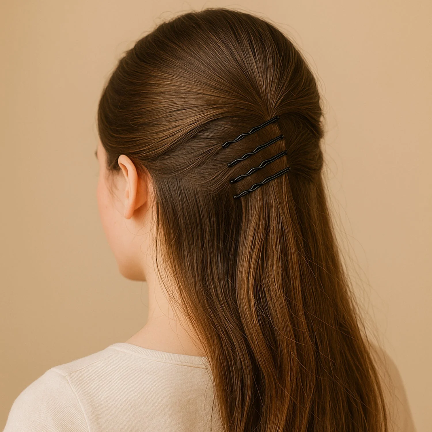 This Small Black Hair Bobby Pins Set offers a perfect combination of durability, flexibility, and strong grip for effortless hairstyling. Made with high-quality coated metal, these pins glide smoothly through hair without snagging or causing breakage. Their compact size and strong tension hold hair securely in place, making them ideal for creating buns, updos, or everyday styles. Whether for professional salon use or daily wear, these bobby pins are a must-have accessory for maintaining neat, stylish hair all day long. The smooth rounded tips ensure gentle handling, while the matte black finish blends seamlessly with all hair colors.