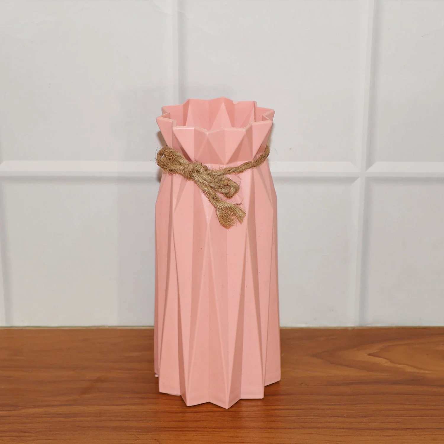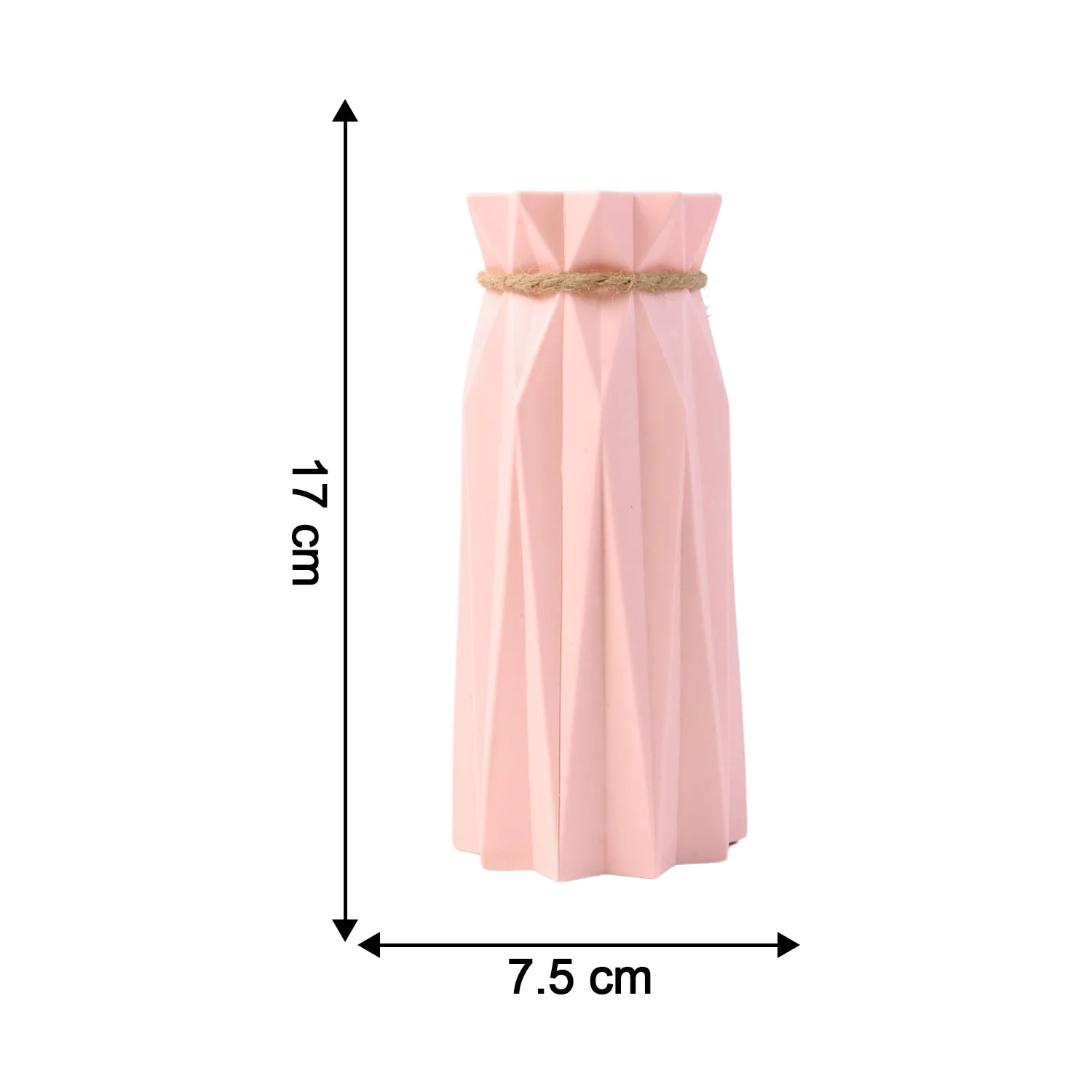 This Small Decorative Flower Vase brings a perfect blend of simplicity and modern elegance to your home or workspace. Crafted from durable and lightweight plastic, it features a stylish geometric design with a soft matte finish and a rustic rope bow accent, adding charm and sophistication to any space. Its compact size makes it ideal for tabletops, desks, or shelves, while the versatile design complements both artificial and fresh flowers. Whether used as a decorative centerpiece, a gift item, or an accent piece in your décor, this vase instantly uplifts the ambiance of any room with its graceful, contemporary look.