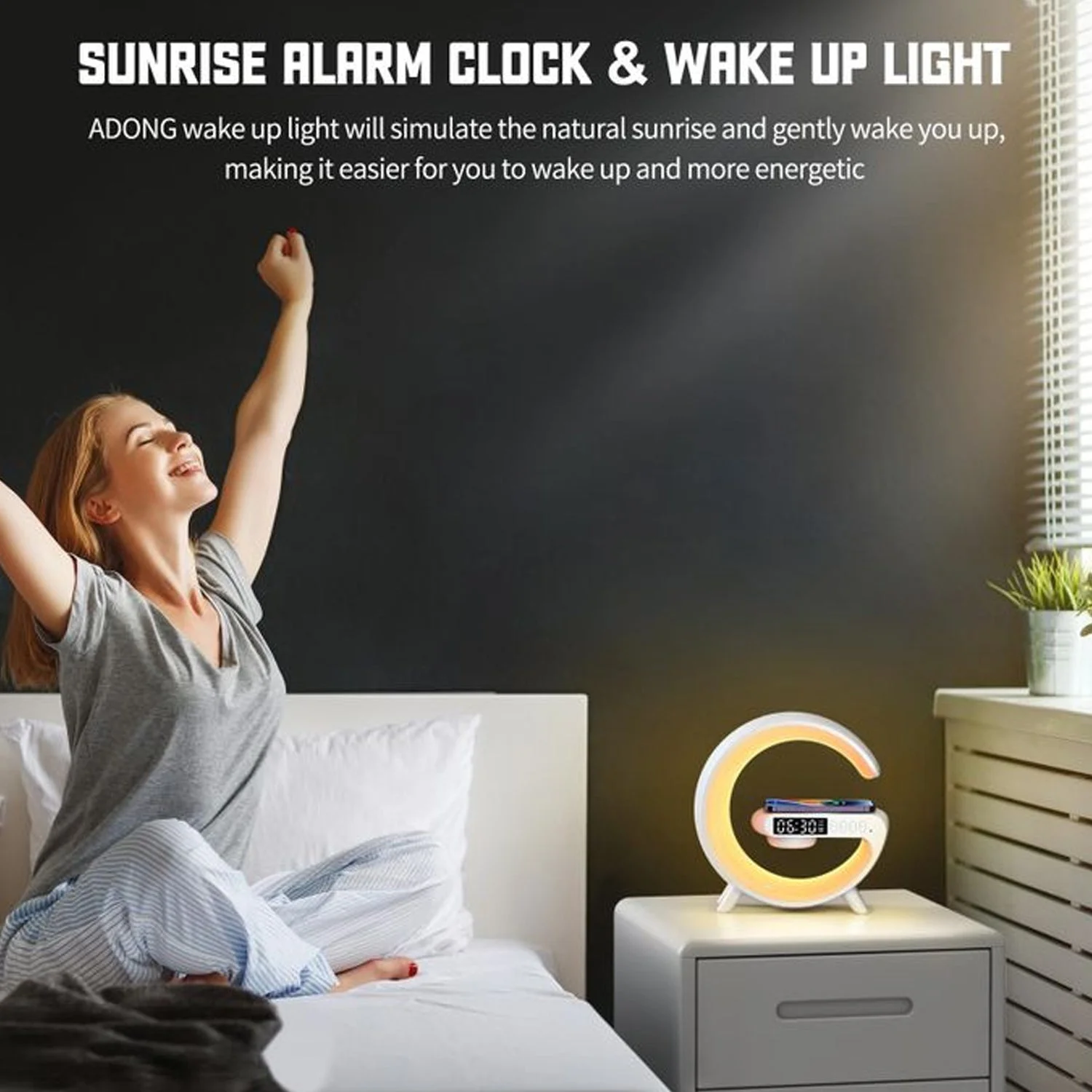 Smart Alarm Clock with G-Shape RGB Light Bluetooth Speaker, Wireless Charging for Bedroom, Living Room, and Game Room (1 Pc)