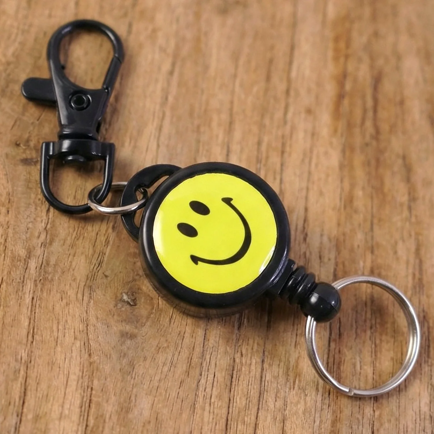 smiley face retractable keychain, heavy-duty clip key holder, steel key ring keychain, pull-out reel keychain, office ID card holder, belt loop key holder, cute emoji keychain, daily carry retractable keychain, retractable key reel, portable keychain for keys, key holder with clip, fun smiley face keychain, durable retractable keychain, multi-purpose keychain accessory